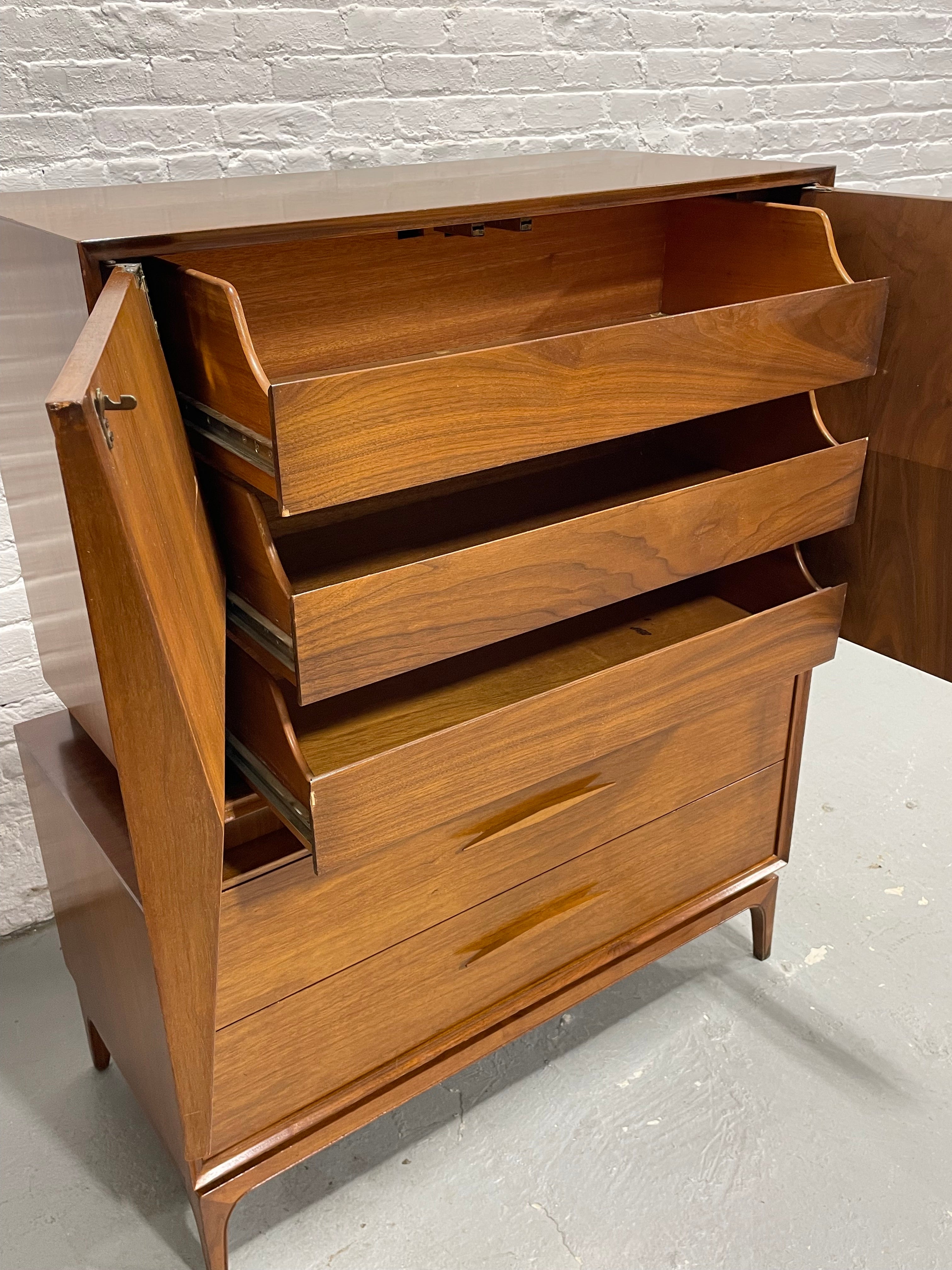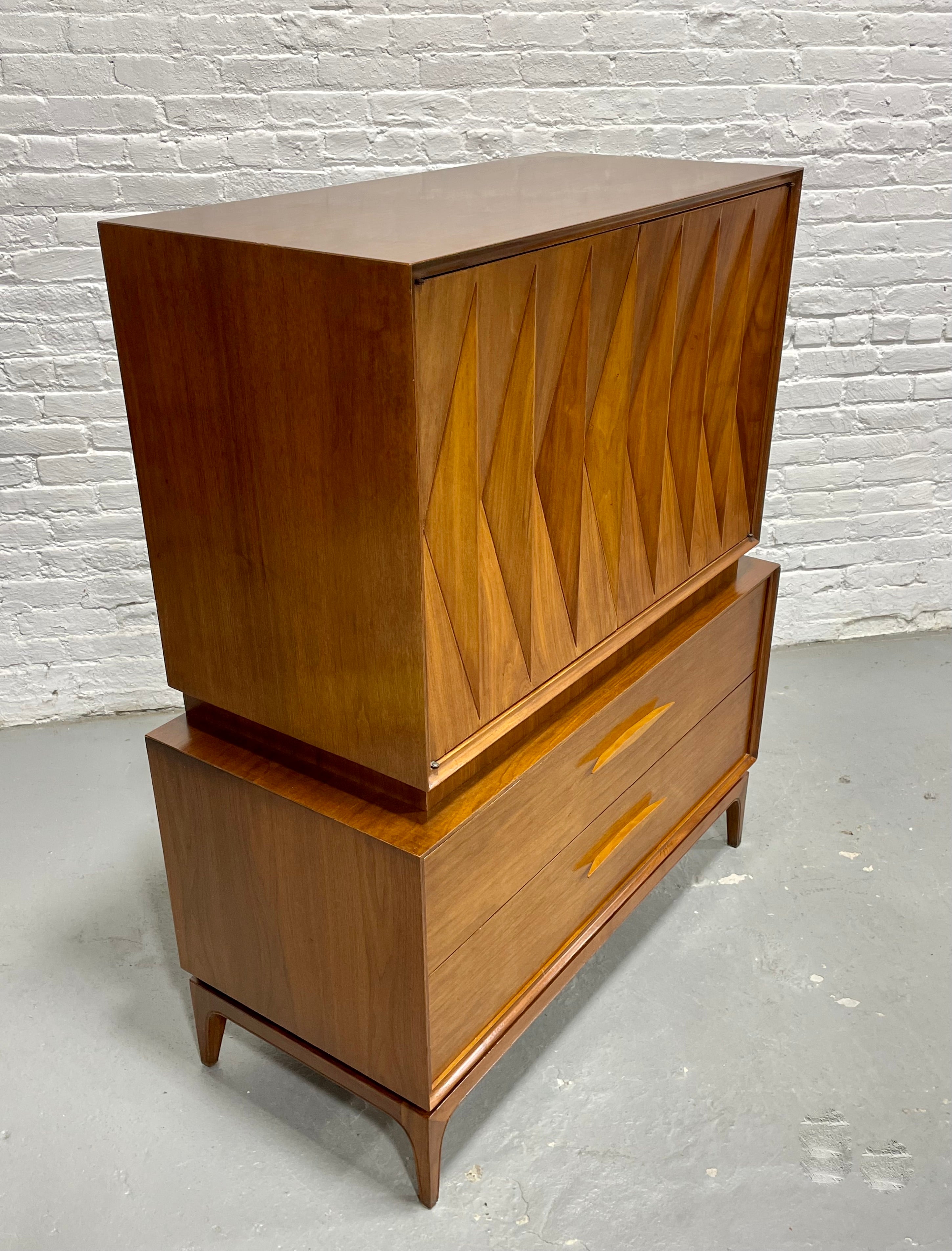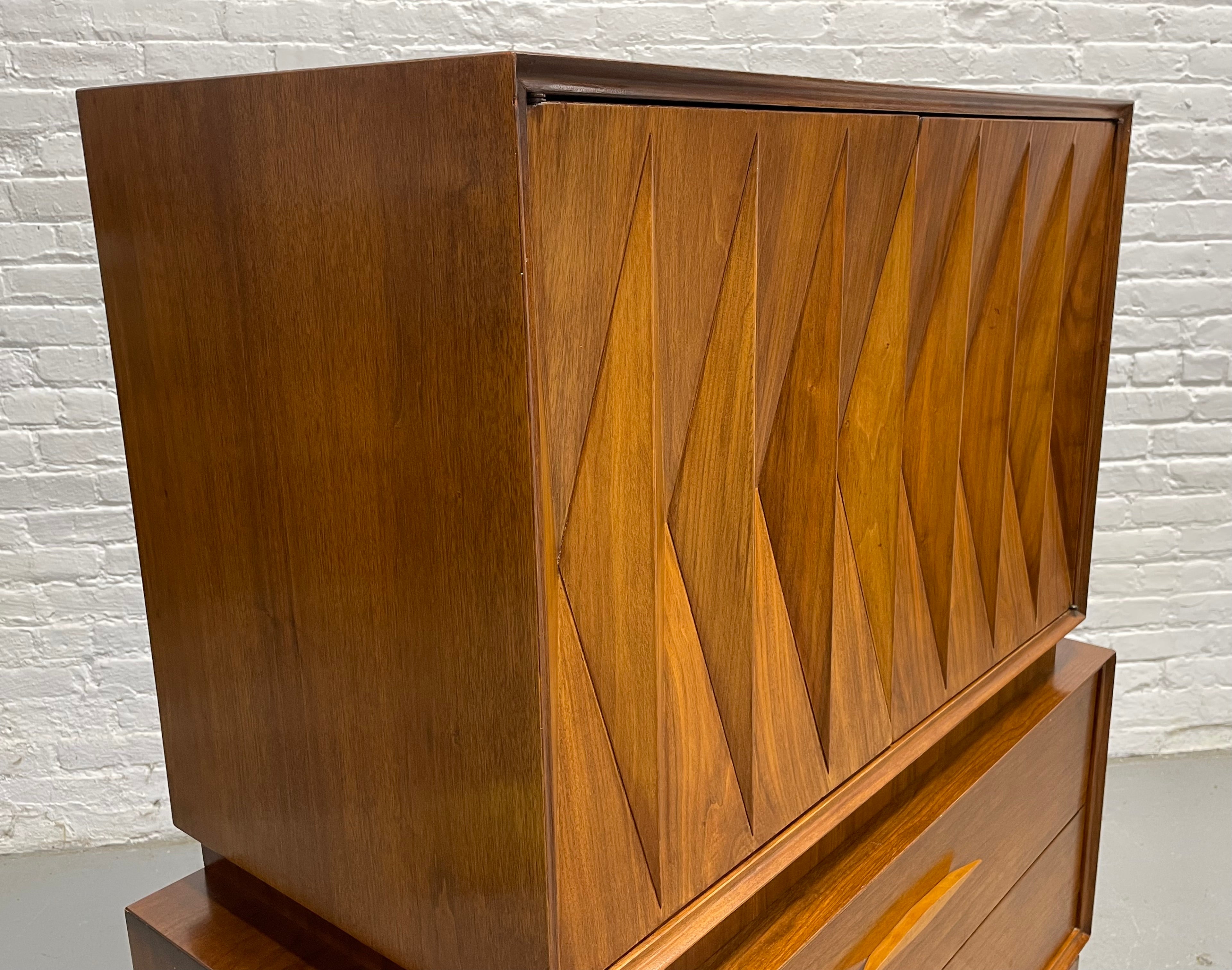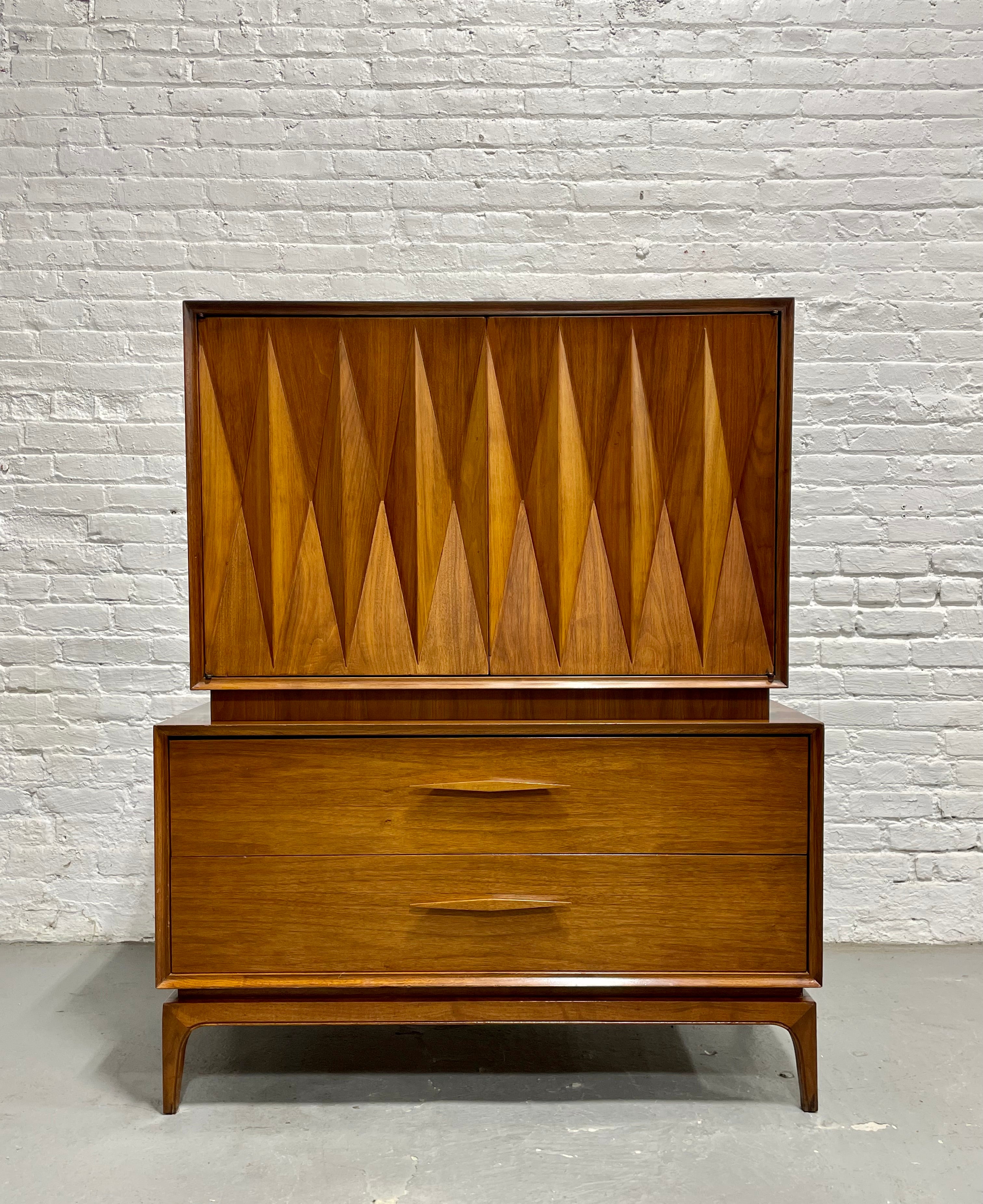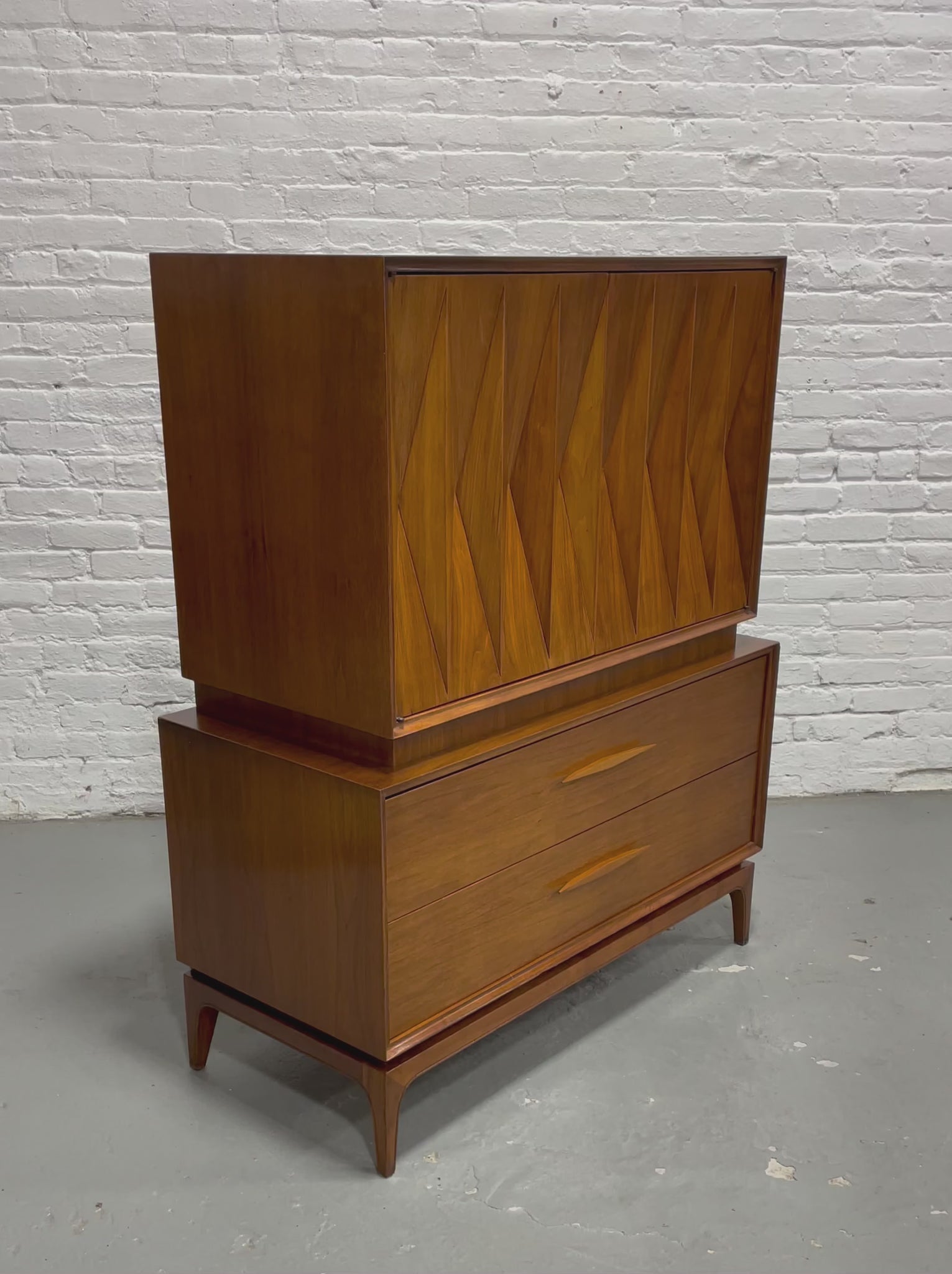 Truly incredible and one of a kind Mid Century Modern "Diamond" Dresser with a seemingly impossible sculpted "diamond" design to the to the upper cabinet. The dresser doesn't disappoint with storage space either - behind the push to open upper doors are three deep and spacious drawers plus two larger drawers below, all of which run smoothly on metal glides. Lovely vintage condition and thoroughly cleaned and oiled and ready for another lifetime of use. Matching nightstands and long dresser available separately. Can you imagine walking into your bedroom and seeing this beauty every day?