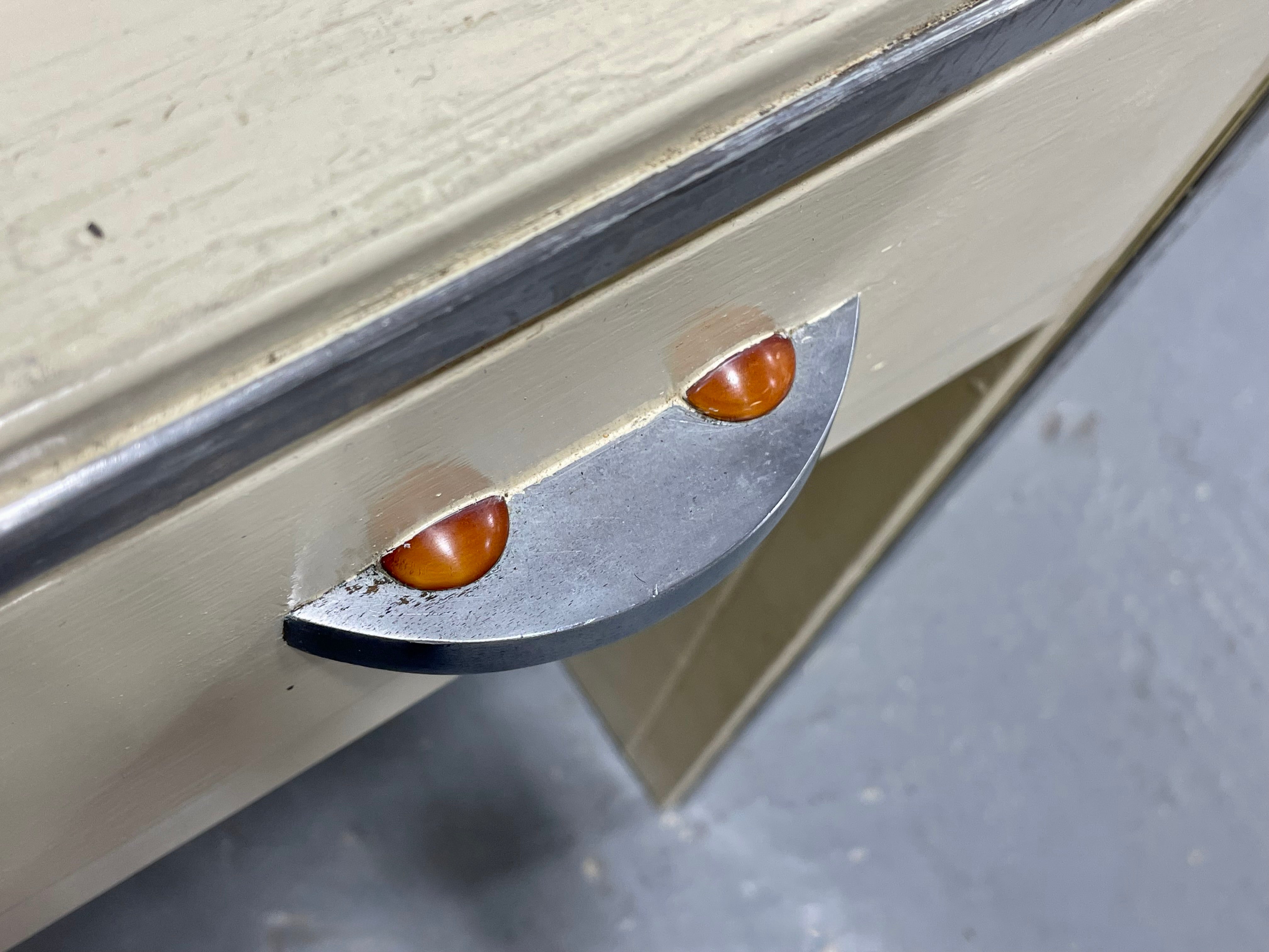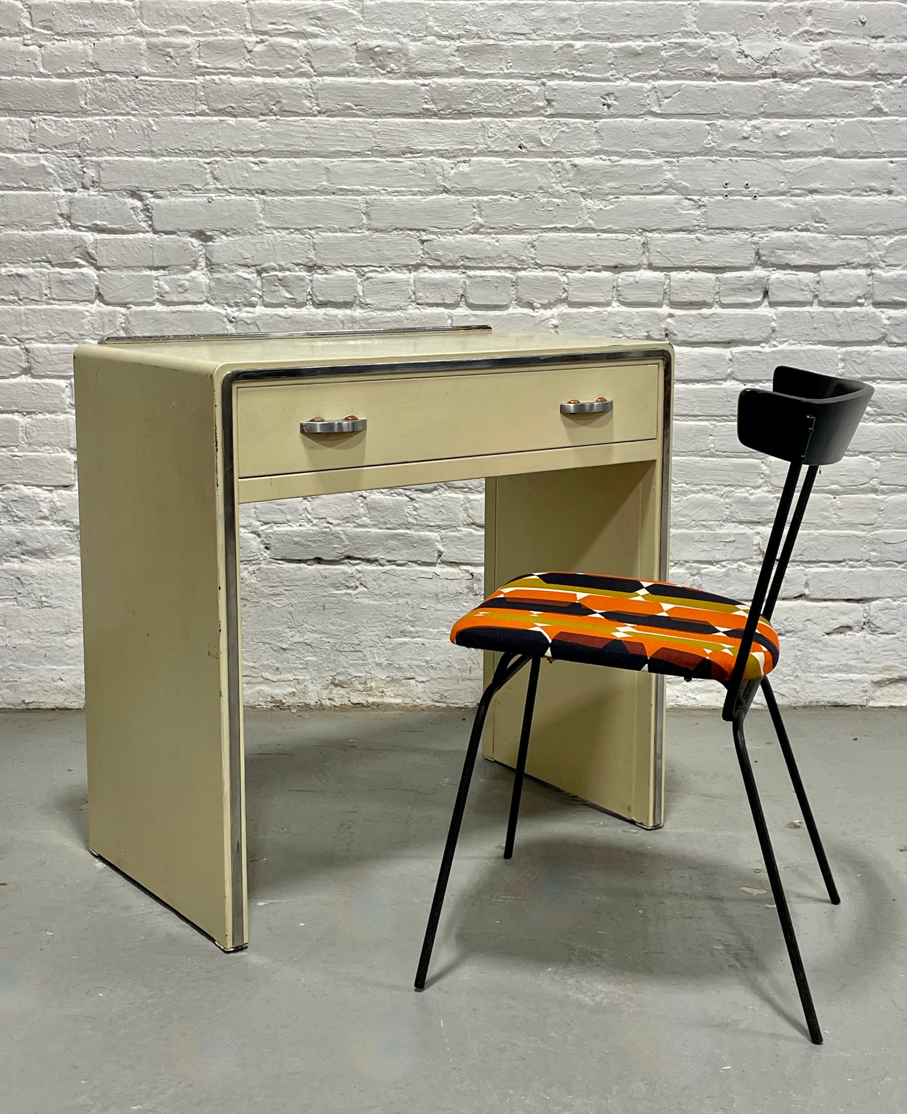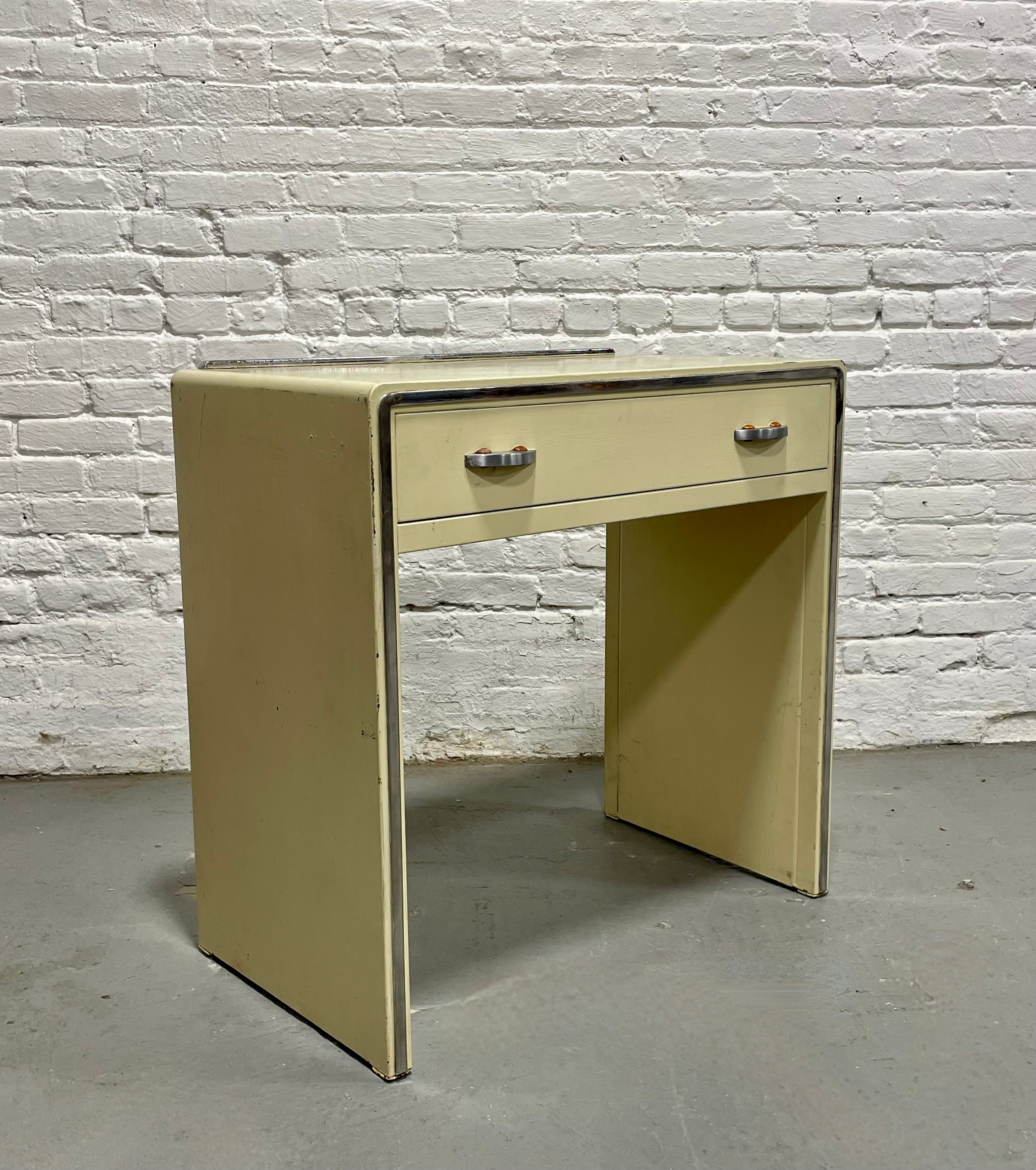 Mid Century Modern with an art deco vibe, this desk by Simmons Furniture Company, c. 1950’s embodies the Machine Age aesthetic of the period. Loads of design details - robust steel construction in a smooth pale cream enamel finish, polished aluminum trim, and curved “half-moon” drawer pulls with amber-colored bakelite buttons. The desk features a single full width drawer over an open knee space, with side panels that extend the full depth, giving a monolithic, architectural presence. Nice vintage condition with wear from age and use, including soiling to interior of drawer. The drawer works smoothly and retains the original manufacturer’s badge. Ideal as a compact workspace for a home office or as a console table in an entryway. Chair is not included.