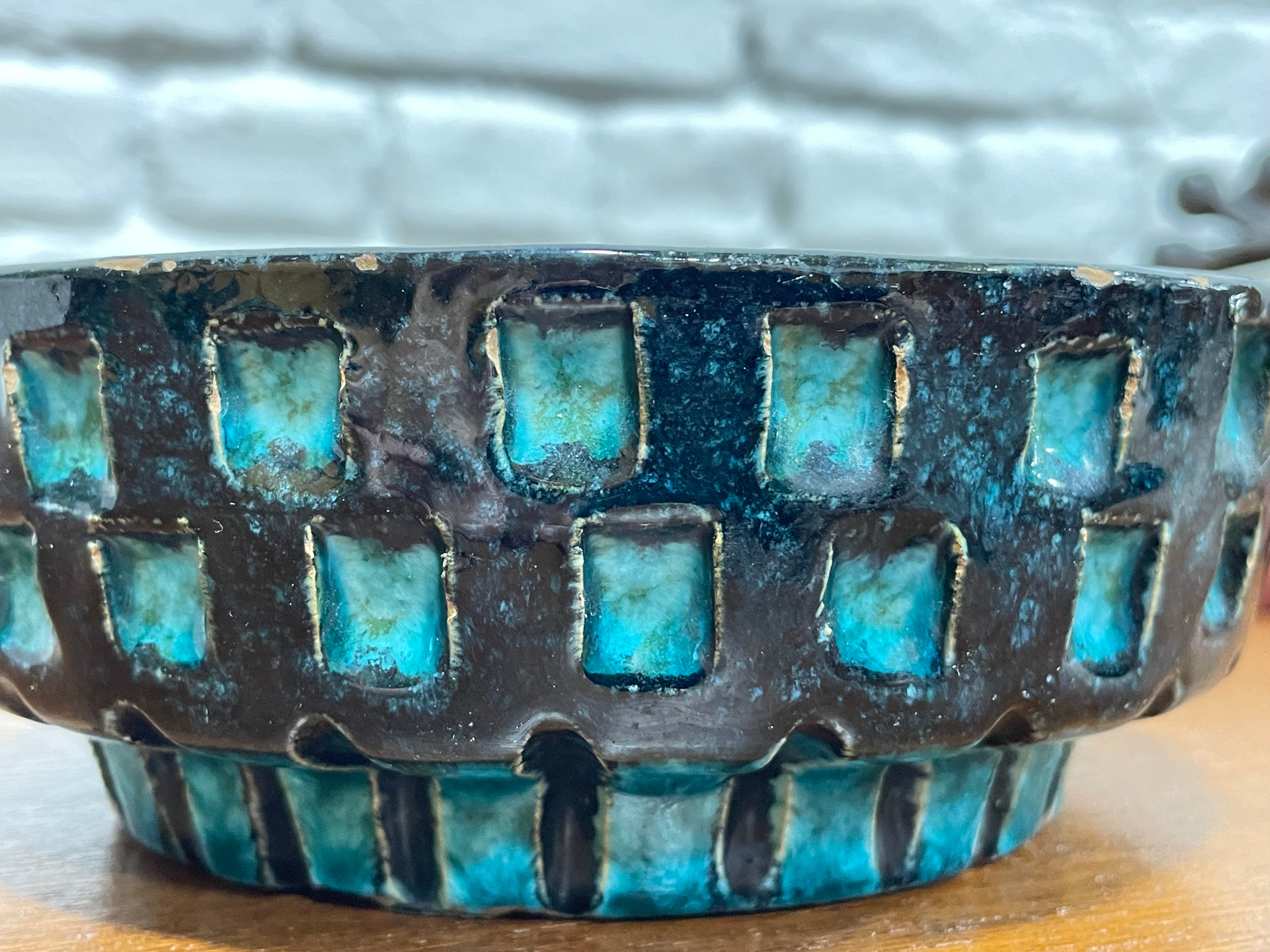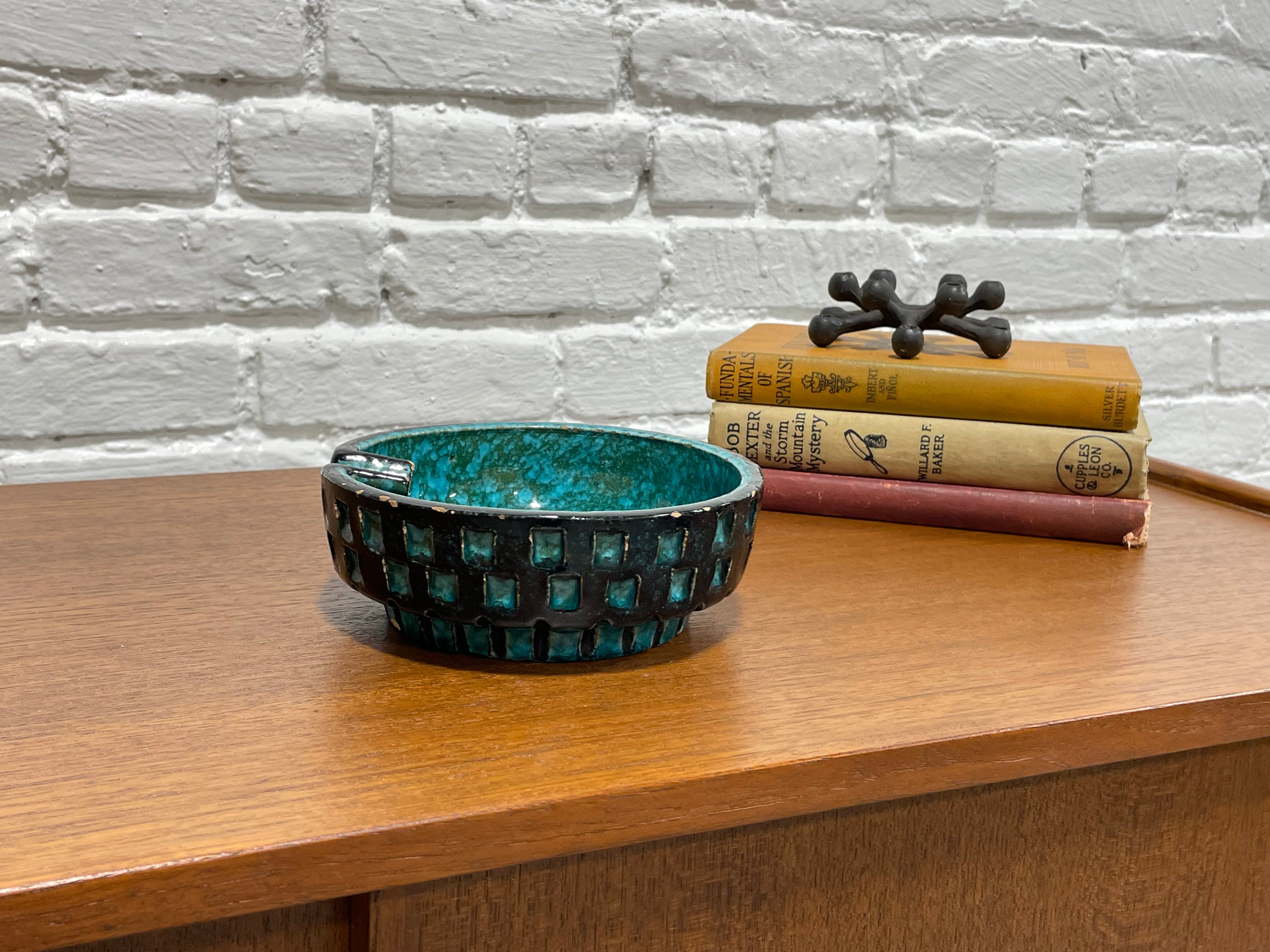 Vintage Italian Ceramic Bowl / Ashtray by Bitossi from the Mid Century Rimini Blu era, featuring Aldo Londi's signature carved geometric pattern and vibrant turquoise glaze. The textured squares, deep aqua interior, and dark manganese exterior highlight the classic Bitossi style. A striking Italian decorative piece perfect for use as a catch-all or display accent. Nice condition with some teeny chips, as pictured. Ships via FREE via UPS Ground.