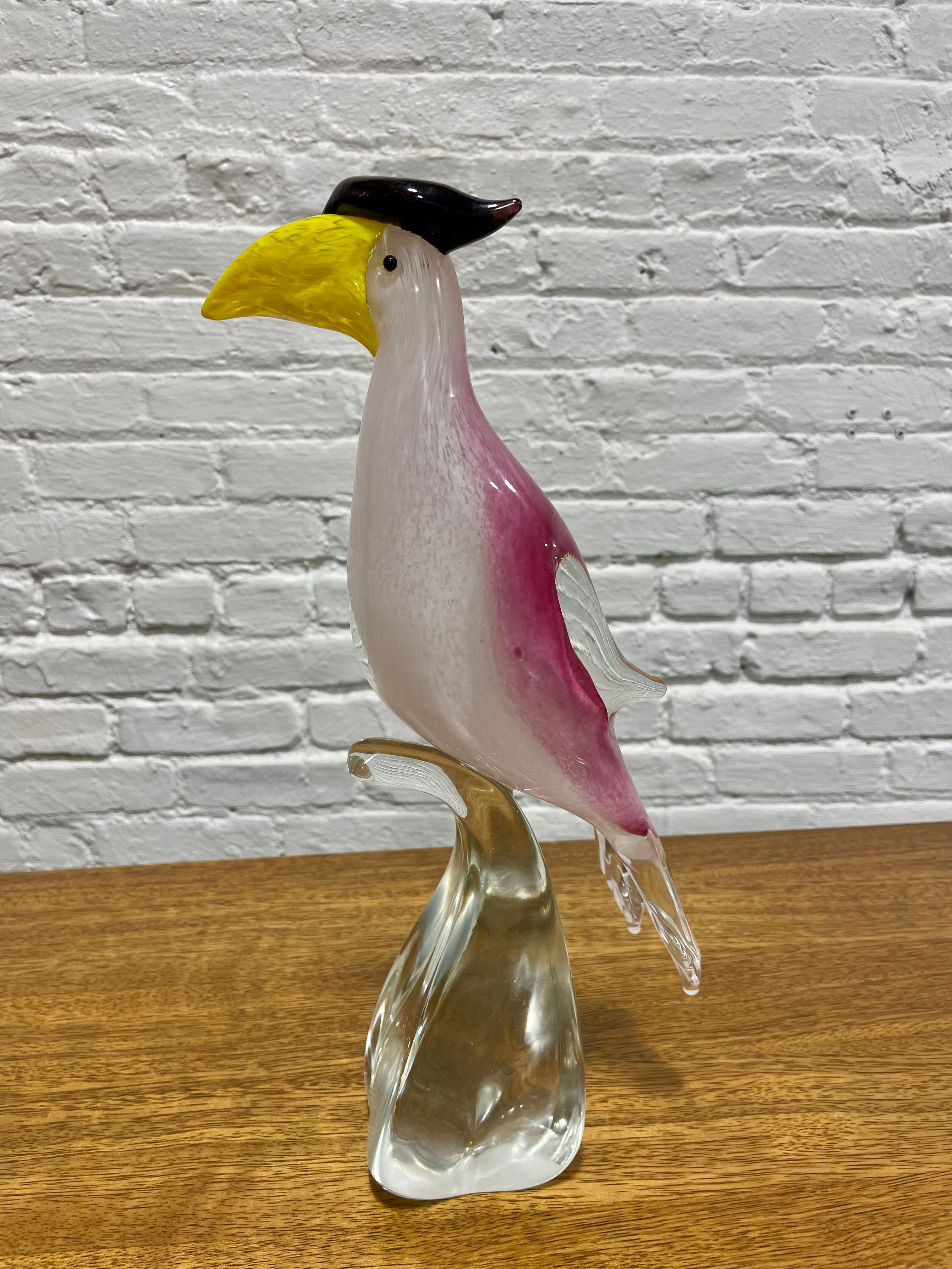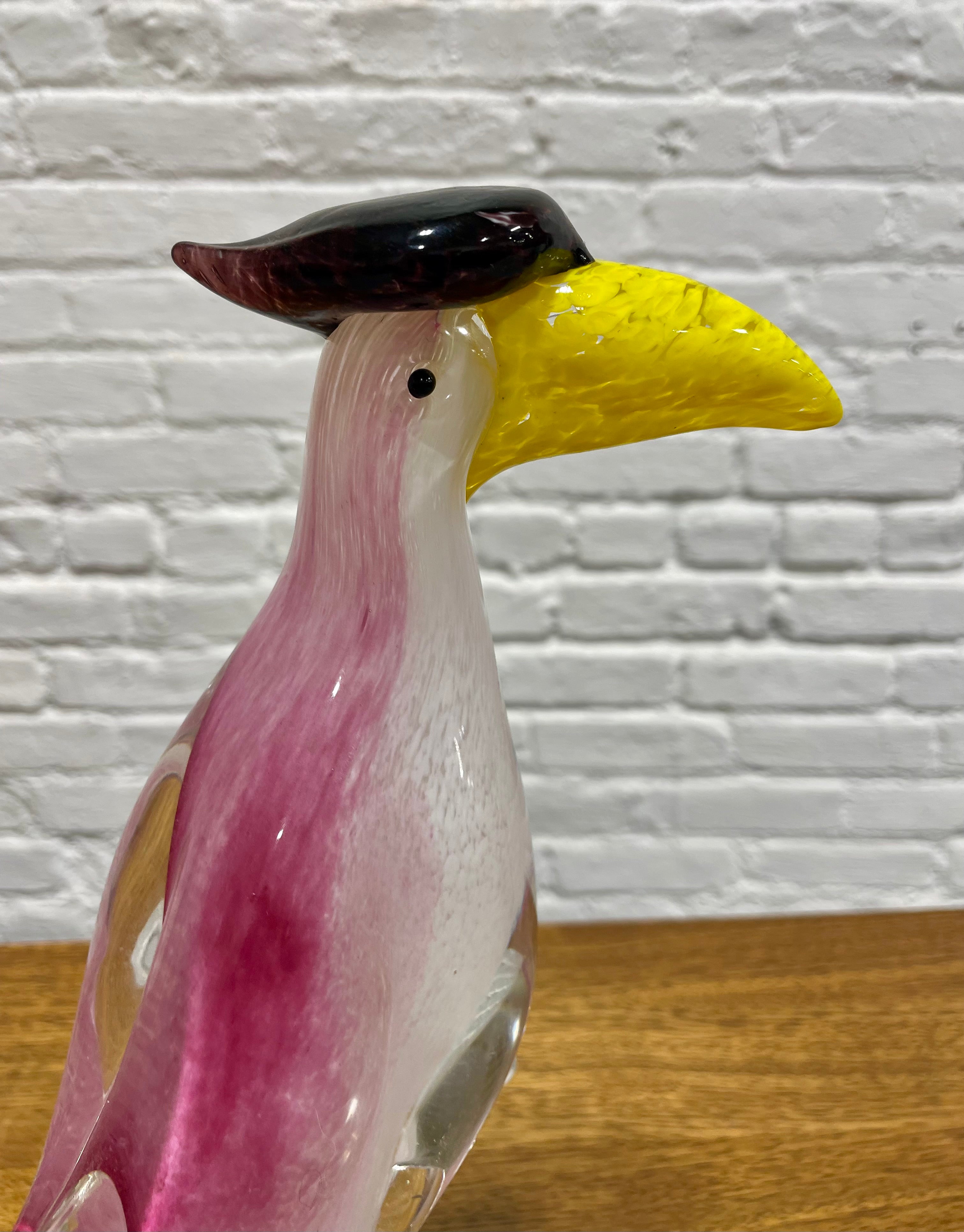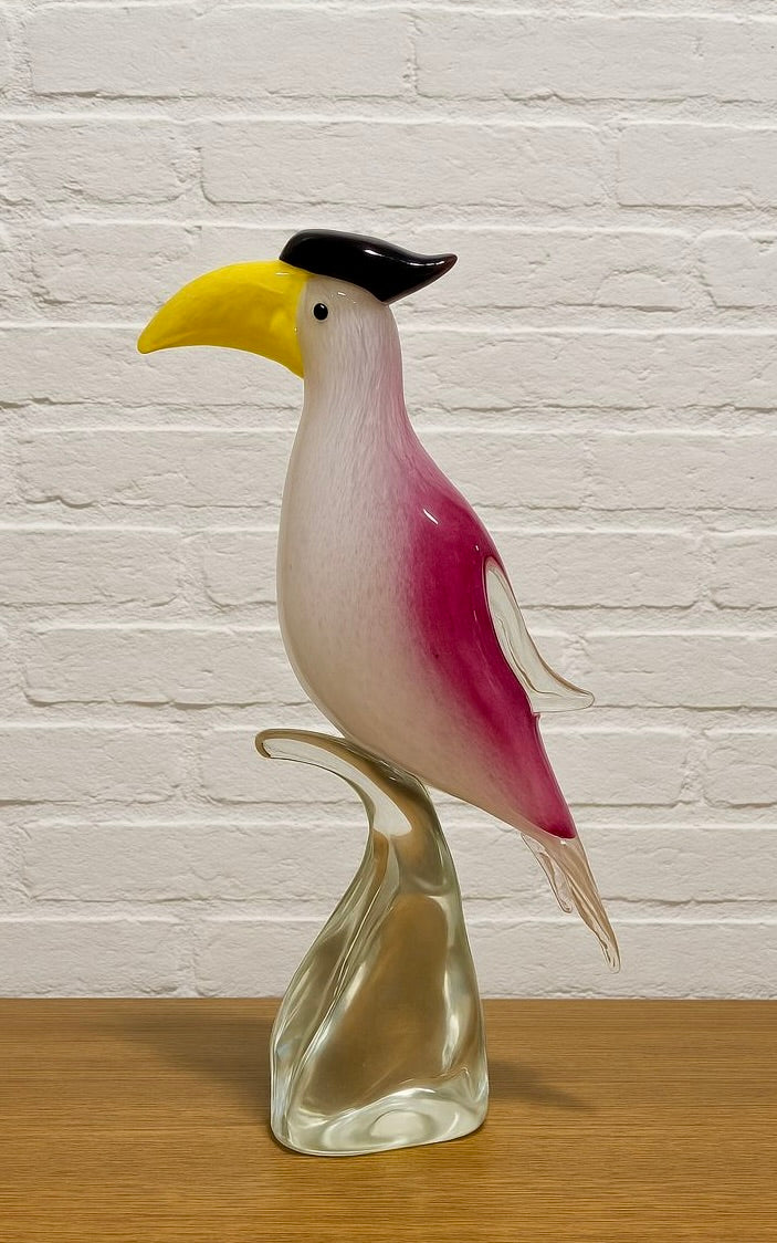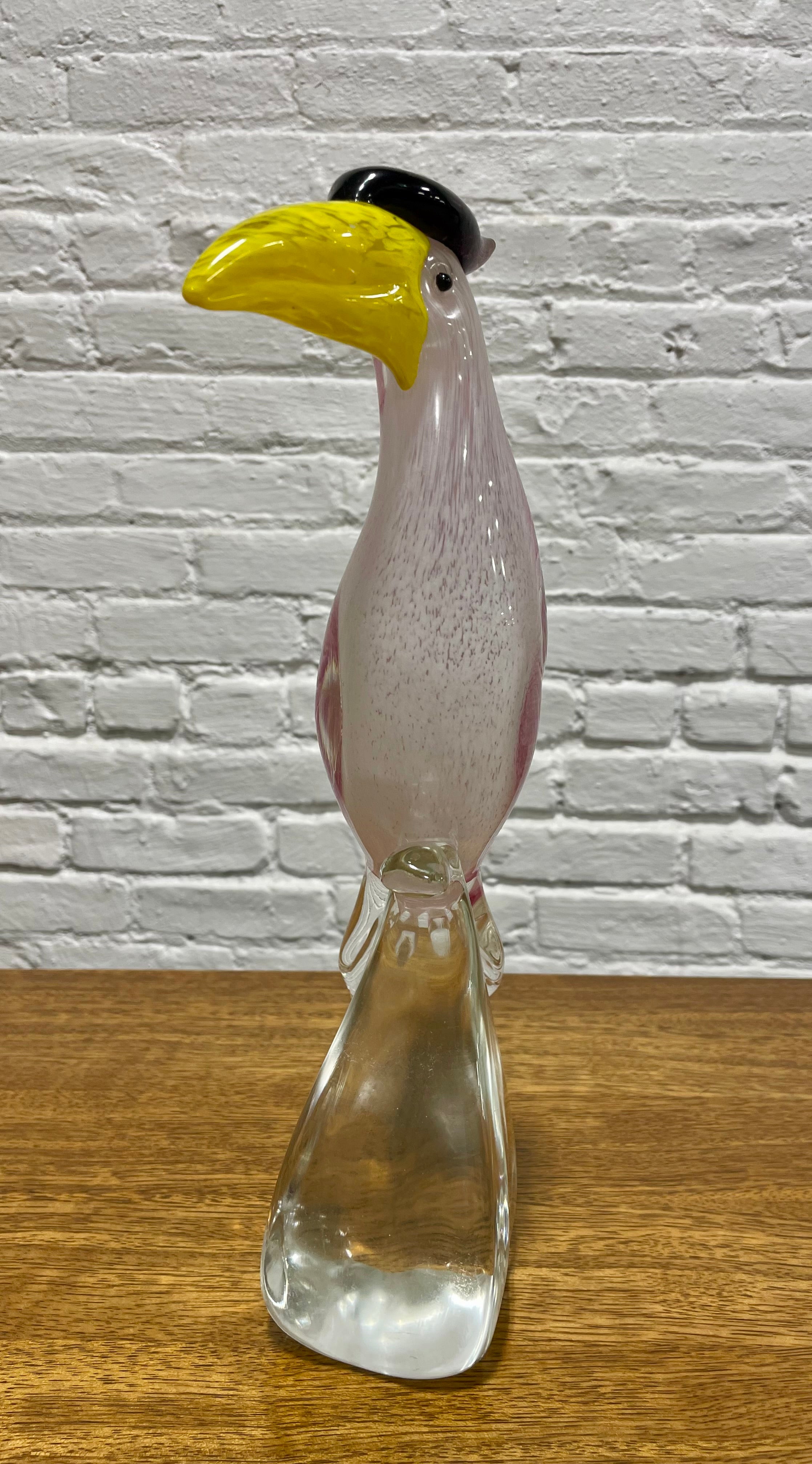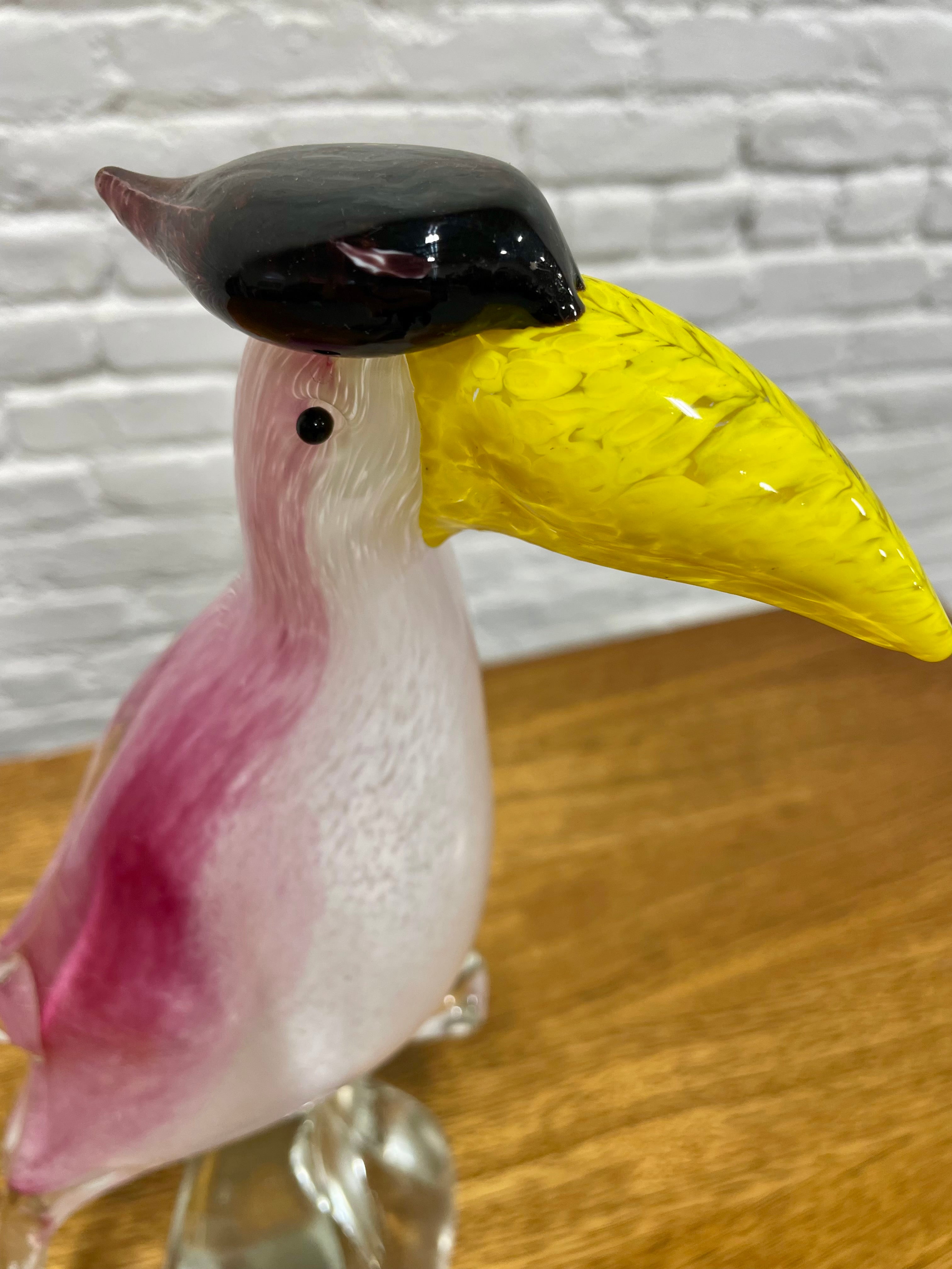 Hand blown Murano glass toucan sculpture, a refined example of traditional Italian glassmaking. Crafted in rich tones of rose pink and soft white, paired with a vibrant yellow beak and a glossy black crest, the bird stands gracefully on a sculpted clear glass base. The sculpture displays wonderfully on a bookshelf, entryway table, sideboard, or display cabinet. Every detail reflects the precision and artistry associated with high quality Murano glasswork.The sculpture displays beautifully in natural light, where its layered colors and internal patterns come alive, making it a standout centerpiece. Excellent condition with no chips or cracks.