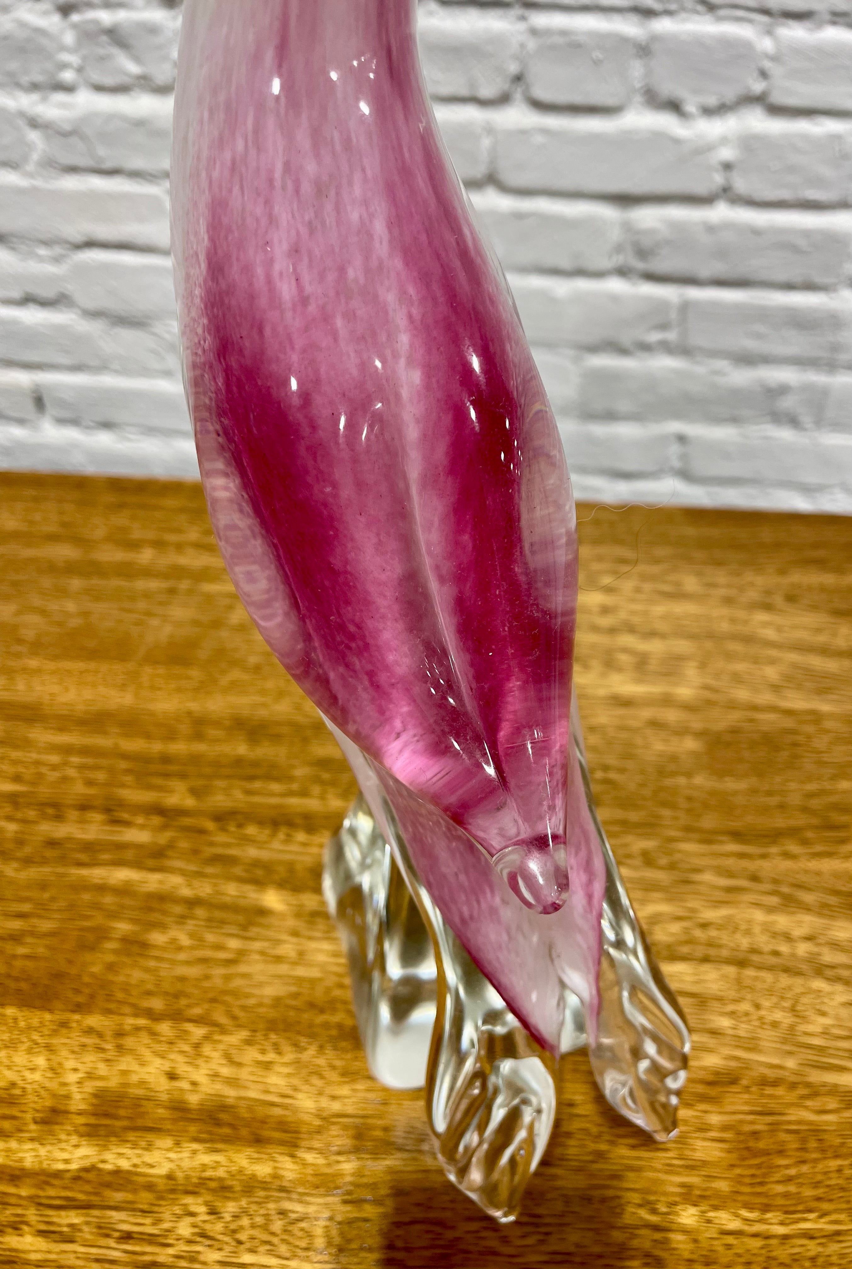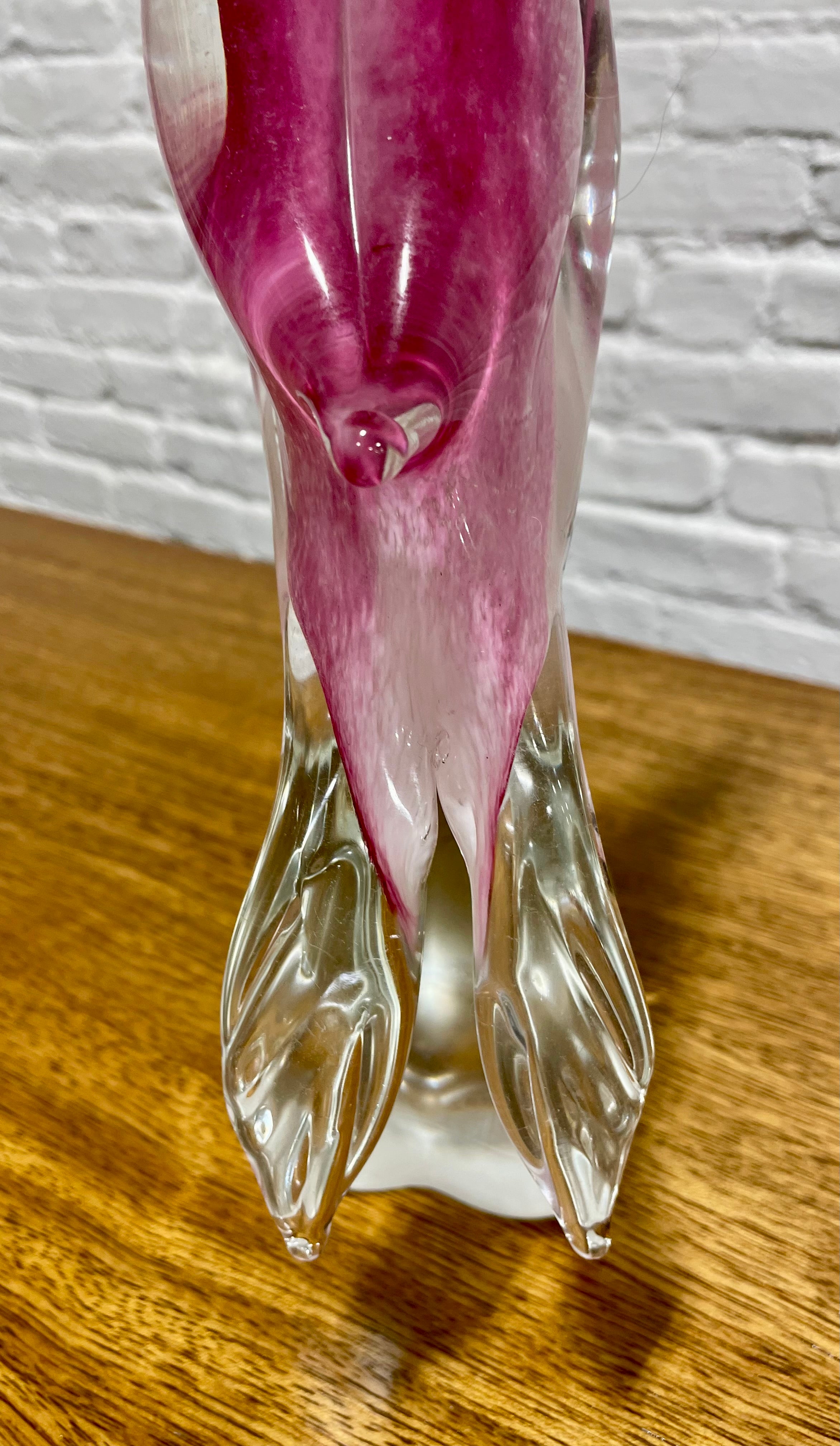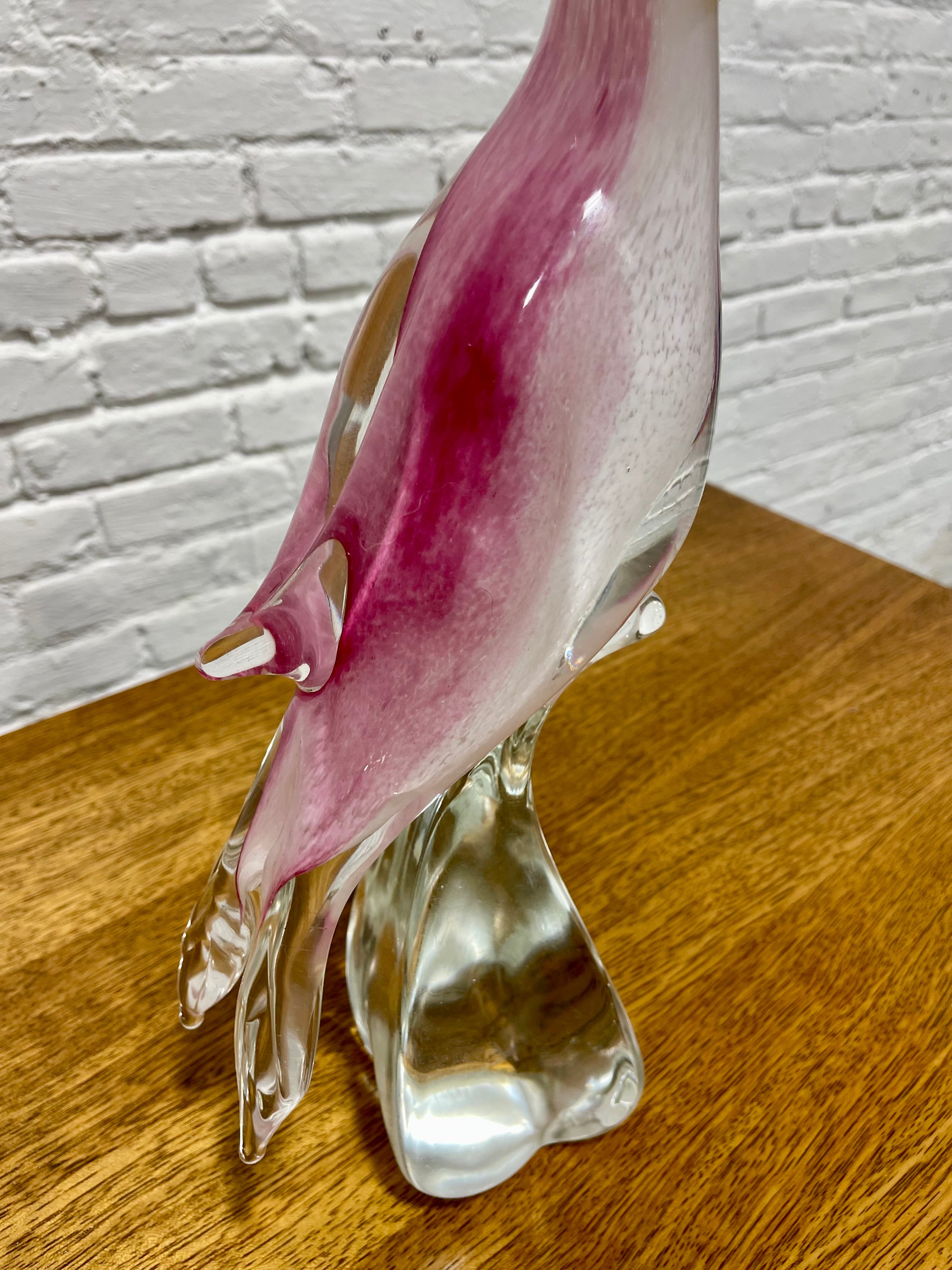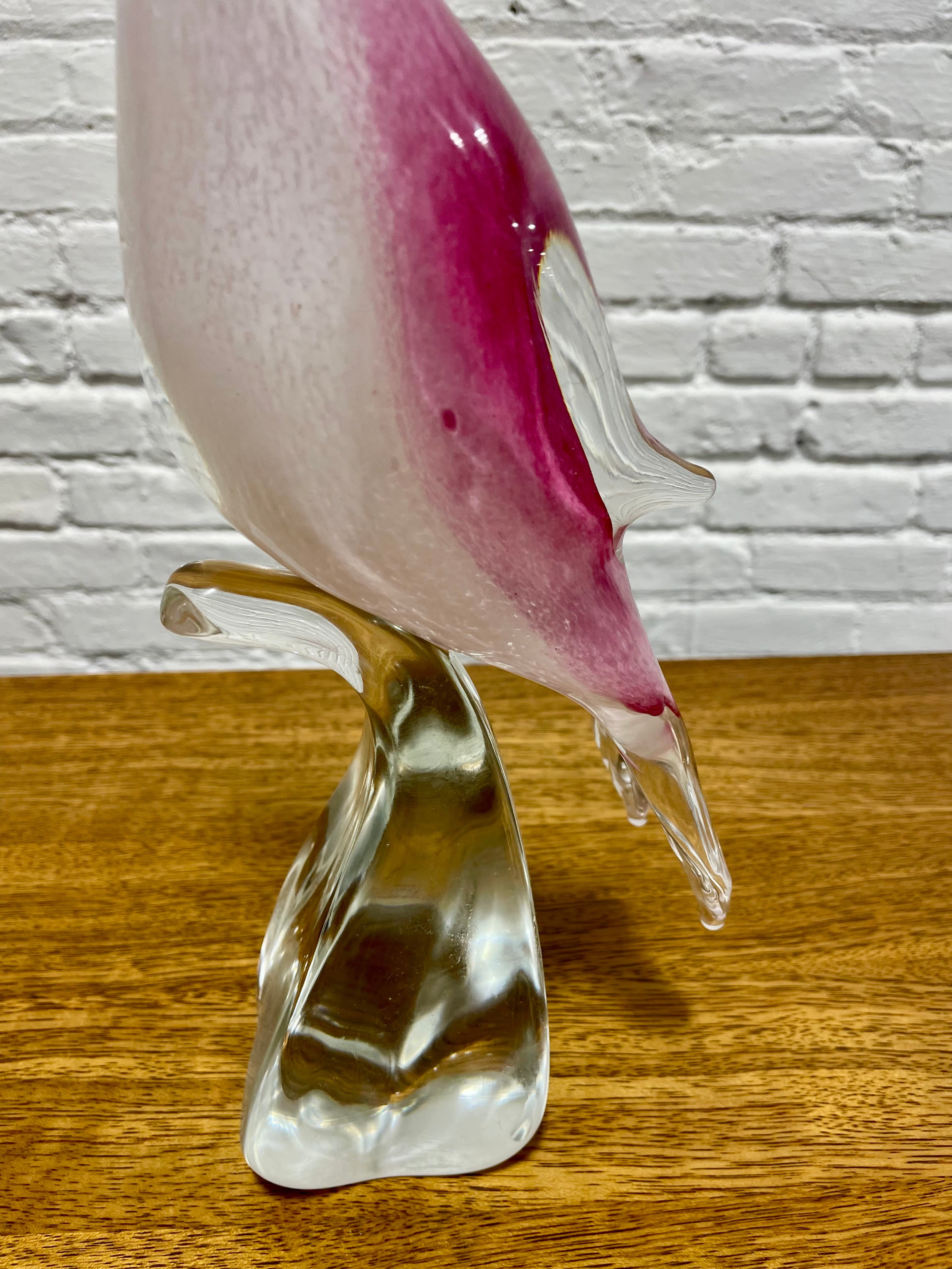 Hand blown Murano glass toucan sculpture, a refined example of traditional Italian glassmaking. Crafted in rich tones of rose pink and soft white, paired with a vibrant yellow beak and a glossy black crest, the bird stands gracefully on a sculpted clear glass base. The sculpture displays wonderfully on a bookshelf, entryway table, sideboard, or display cabinet. Every detail reflects the precision and artistry associated with high quality Murano glasswork.The sculpture displays beautifully in natural light, where its layered colors and internal patterns come alive, making it a standout centerpiece. Excellent condition with no chips or cracks.