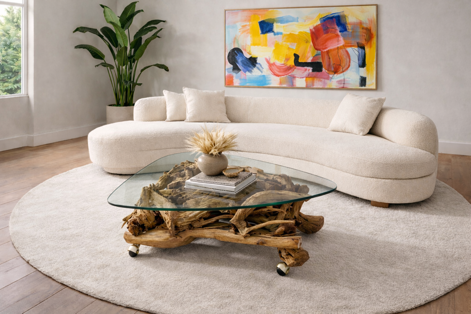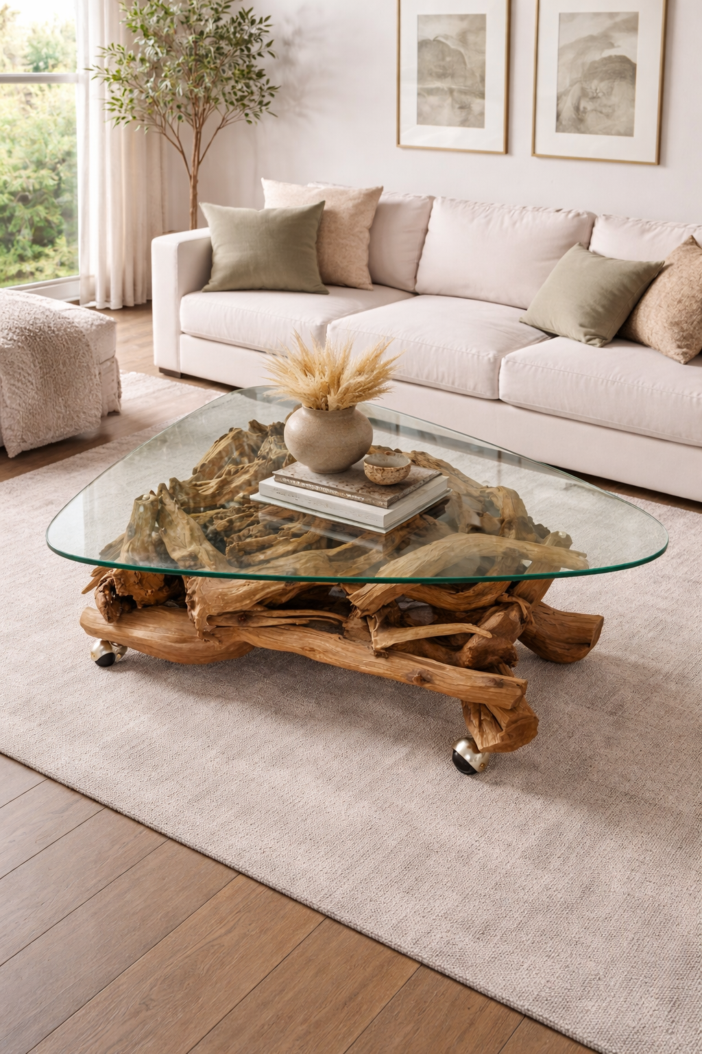 Sculptural Driftwood + Glass Coffee Table | Organic Modern Cocktail Table Castors