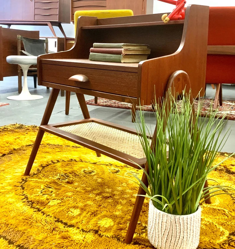 Mid Century Modern Handcrafted Teak Cabinet, perfect as an entryway cabinet, bedside cabinet or hallway console. Loads of design details including lower caned shelf, finished back and absolutely stunning legs. Nice amount of storage - single wide drawer, lower rattan shelf to display books/magazines and two tiered tabletop storage.