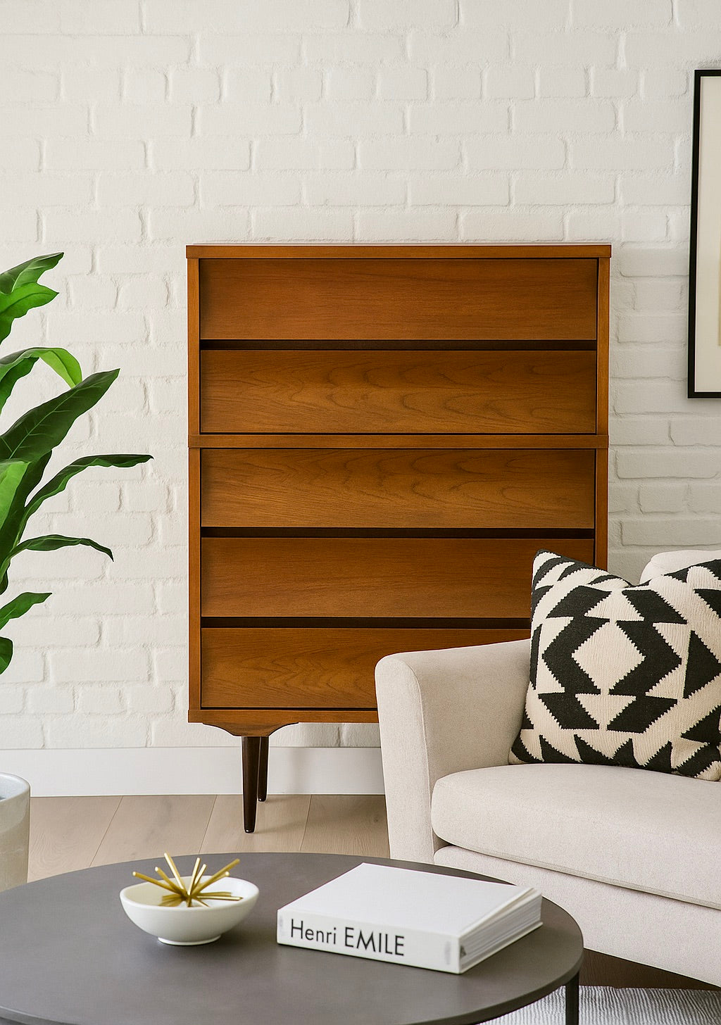 Mid Century Modern Concave Drawer front Dresser by Johnson Carper. Beautiful architectural detailing with scalloped facade. Five spacious dovetailed drawers offer plenty of storage space. Laminated woodgrain tabletop, perfect for sustaining a bit of abuse without showing wear. Nice vintage condition with some wear from age and use. Matching long dresser available separately.