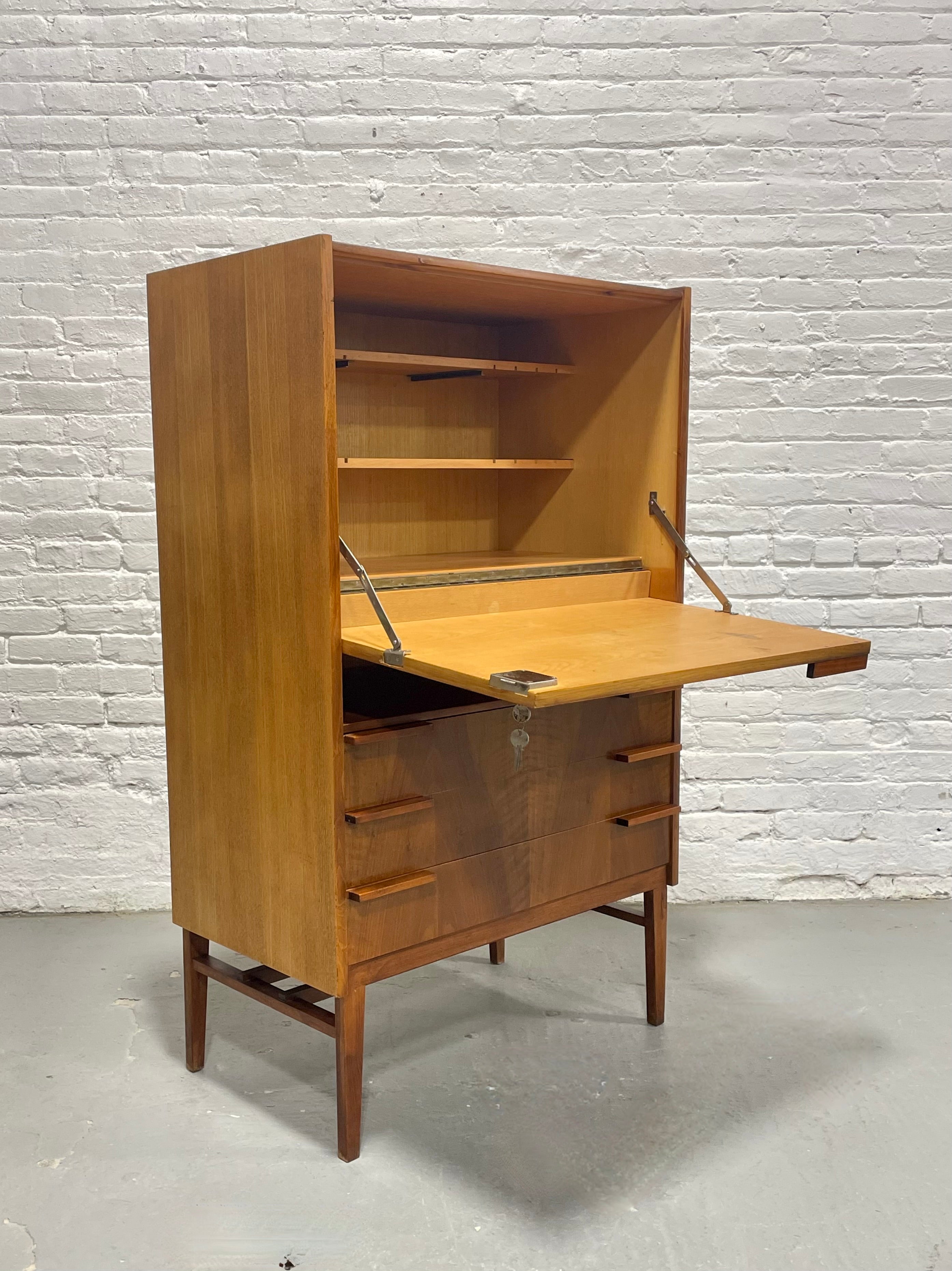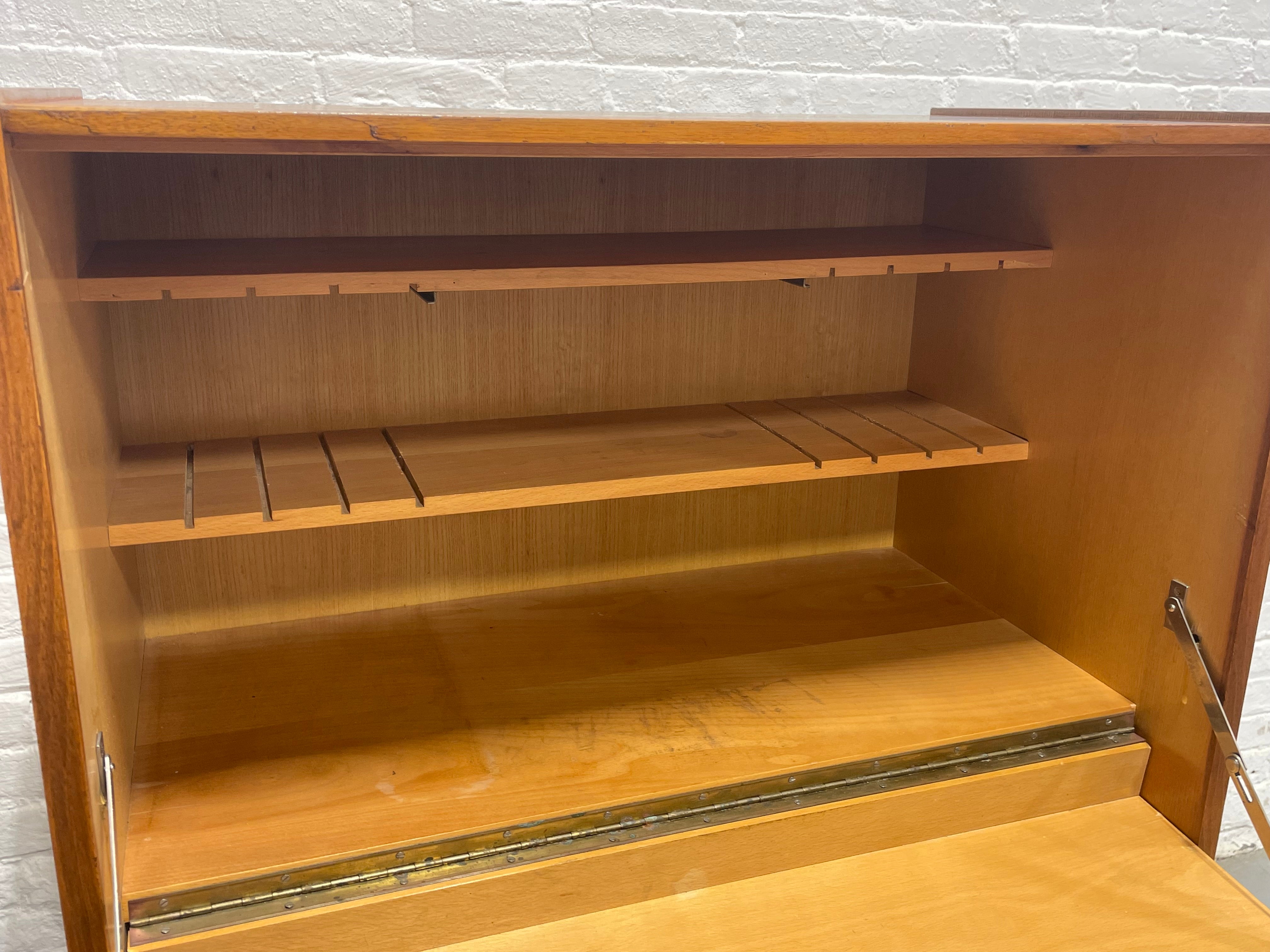 Mid Century Modern secretary desk / bar designed by František Mezuláník for the renowned Czech manufacturer UP Závody, showcasing the clean lines, refined proportions, and thoughtful functionality characteristic of the modernist Czech design movement of the era. Expertly constructed in beech with a warm finish and gorgeous wood grains, the cabinet features a distinctive drop-front tabletop that opens to reveal a spacious writing surface and an organized interior with shelving.