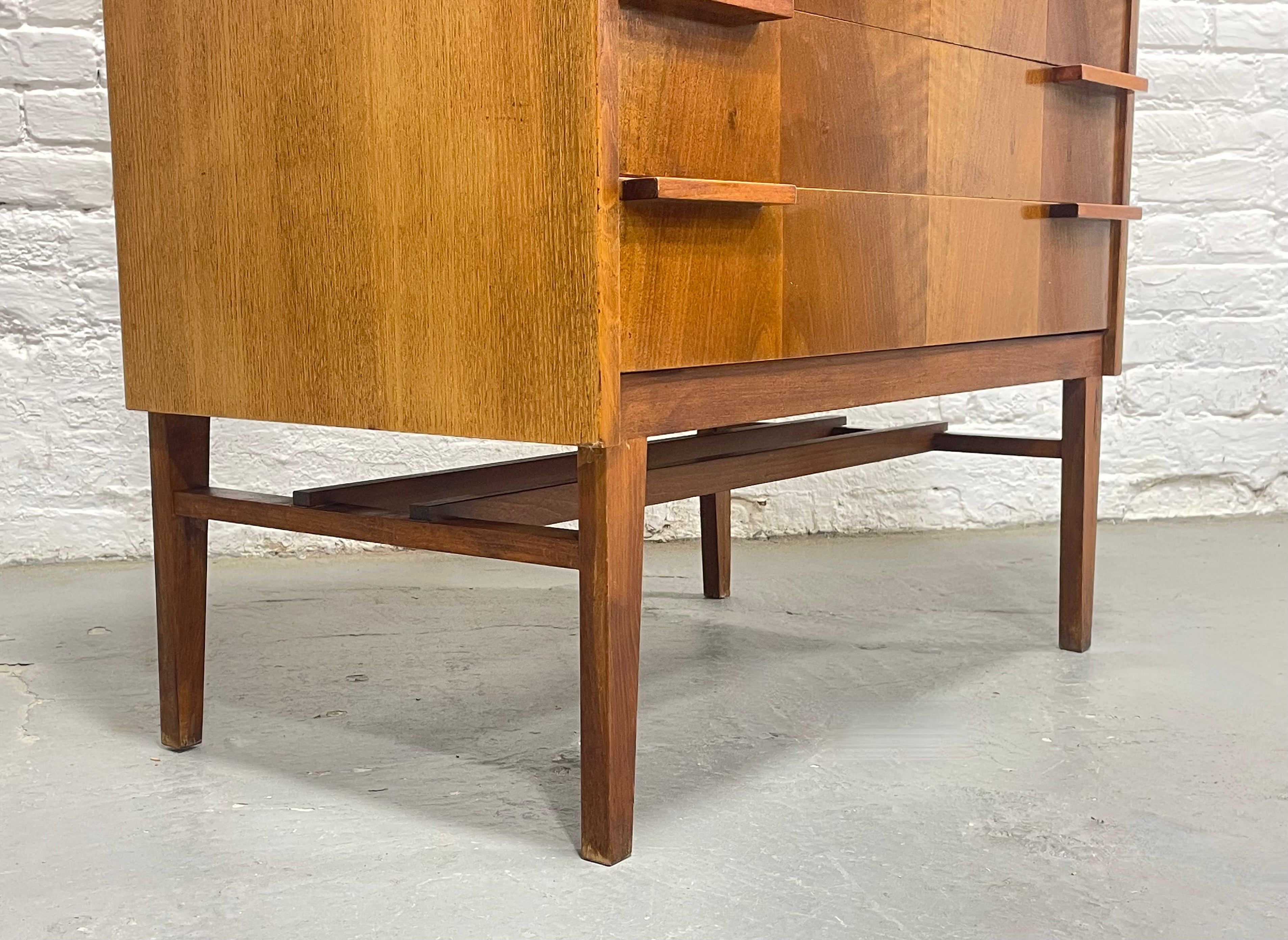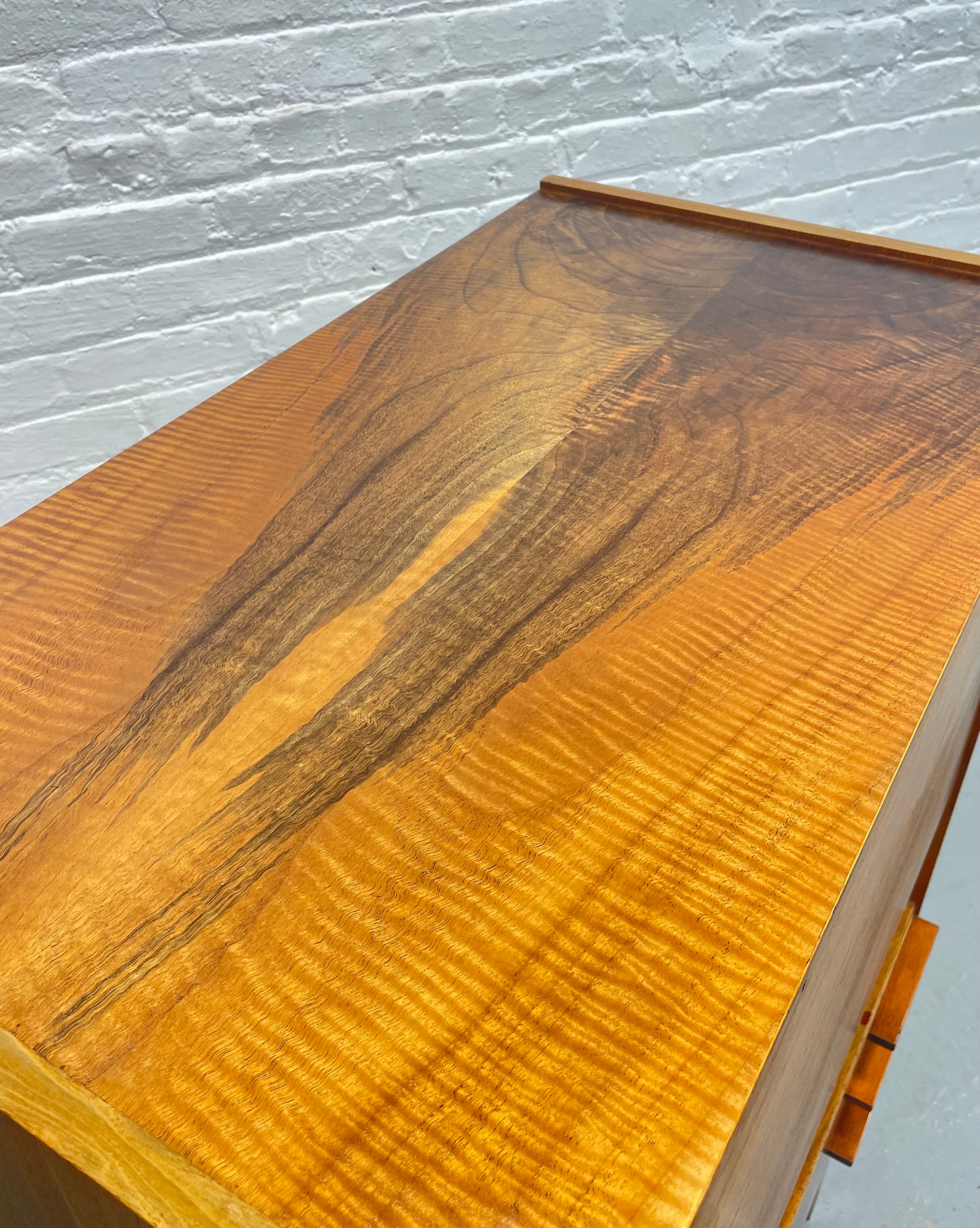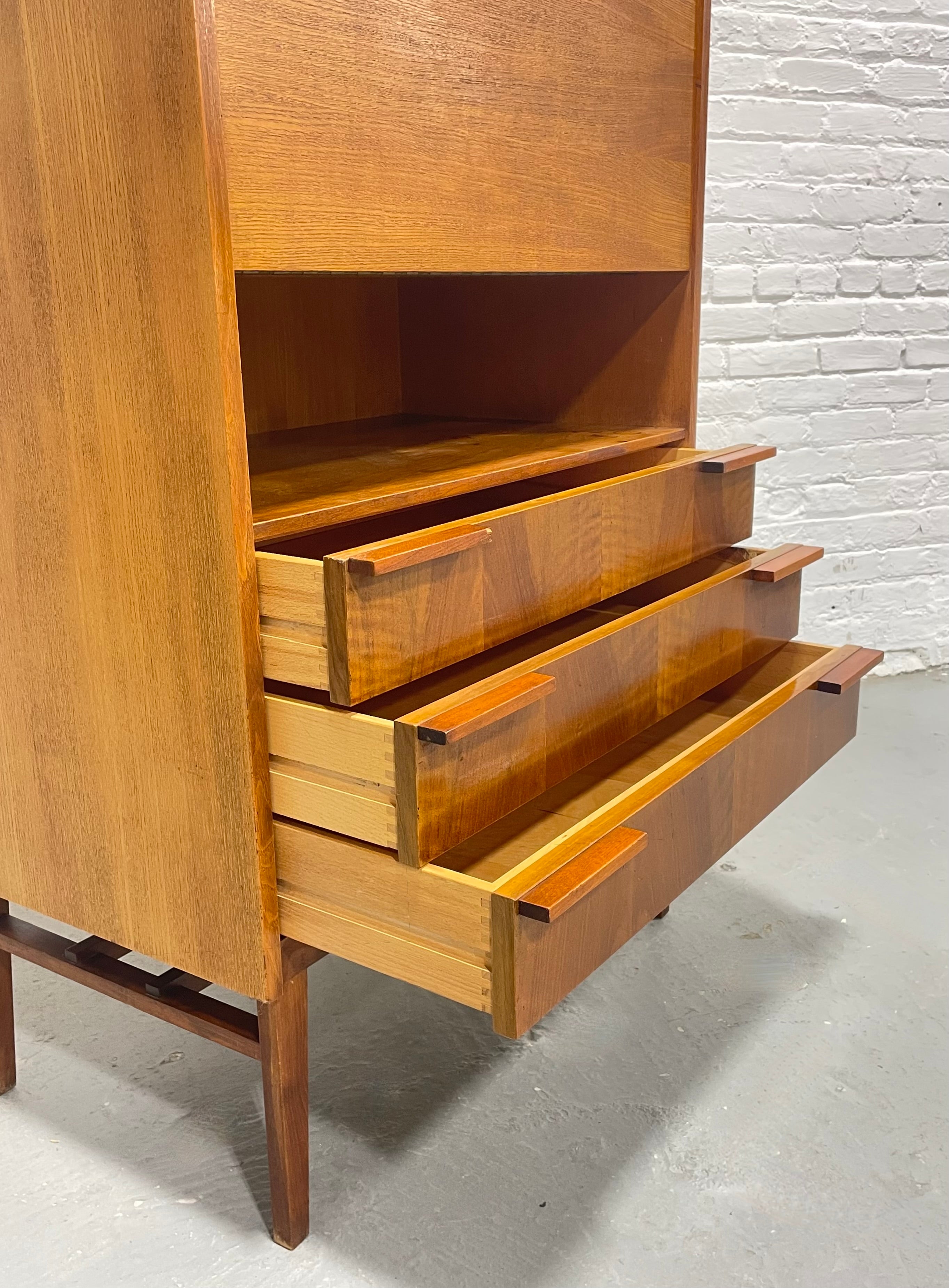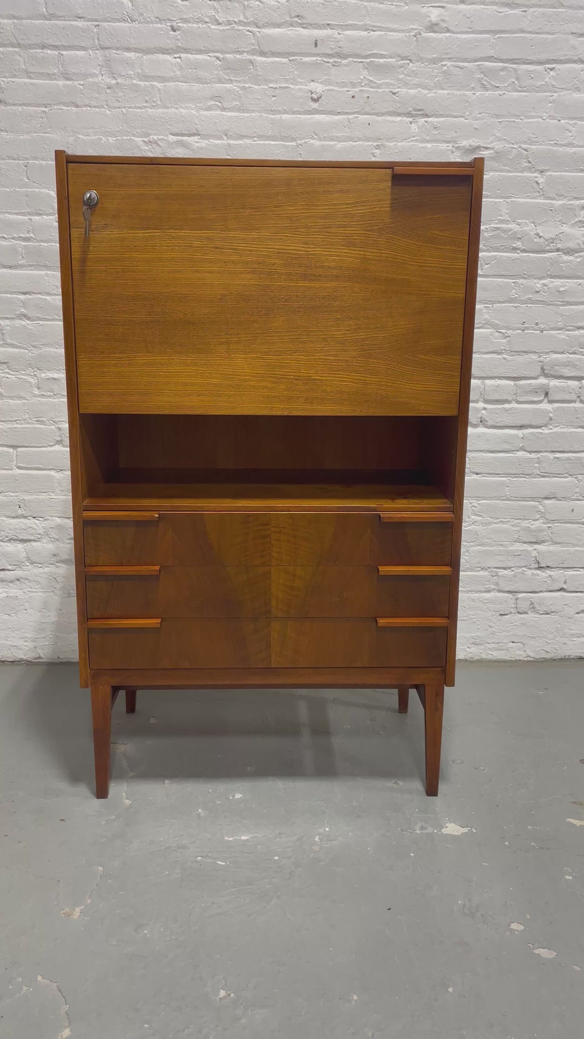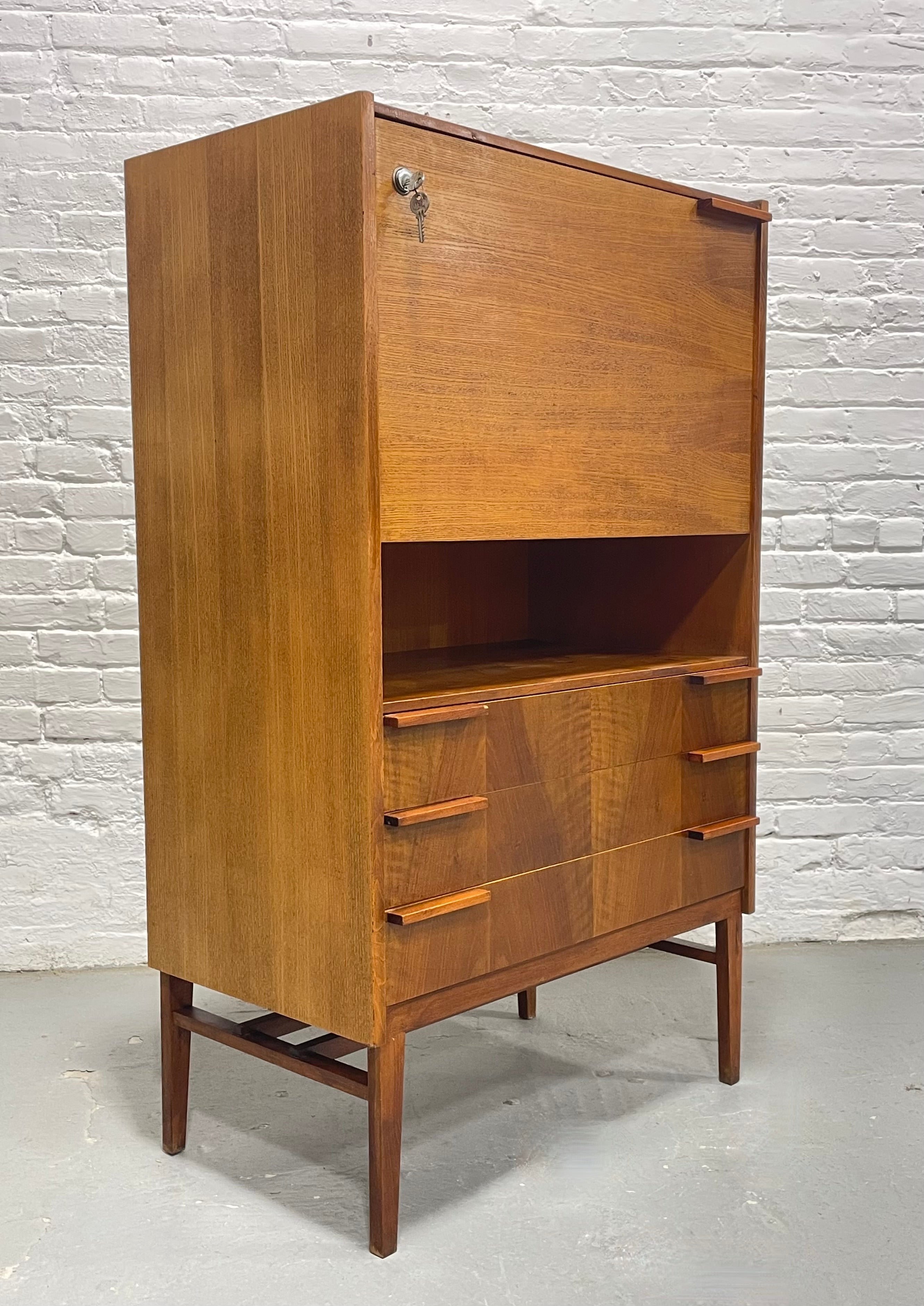 The drop-front locks (2 keys included!) and is great as a pouring surface if you opt to use the upper cabinet as a bar. Three wide drawers display stunning book matched grain patterns and are accented with sculptural horizontal pulls. An open cubby between the writing compartment and the drawers offers an ideal spot for books, décor, or everyday essentials. The piece stands on tall legs that elevate the form and emphasize its light, modern profile.