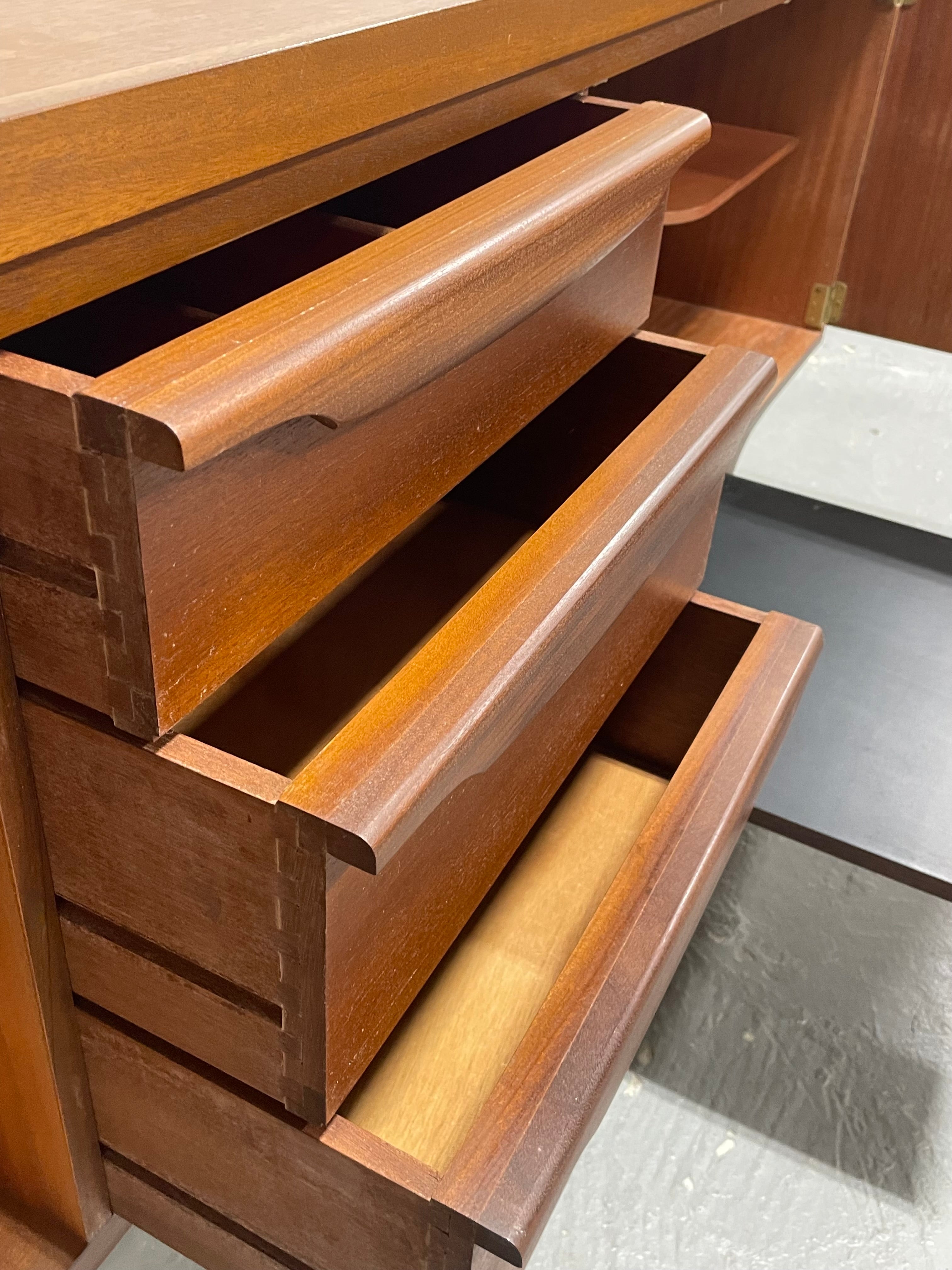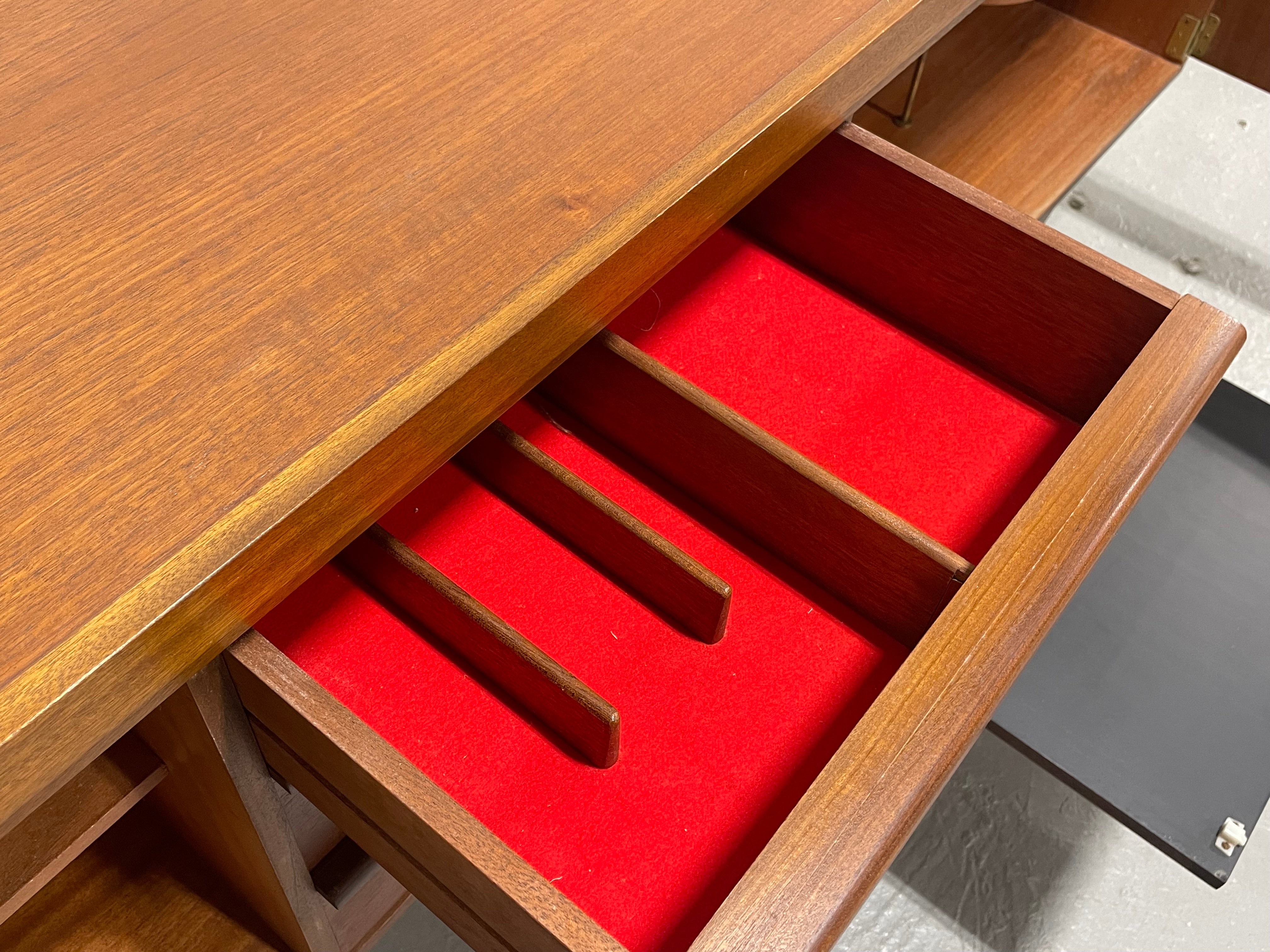 Beautifully crafted Mid Century modern teak credenza by Greaves & Thomas, Made in England, c. 1960’s. Simple yet extremely functional design and the perfect layout for a media stand or a home bar featuring generous shelving paired with three deep and spacious dovetailed drawers. The drawers offer sculpted handles and a luxe red felt lined top drawer. Behind the double cabinet doors, a cleverly shaped interior shelf accommodates bottle storage, while the drop-down door creates a convenient surface for mixing or serving drinks. Warm teak tones, subtle contrasts between the top and base, and beautifully considered proportions all speak to the craftsmanship and design sensibility for which Greaves & Thomas are celebrated.