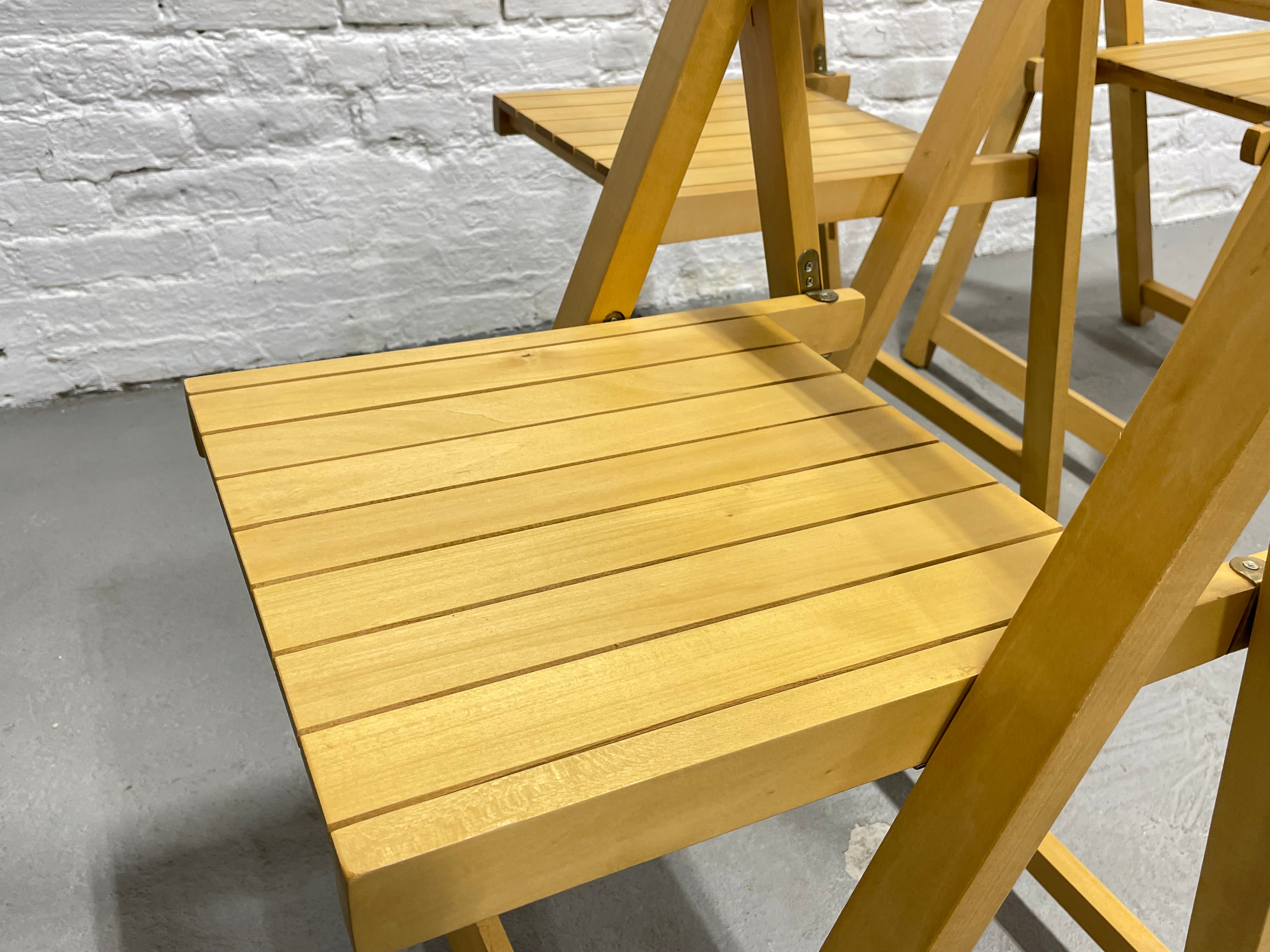 Mid Century Modern Set of Four Solid Beech Folding Chairs, Made in Romania. This solid and sturdy set offers minimalist lines and looks amazing from every angle. The chairs fold completely flat for storage. Use these as your everyday set or store them away under your bed or in a closet when not in use as and pull them out as an expansion set when guests arrive. Nice vintage condition with some wear to the bottoms of the legs.