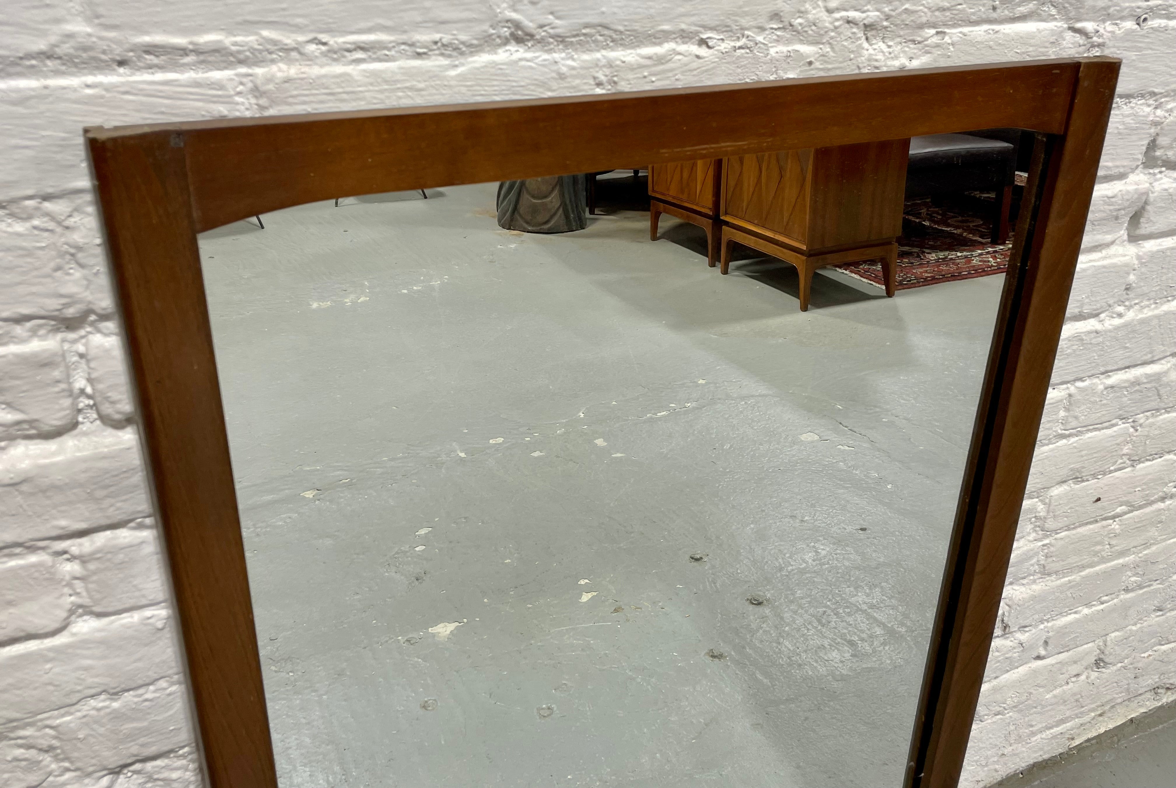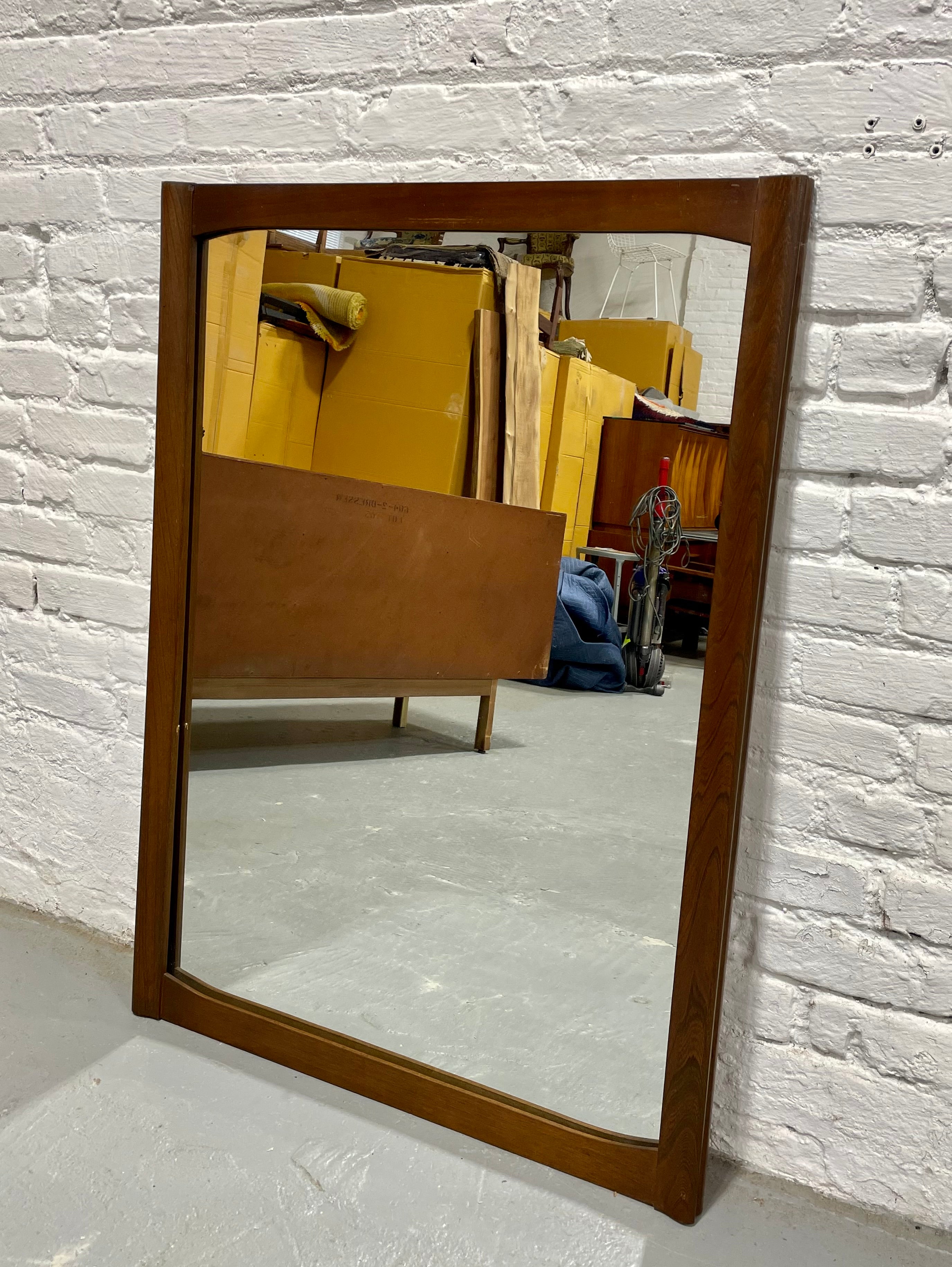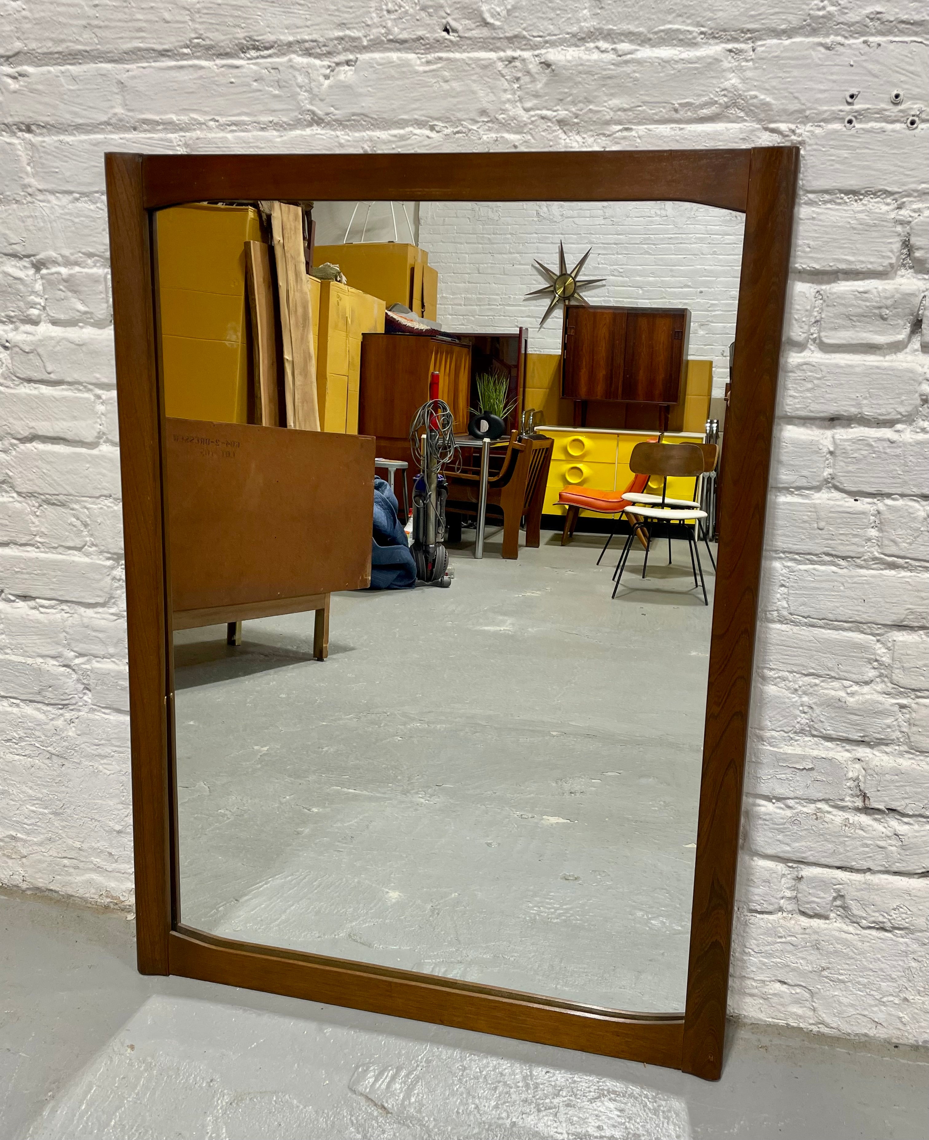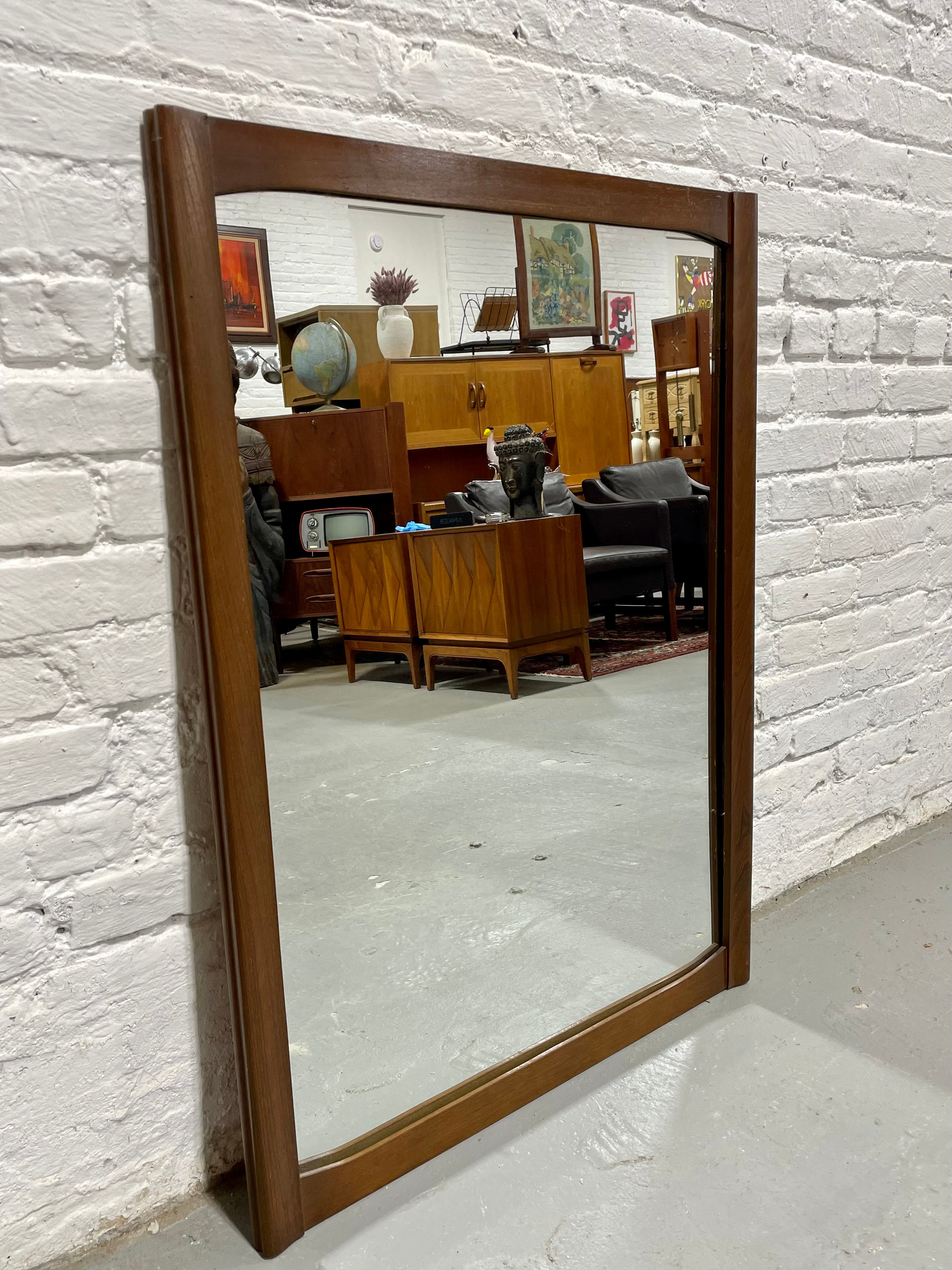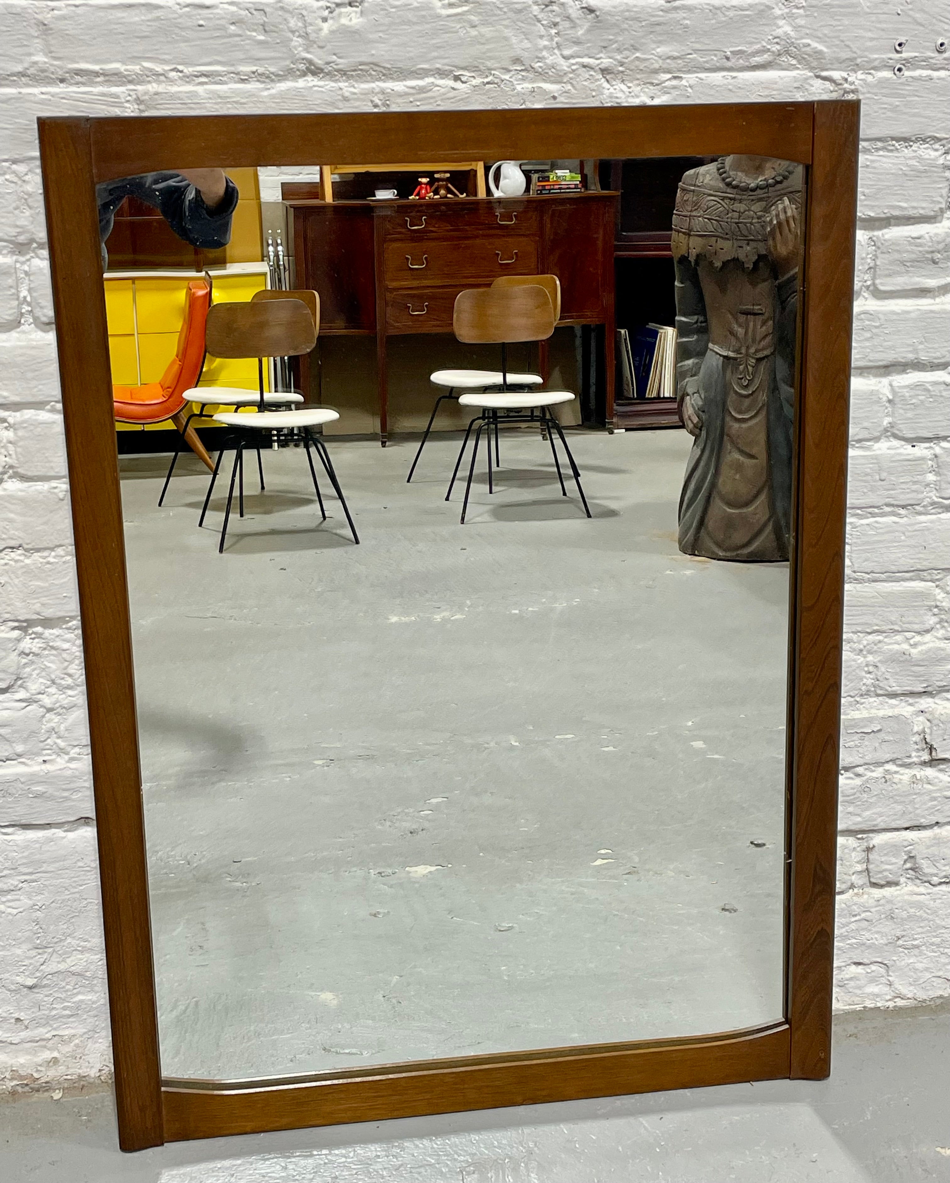 A beautifully crafted Mid Century Modern Walnut mirror, c. 1960s. This elegant wall mirror features a solid walnut frame with gently curved corners and a warm, even finish that highlights the natural grain of the wood. The understated design reflects the timeless sophistication and craftsmanship characteristic of Scandinavian mid century design. Its clean lines and organic warmth make it versatile enough for use in an entryway, bedroom, or living room.