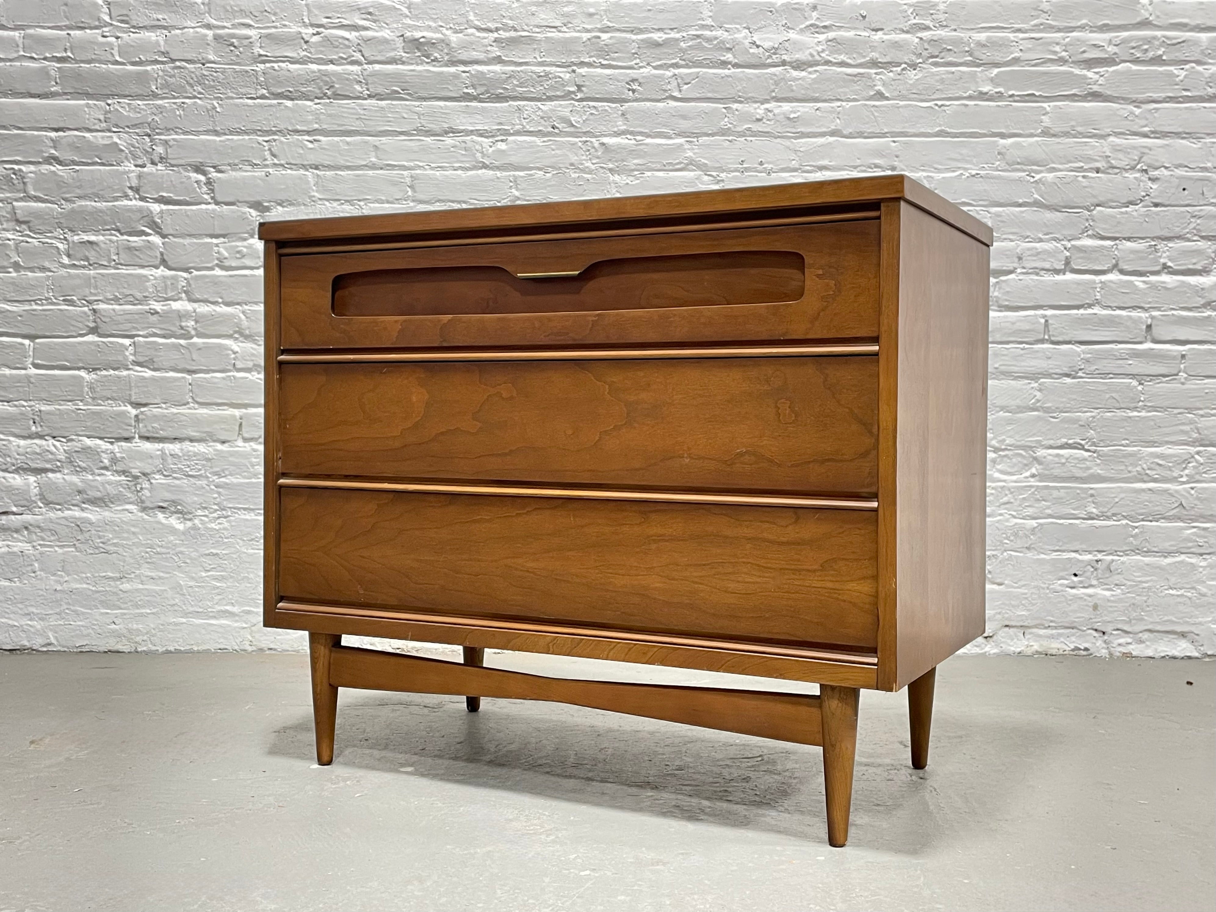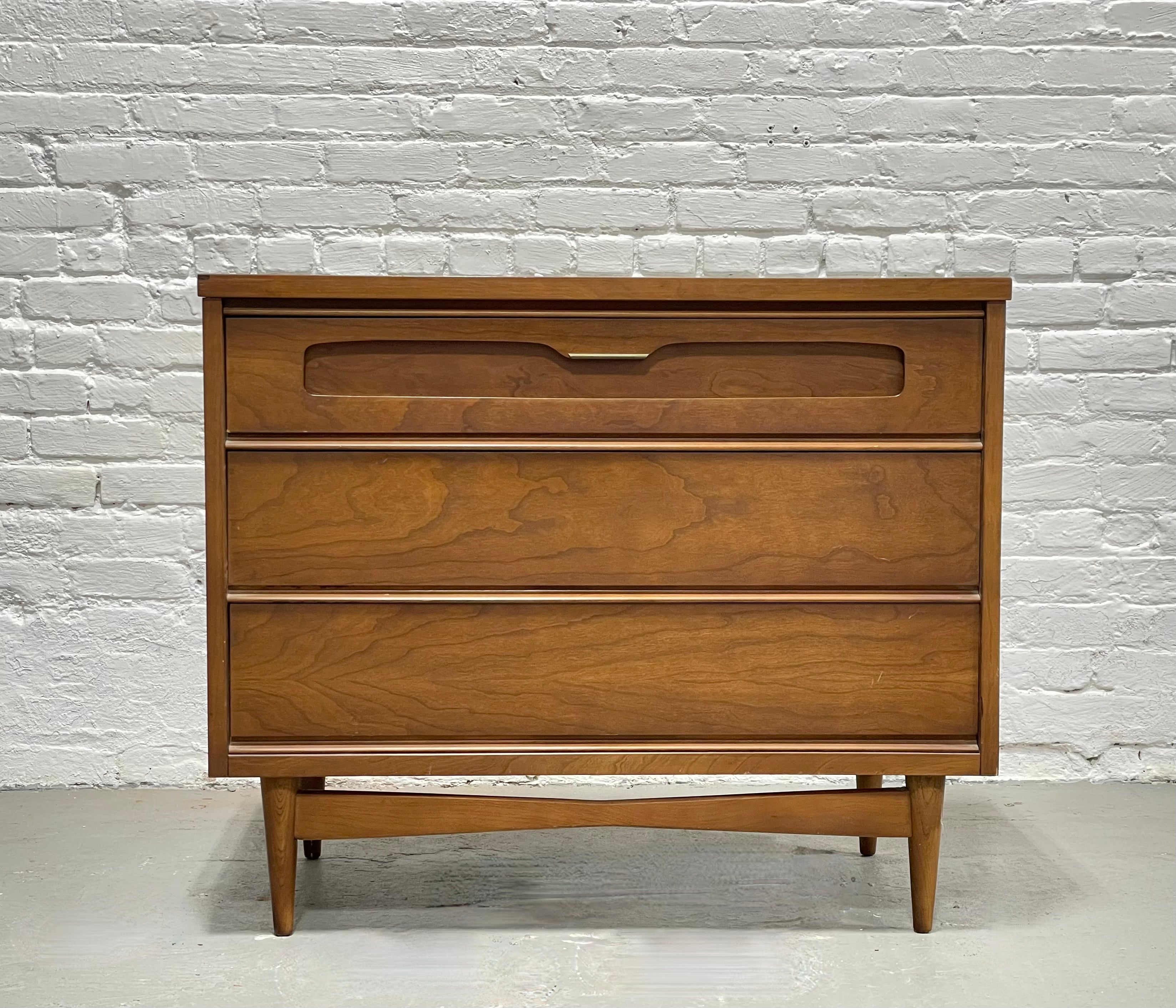 Mid Century Modern Petite Dresser by Bassett Furniture Co., c. 1960's. This thoughtful piece takes up minimal floor space yet provides three deep and spacious drawers for storage. Place in your entryway as a landing place for mail and keys or a bedroom for space friendly storage. Very nice vintage condition with some wear to the top or we can refinish it.