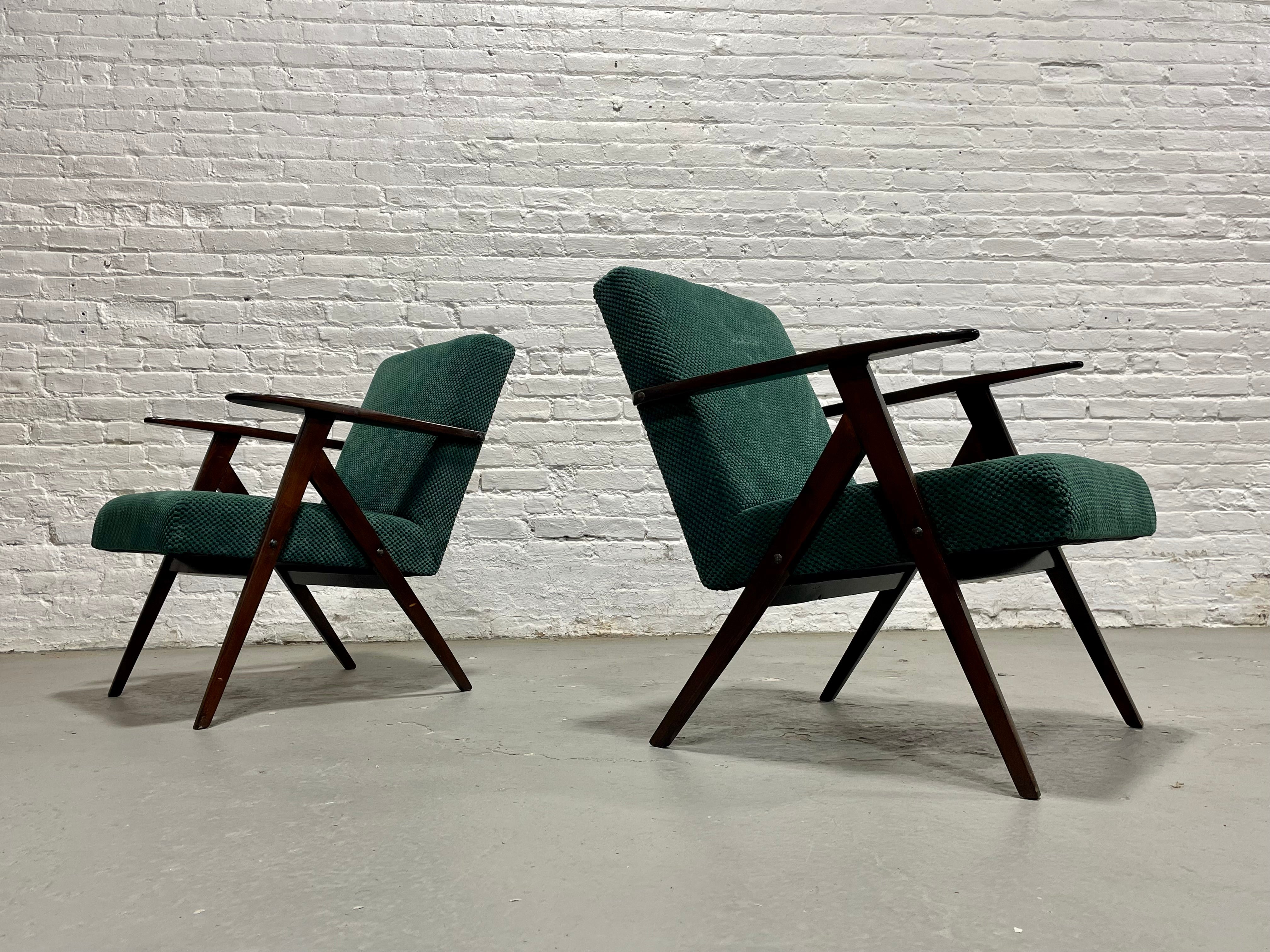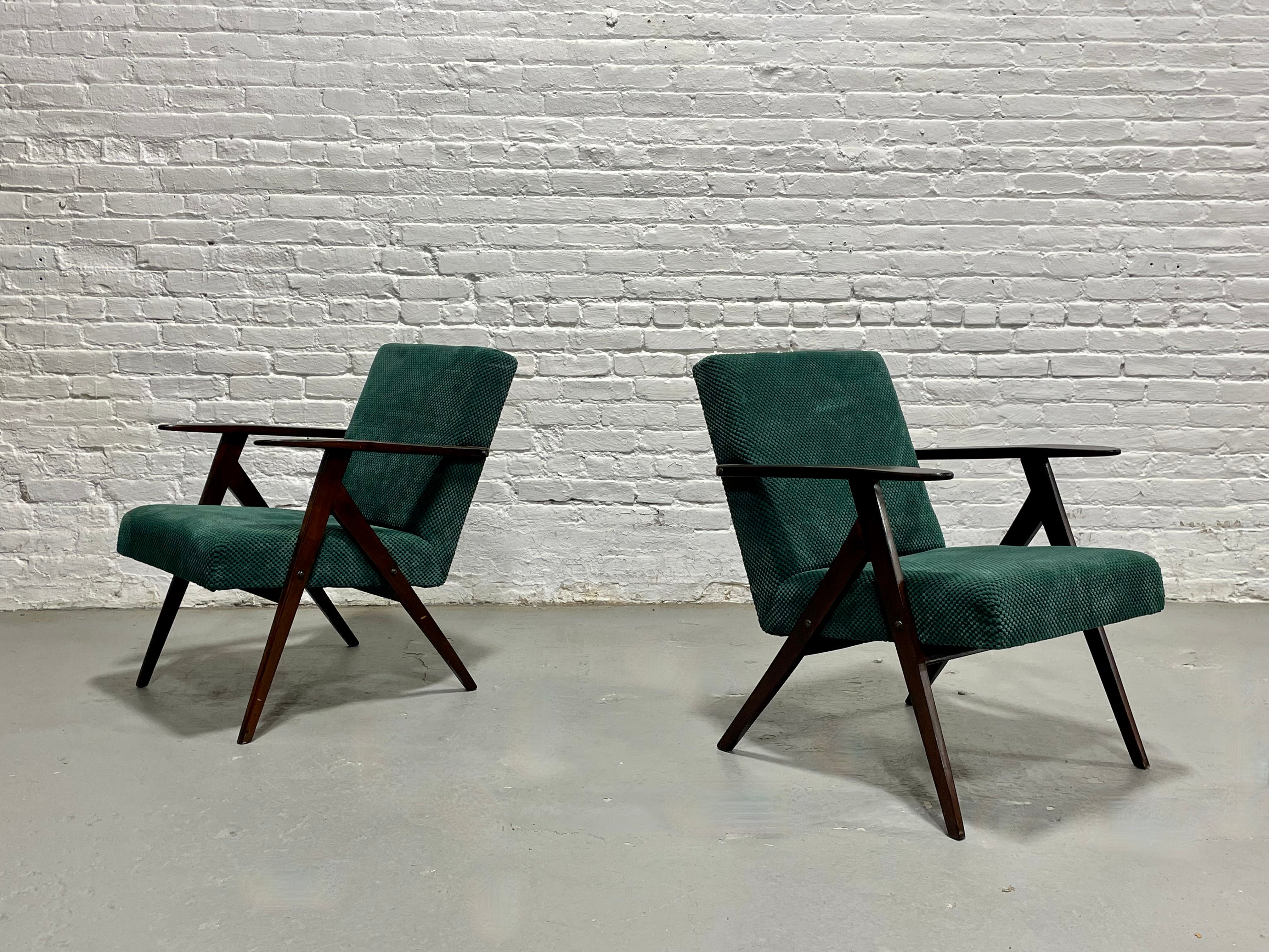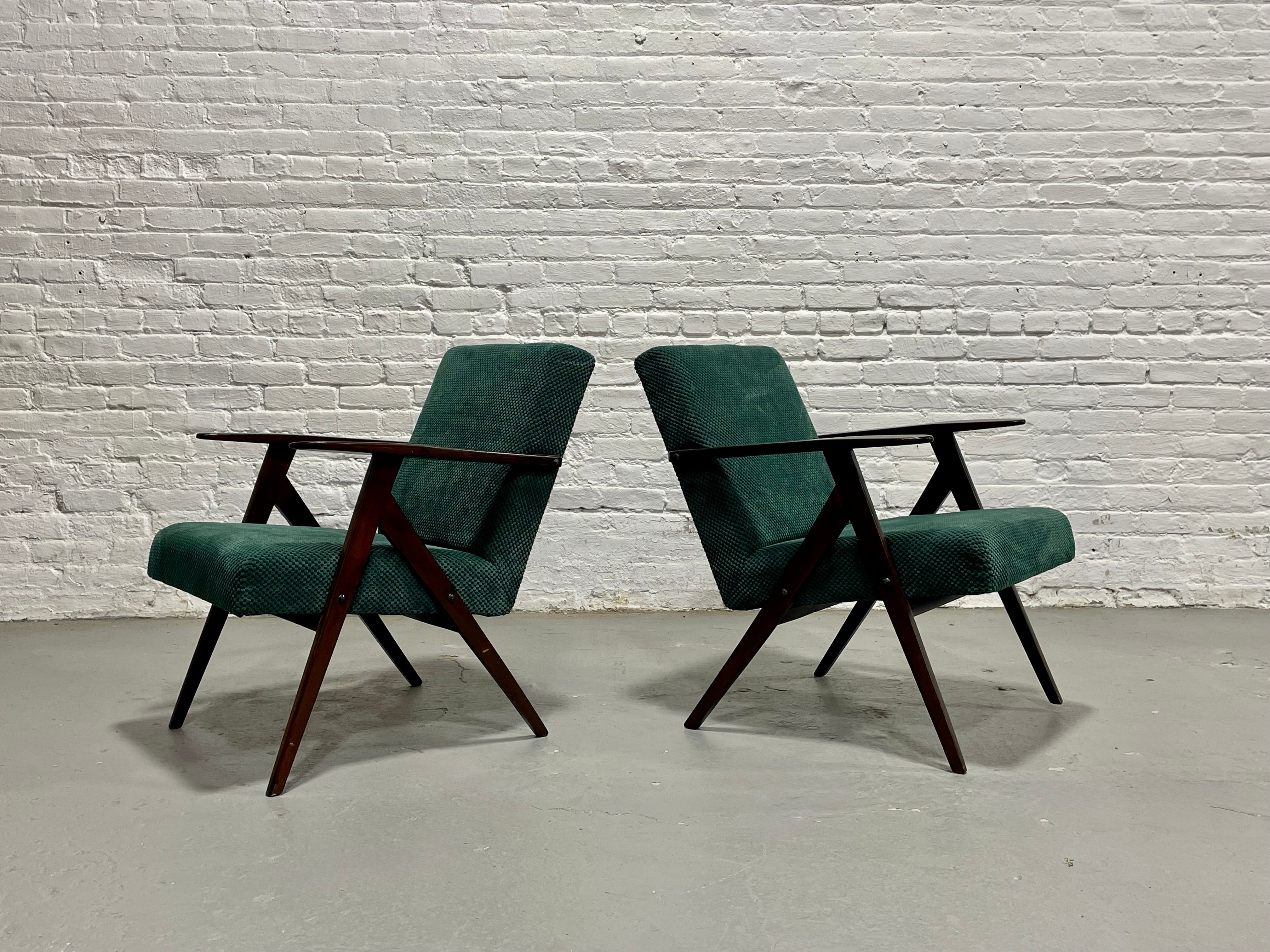 A striking pair of original Model B-310 VAR lounge chairs, designed and produced in Poland in the 1960s. These sculptural chairs are celebrated examples of post-war Polish modernism, combining angular architectural lines with a relaxed, low-profile seat. The frames are crafted from solid stained beechwood, featuring the instantly recognizable “compass” leg structure and elongated paddle arms that define the model. The seats are upholstered in a rich deep-green soft textured fabric. Lovely vintage condition with some wear from age and use. Price is for the pair.