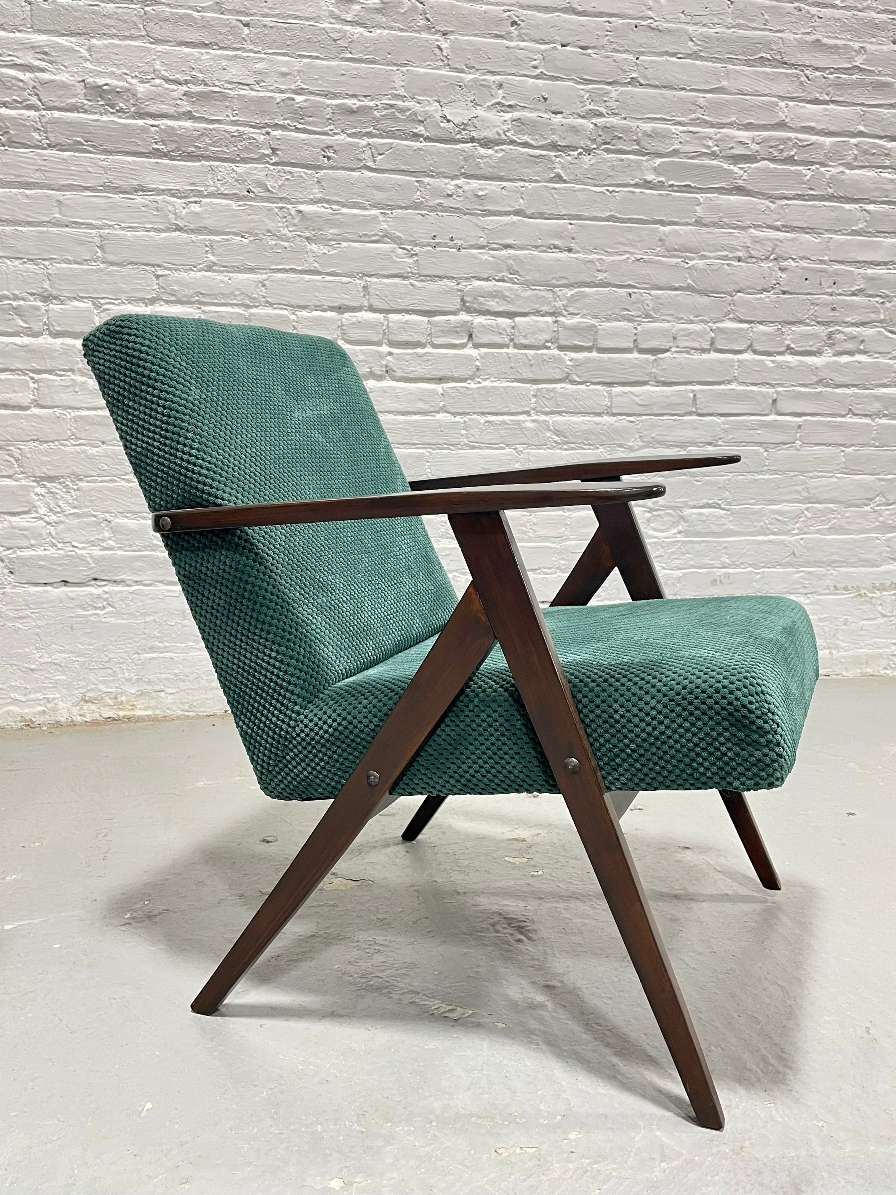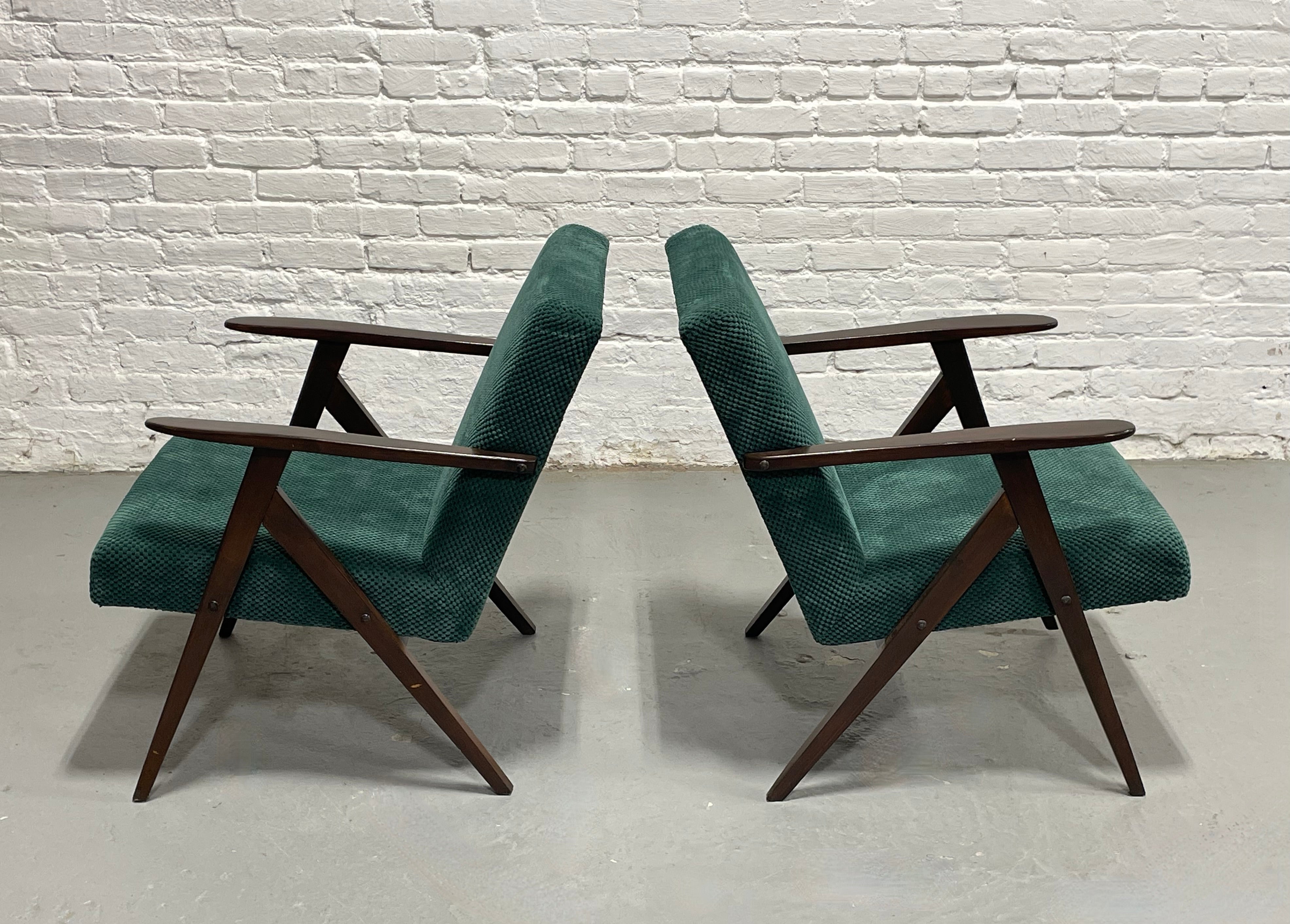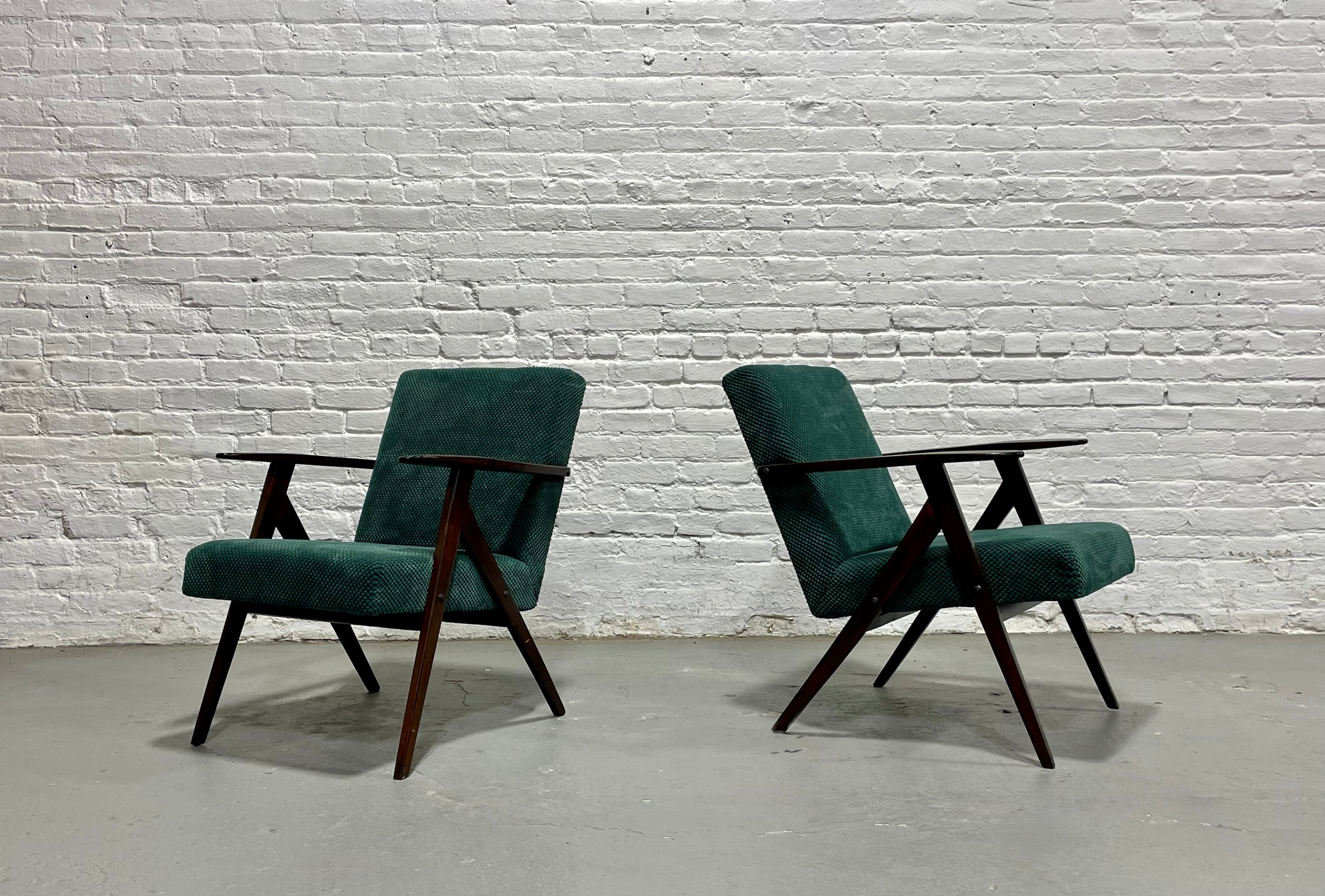 A striking pair of original Model B-310 VAR lounge chairs, designed and produced in Poland in the 1960s. These sculptural chairs are celebrated examples of post-war Polish modernism, combining angular architectural lines with a relaxed, low-profile seat. The frames are crafted from solid stained beechwood, featuring the instantly recognizable “compass” leg structure and elongated paddle arms that define the model. The seats are upholstered in a rich deep-green soft textured fabric. Lovely vintage condition with some wear from age and use. Price is for the pair.