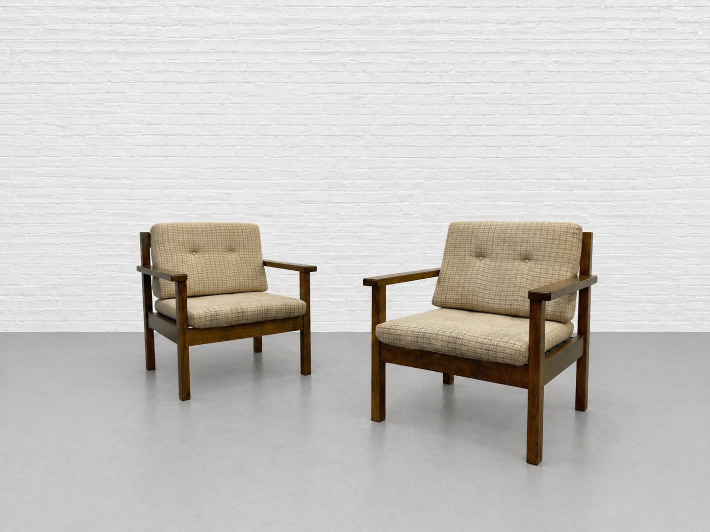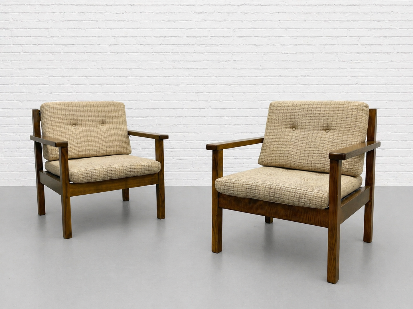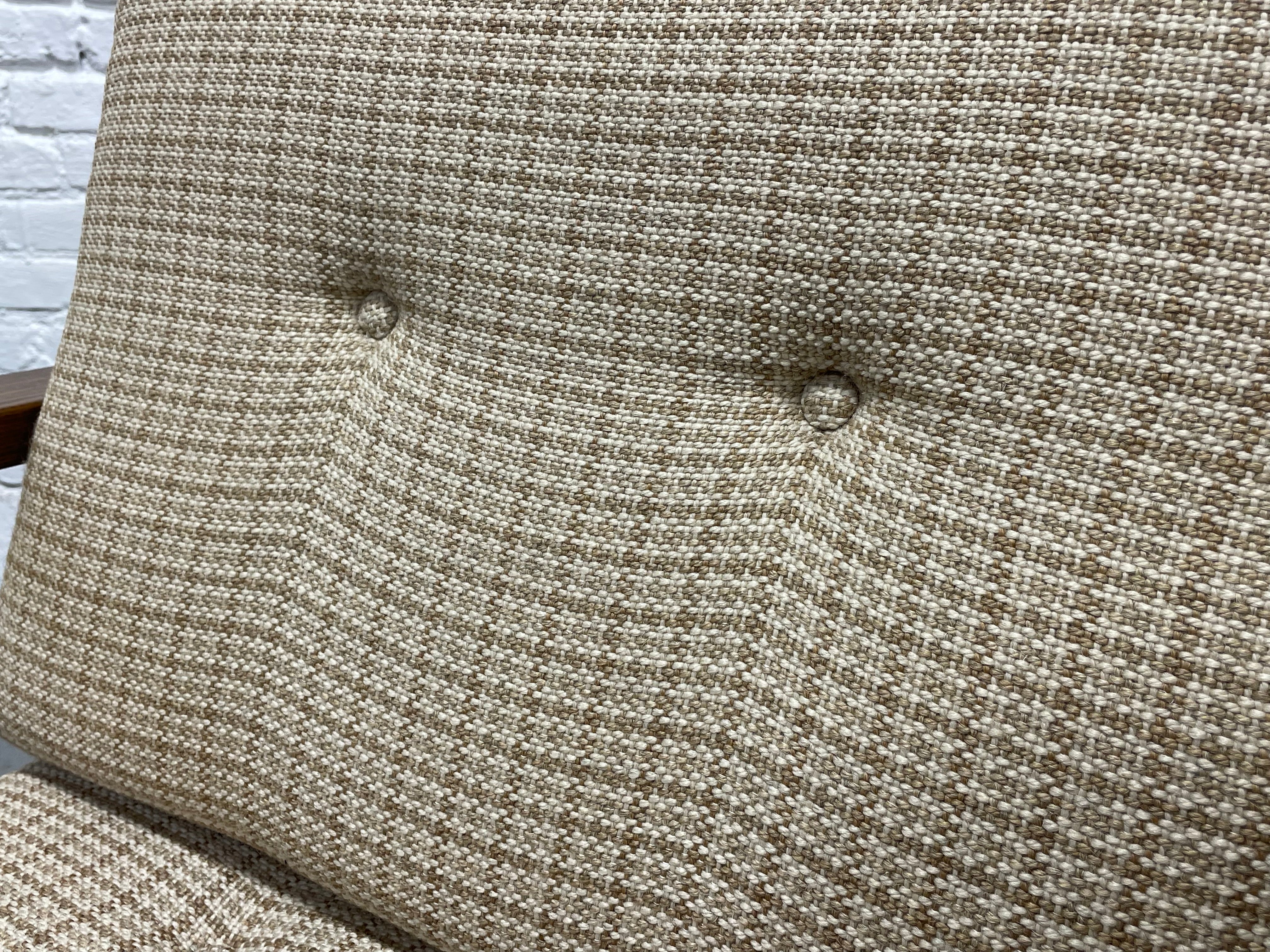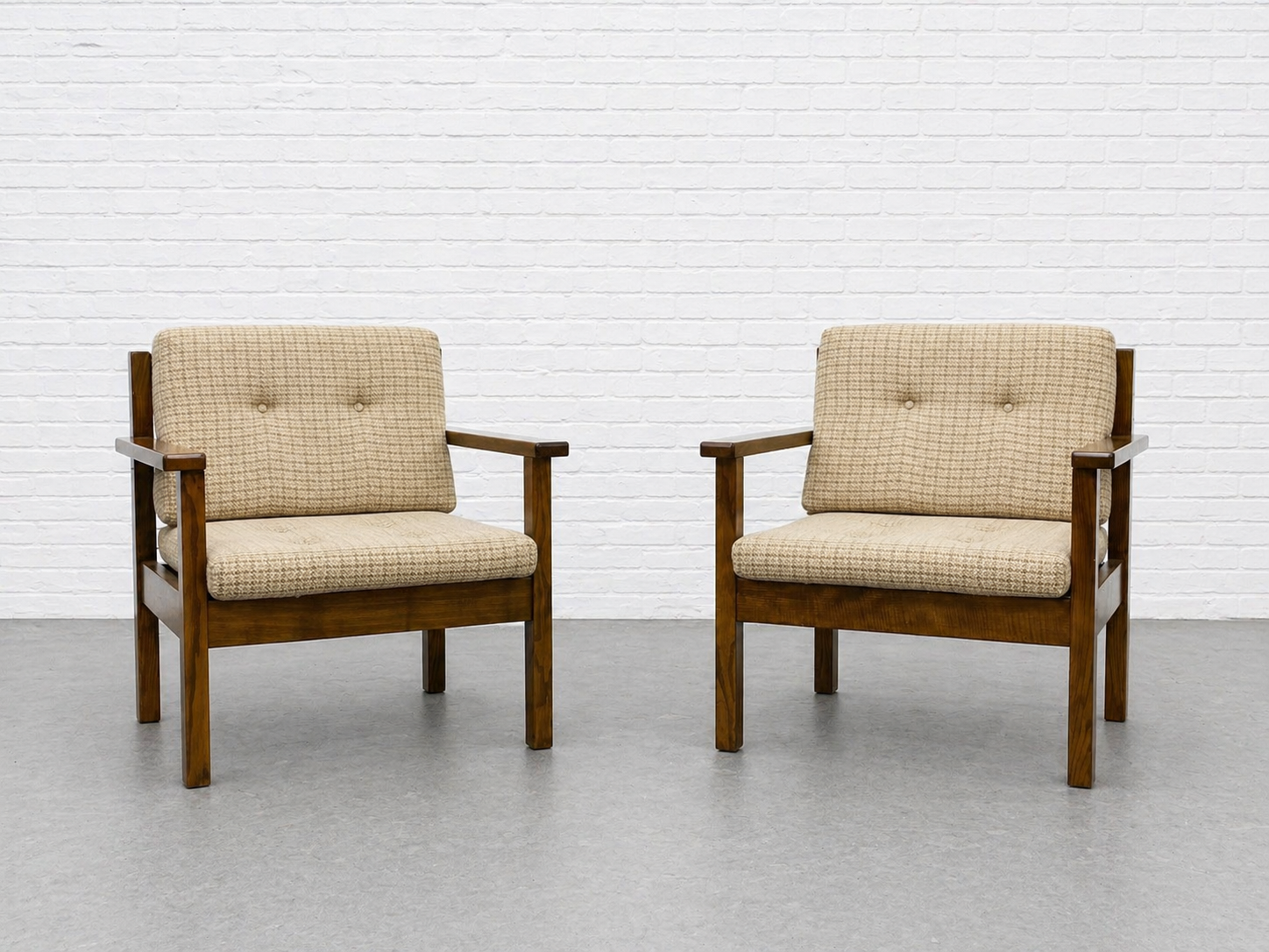 Pair of Mid Century Modern lounge chairs featuring solid wood frames and lovely upholstered cushions in a warm, neutral woven fabric. The proportions are generous and comfortable, making them ideal for a living room, office, or reading space. The wood grain has a rich tone with great depth, and the cushions offer a soft contrast while keeping the overall aesthetic refined and minimal. Very good vintage condition with minor, age appropriate wear. Price is for the pair.
