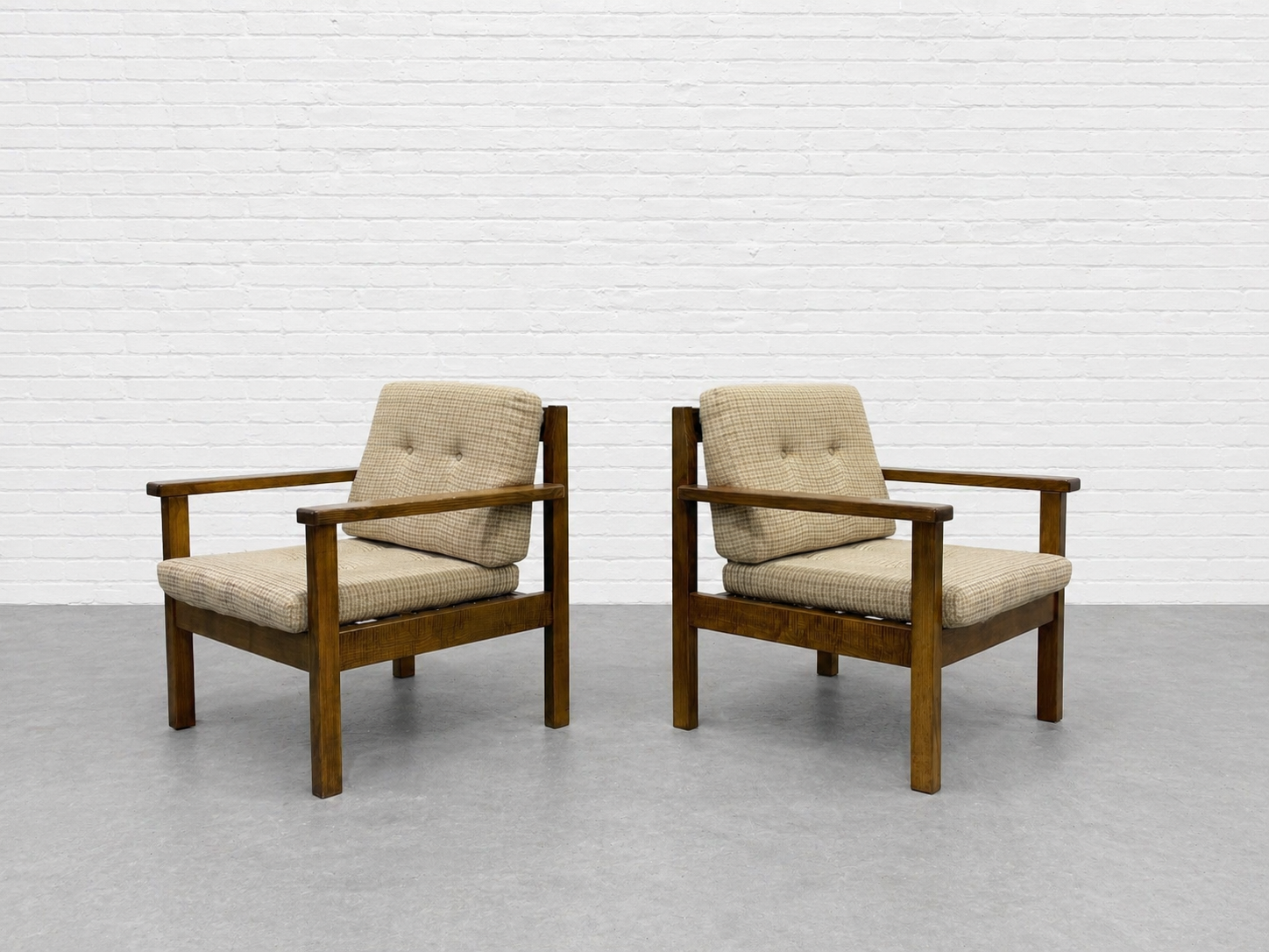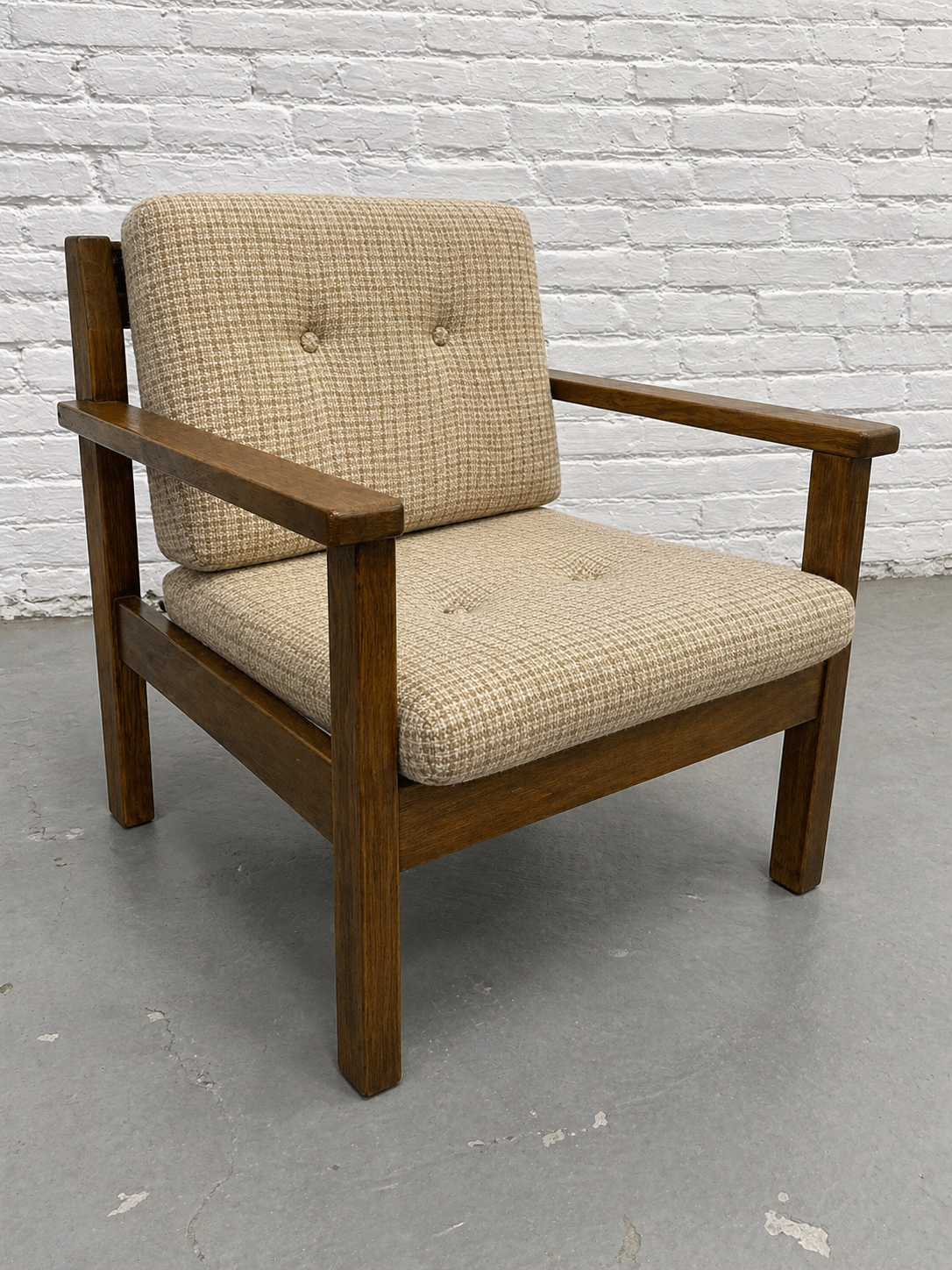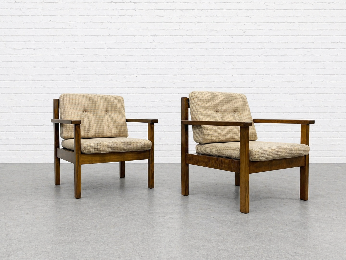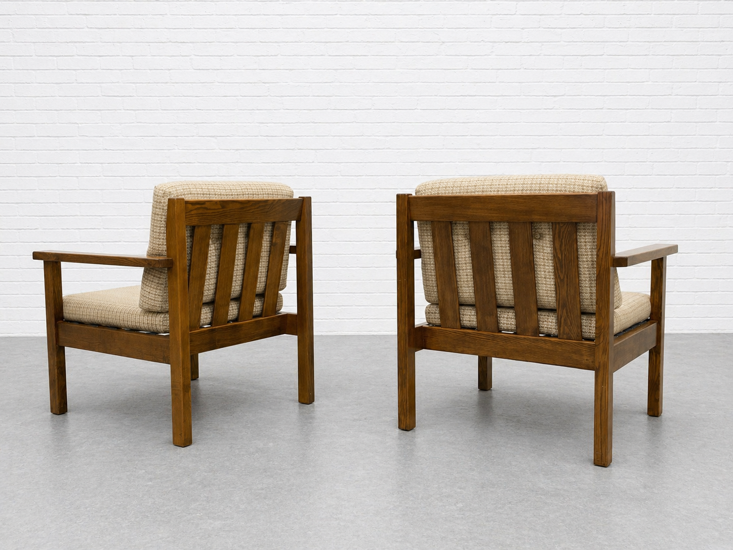 Pair of Mid Century Modern lounge chairs featuring solid wood frames and lovely upholstered cushions in a warm, neutral woven fabric. The proportions are generous and comfortable, making them ideal for a living room, office, or reading space. The wood grain has a rich tone with great depth, and the cushions offer a soft contrast while keeping the overall aesthetic refined and minimal. Very good vintage condition with minor, age appropriate wear. Price is for the pair.