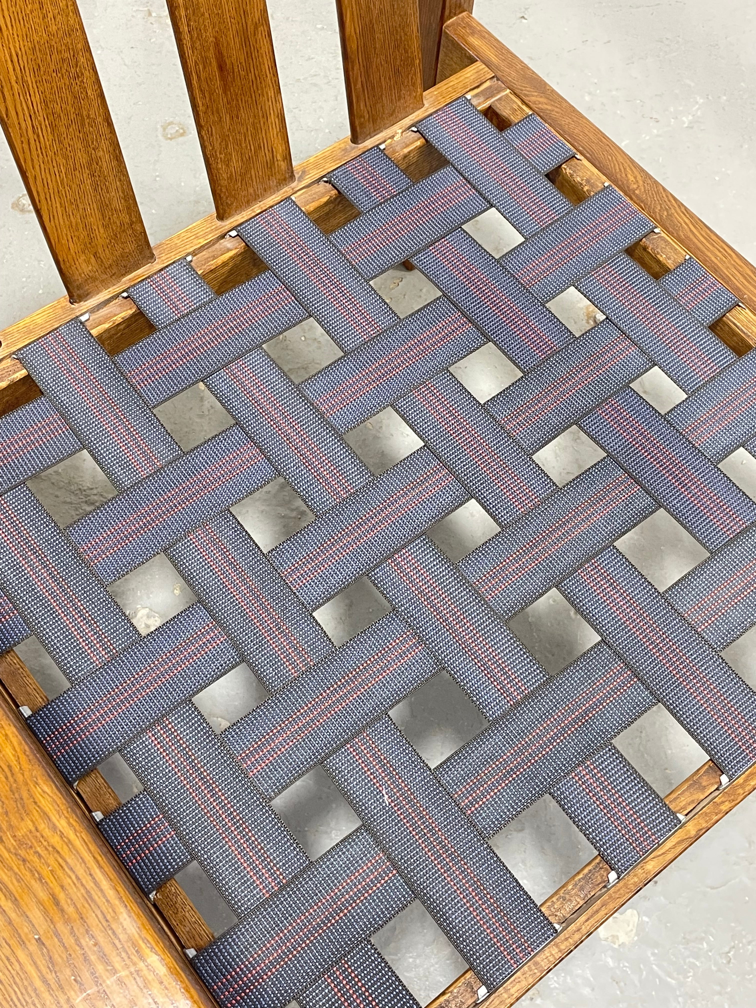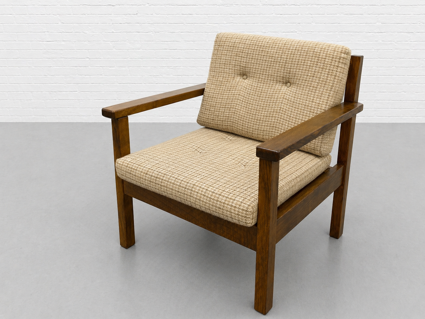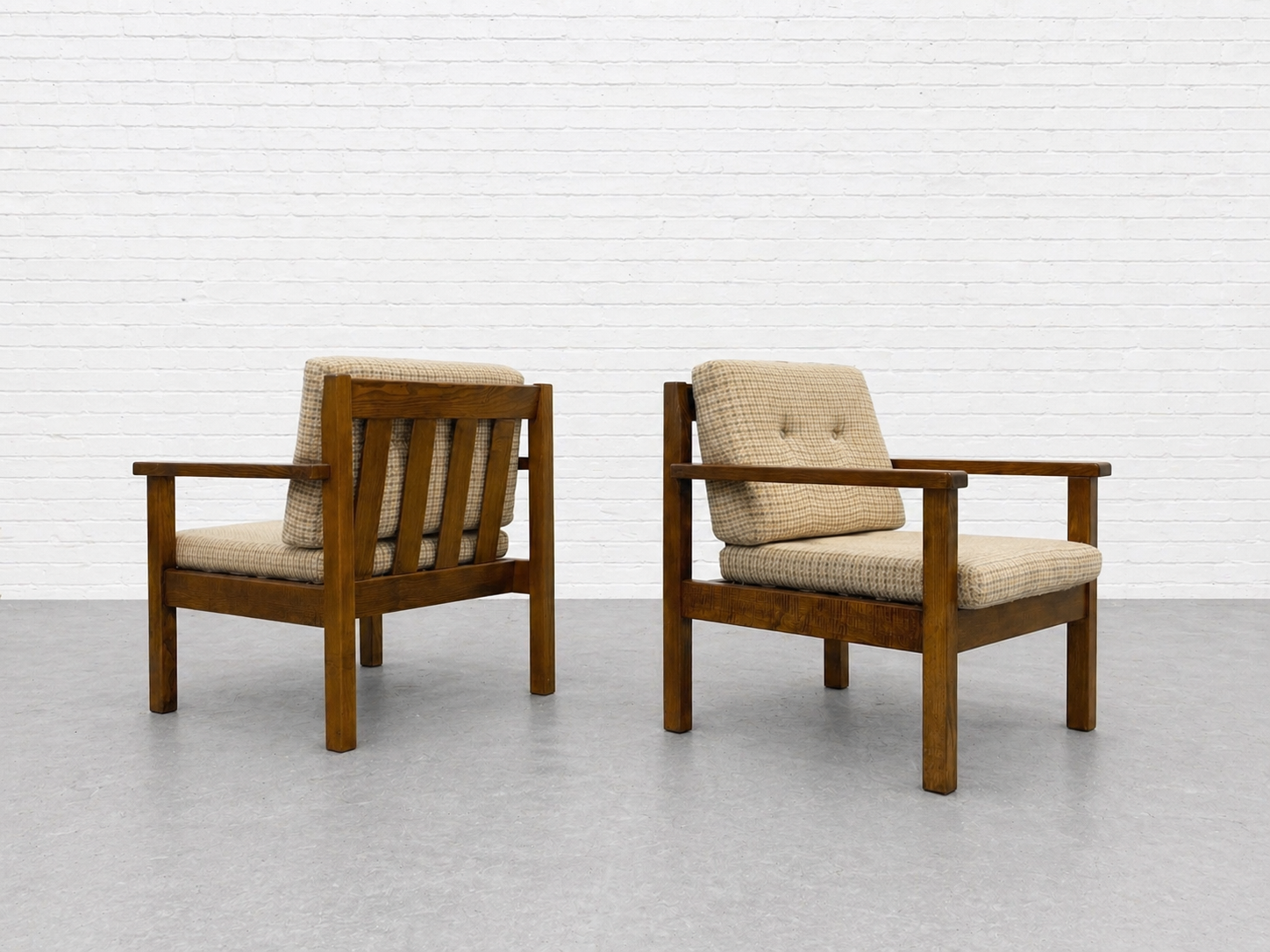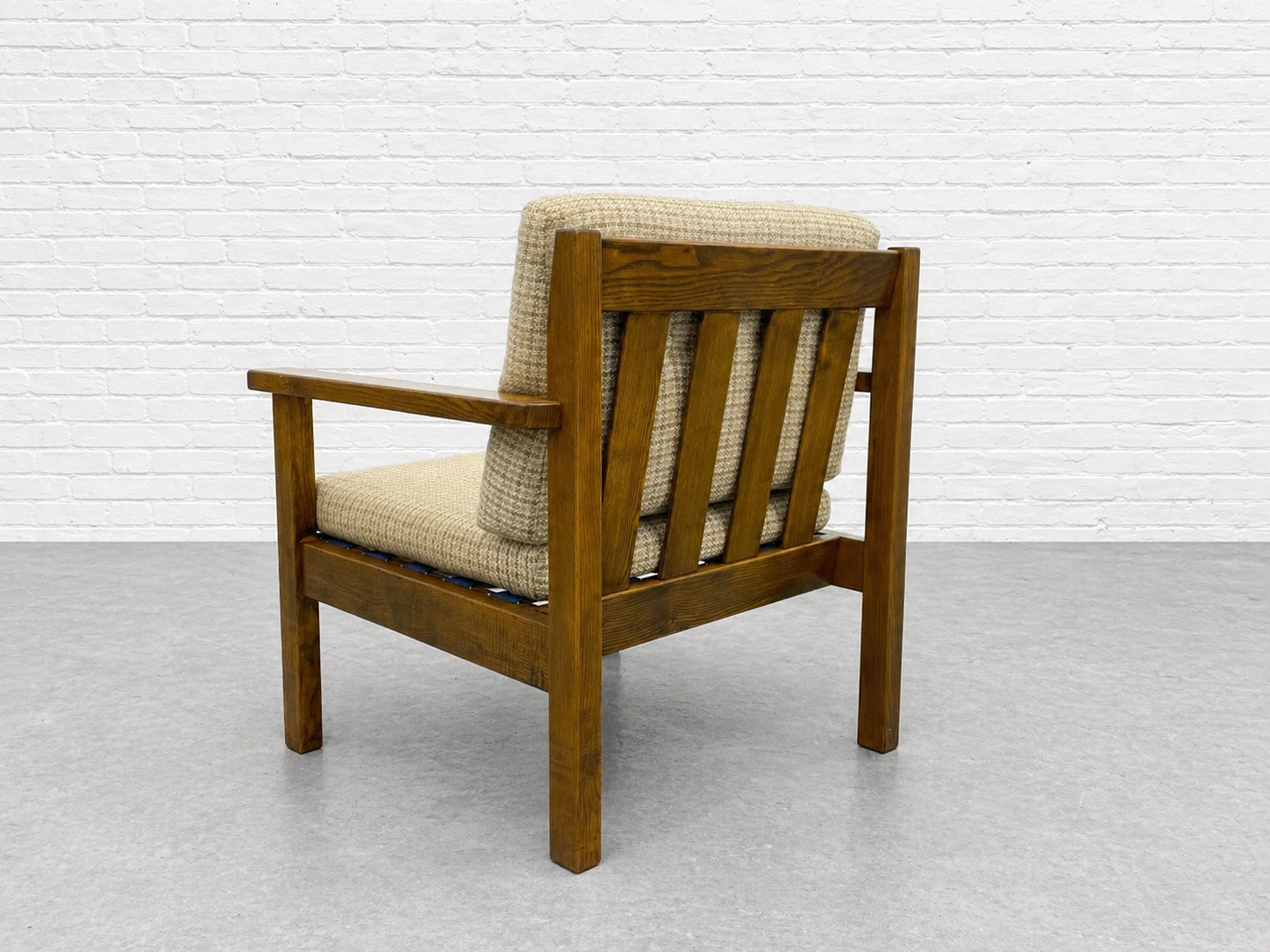 Pair of Mid Century Modern lounge chairs featuring solid wood frames and lovely upholstered cushions in a warm, neutral woven fabric. The proportions are generous and comfortable, making them ideal for a living room, office, or reading space. The wood grain has a rich tone with great depth, and the cushions offer a soft contrast while keeping the overall aesthetic refined and minimal. Very good vintage condition with minor, age appropriate wear. Price is for the pair.