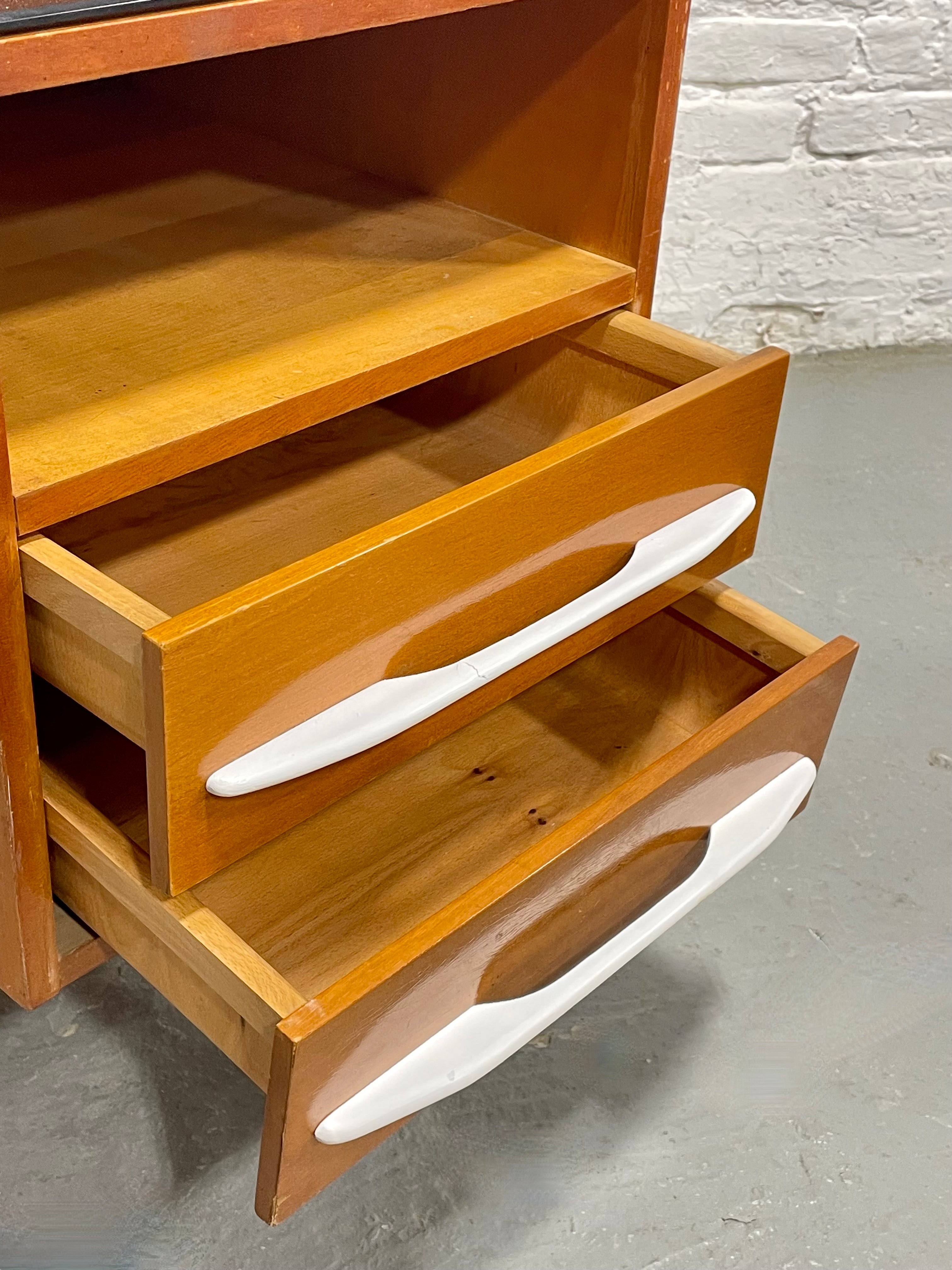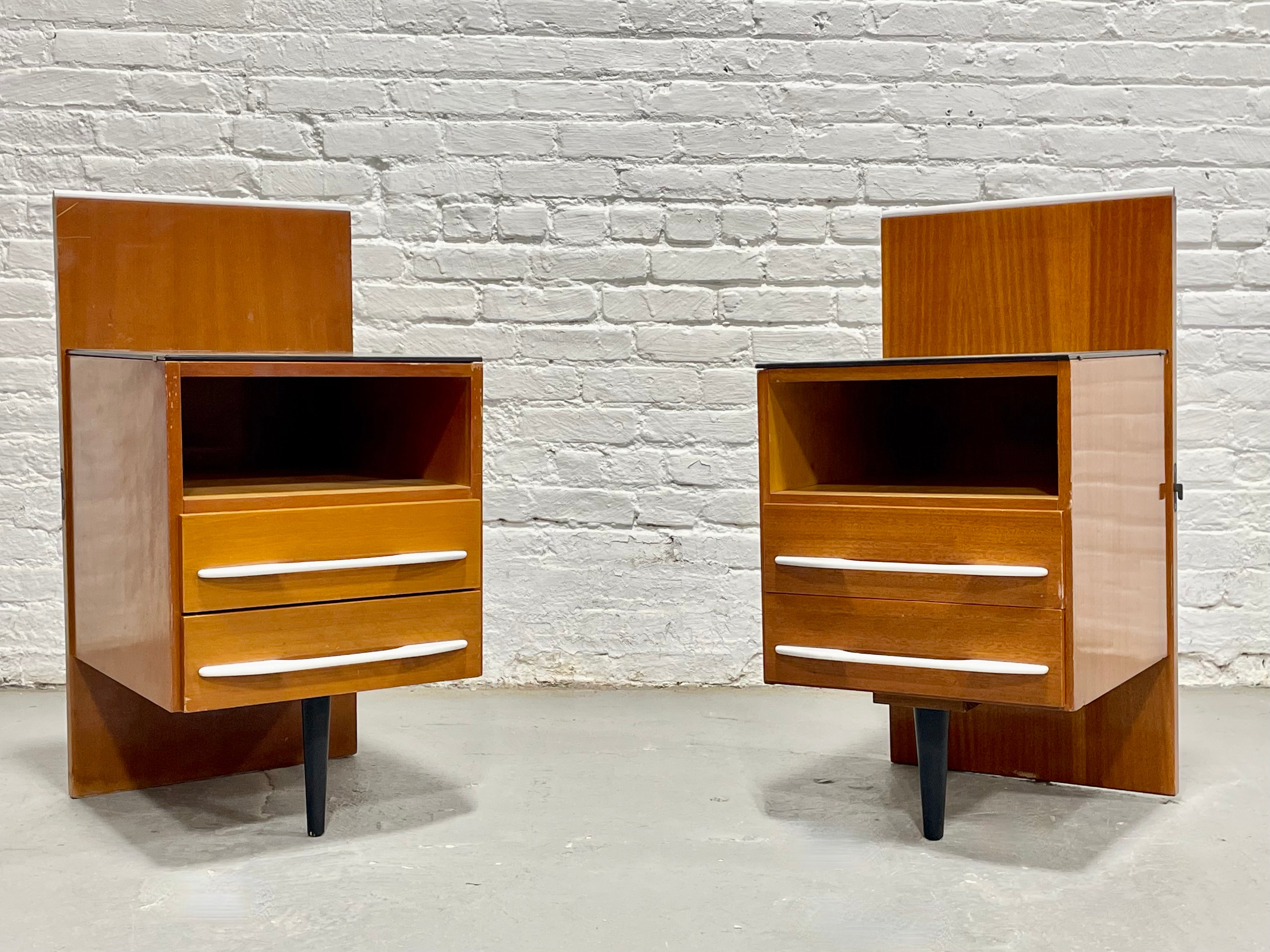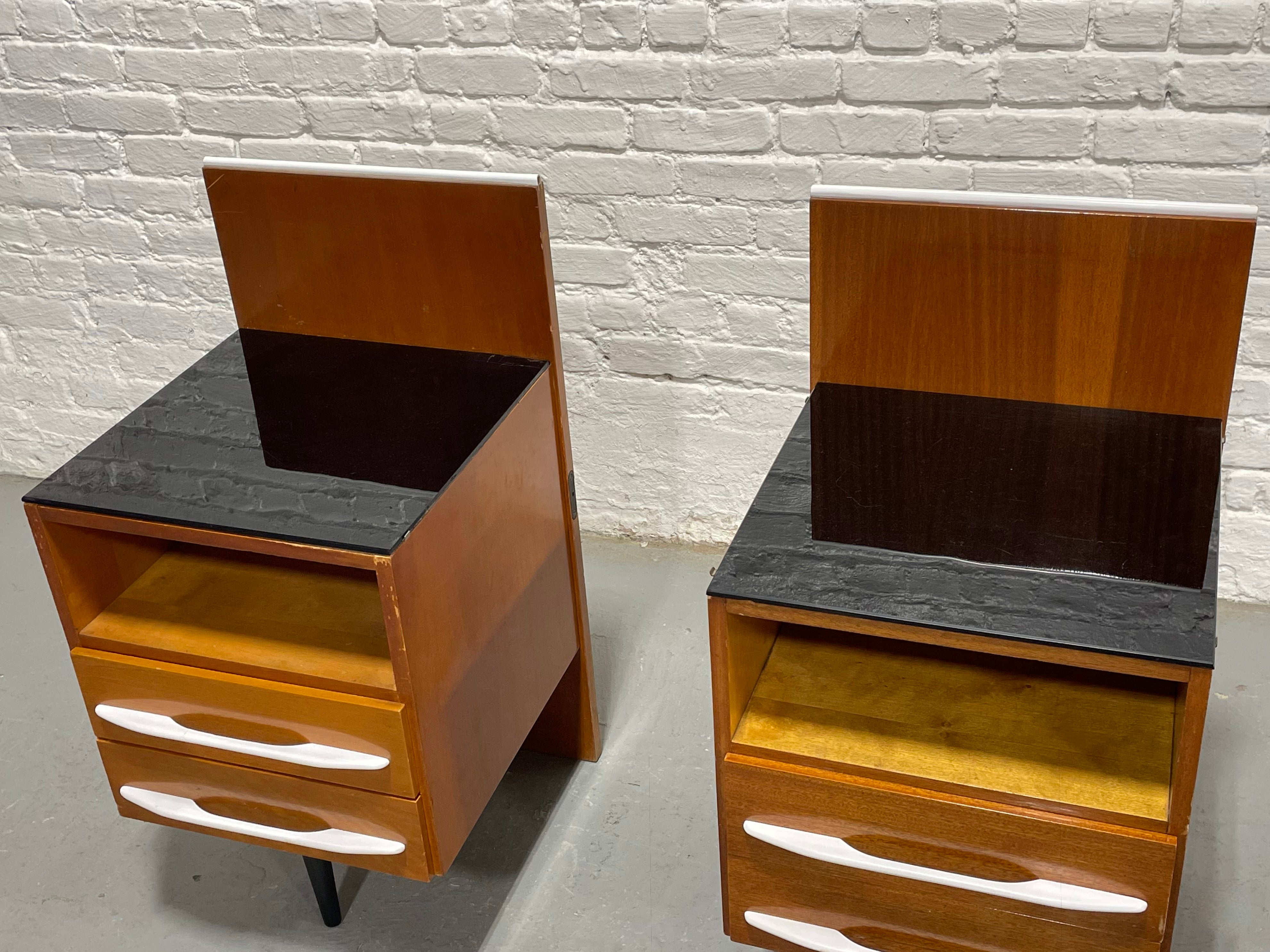 Pair of Mid Century Modern freestanding nightstands by Mojmir Pozar for Up Zavody, C. 1950s featuring a distinctive mix of materials - warm beechwood, white pulls and black glass tops. The bedside tables showcase a warm beechwood finish with sleek white drawer pulls and black glass tabletops, offering a bold contrast that captures the era’s signature style. Each nightstand includes an open cubby for books or small items above two drawers that glide smoothly and provide generous storage. The asymmetrical design features a raised back panel and a single tapered black leg, creating a light, floating appearance. The nightstands have hardware to attach to a bed but they can also sit on either side of your headboard. Lovely vintage condition with some wear from age and use; small break to corner of glass of one stand, as pictured.