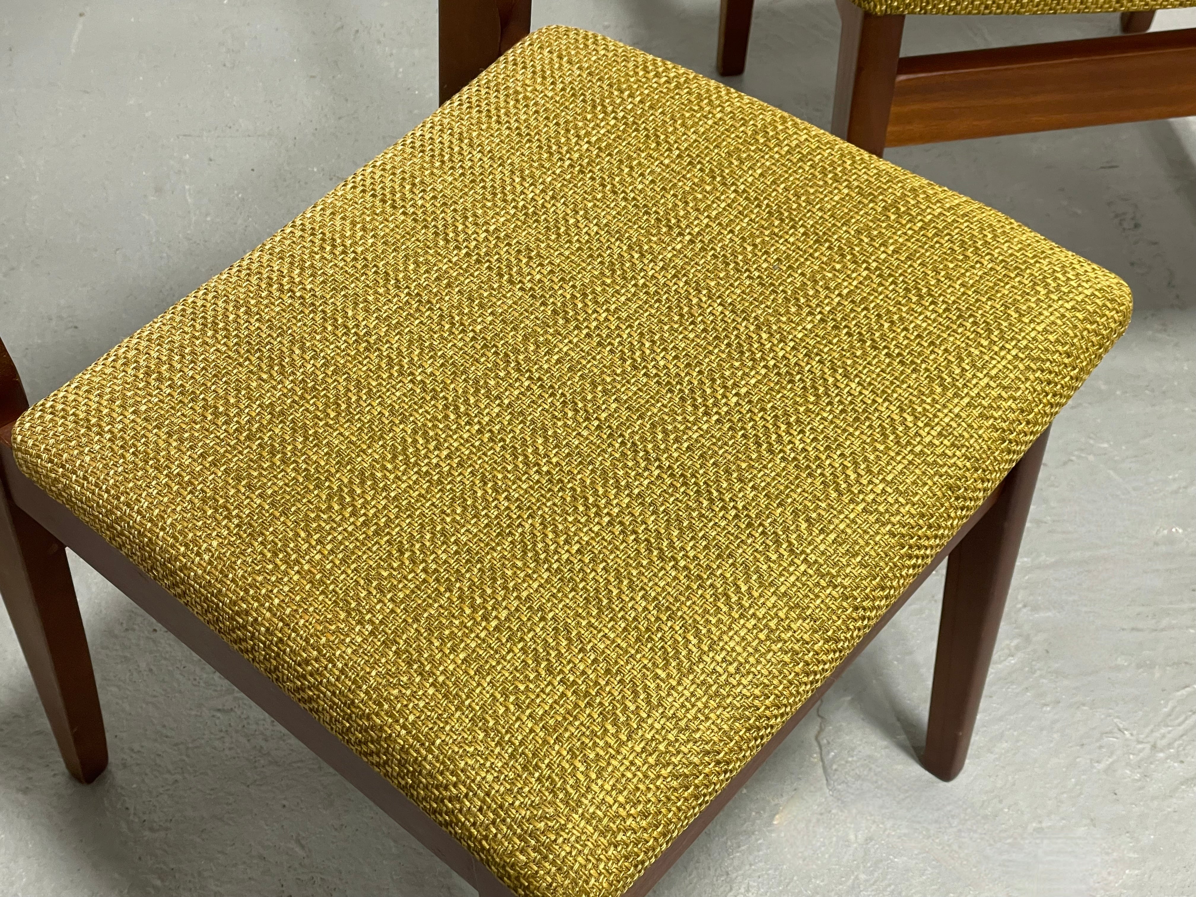 Set of four Walnut Mid Century Modern dining chairs crafted in Denmarkr, c. 1960's. Designed with timeless Scandinavian elegance, each chair features a beautifully curved backrest, rich walnut wood with striking natural wood grain, and vibrant mustard yellow-brown upholstery that contrasts perfectly with the warm wooden frames. The frames have been professionally cleaned and oiled, enhancing their rich color and durability. Solid, sturdy, and comfortable, these Danish Modern chairs are built to last—perfect for everyday dining while adding timeless Scandinavian style to your home.