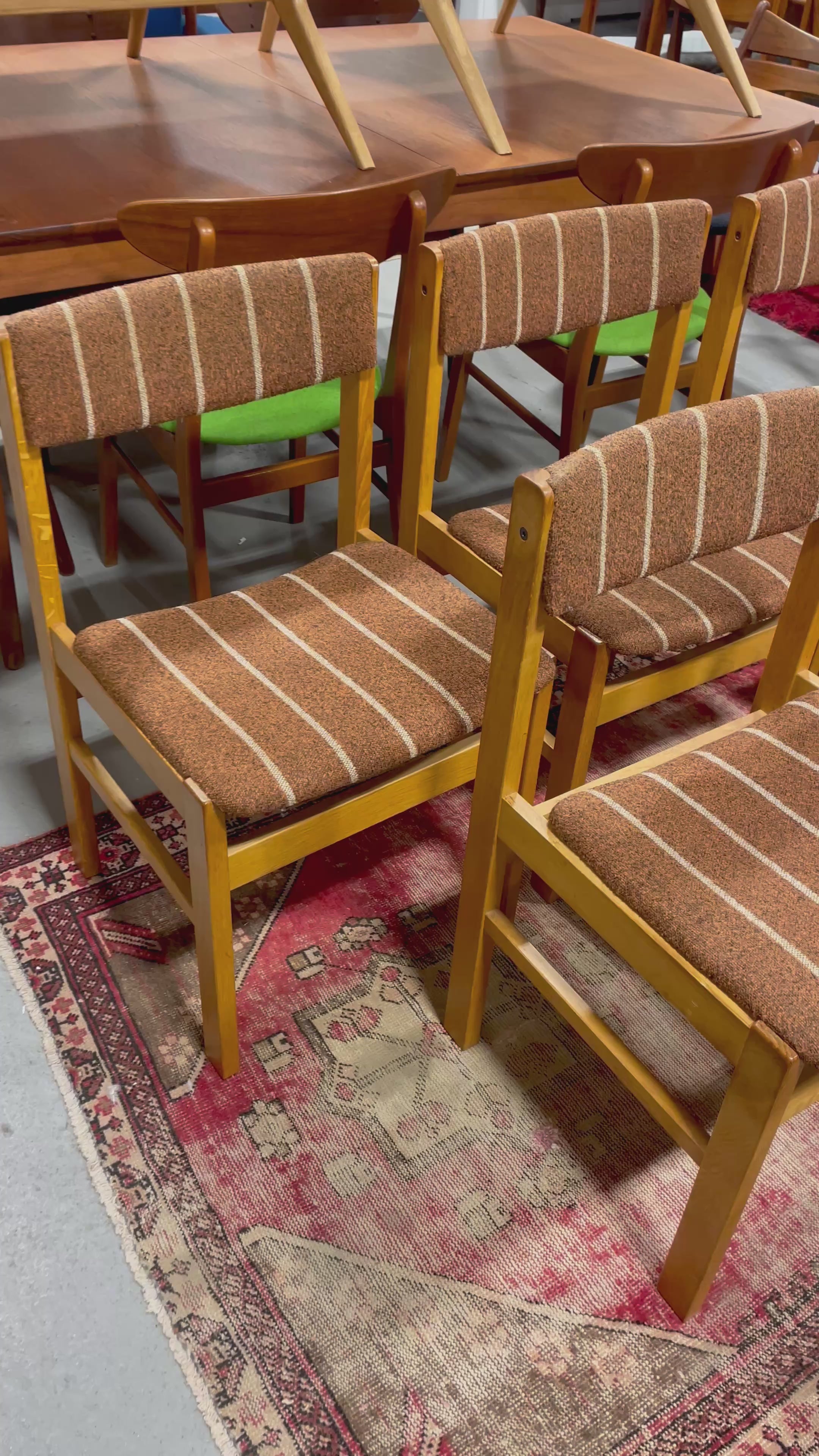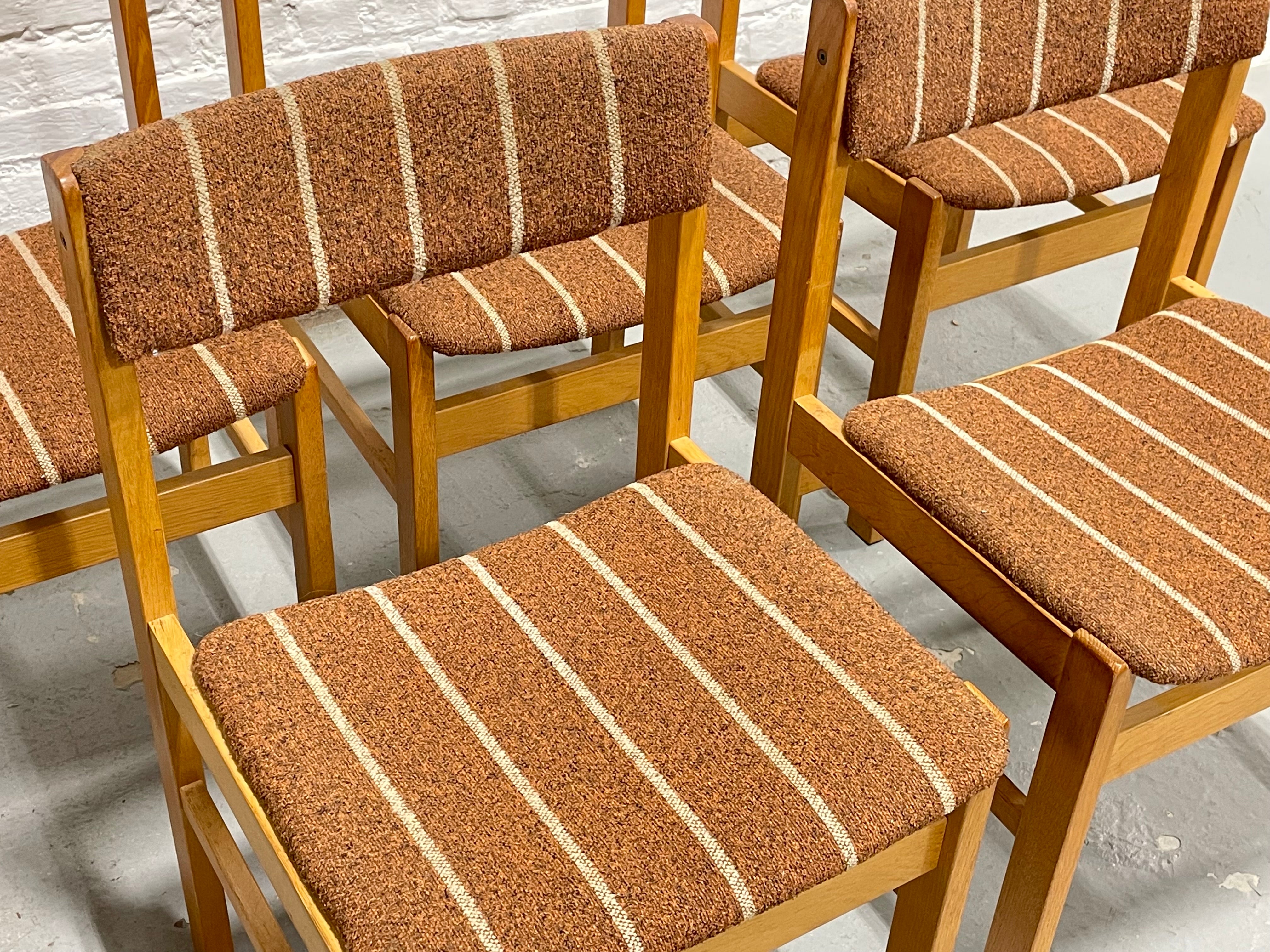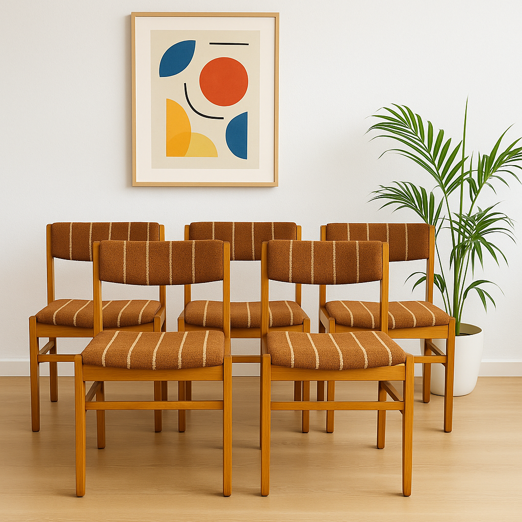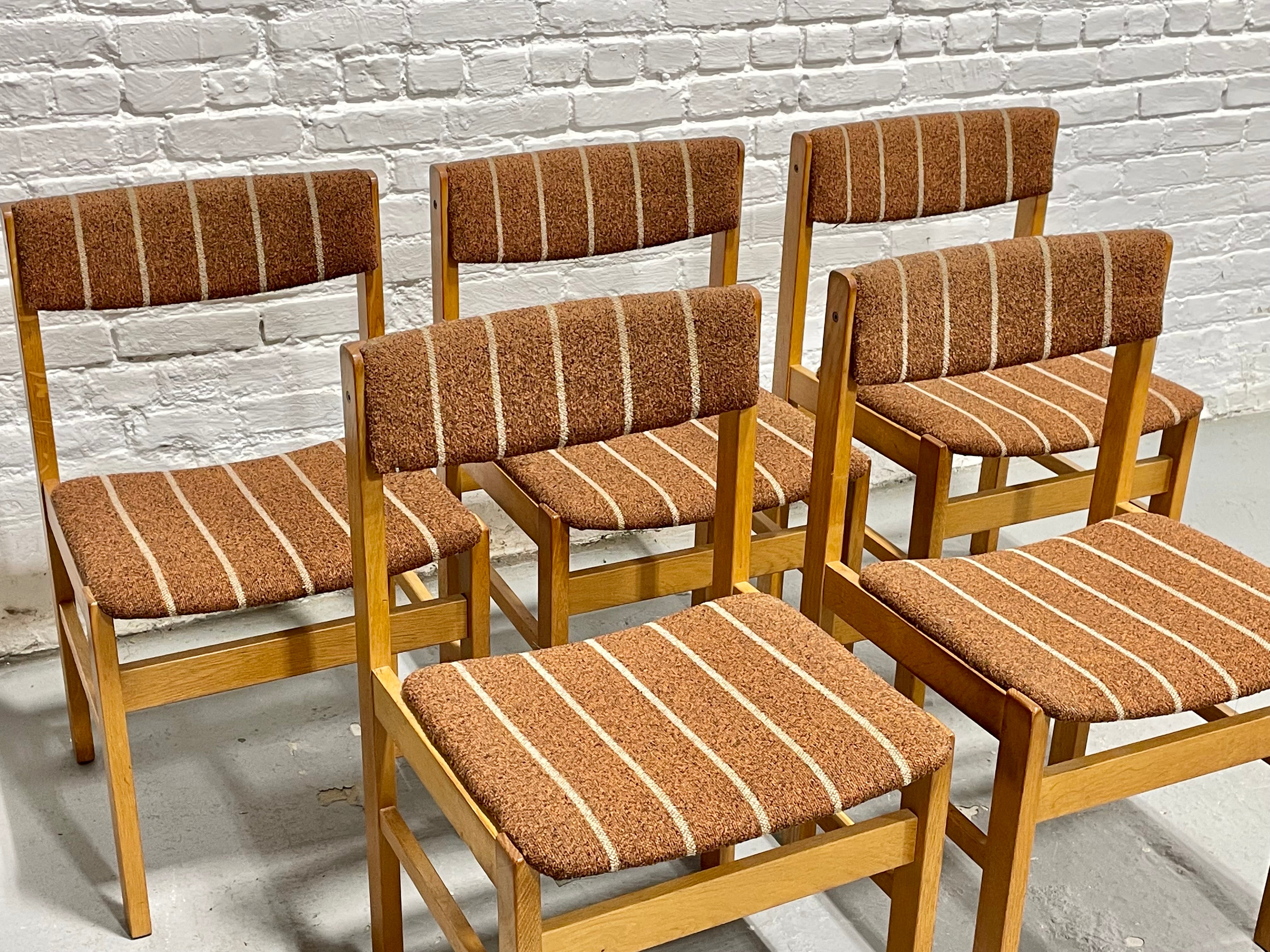 Set of five Mid Century Modern Dining Chairs featuring solid oak frames and original textured wool upholstery in a warm brown tone with cream pinstripe detailing. The clean profile, gently curved backrests, and joinery showcase the refined simplicity associated with Scandinavian design of the era. The seats are generously cushioned for comfort, and the low, wide back supports offer an ideal balance of ergonomics and minimalist form. The warm wood grain pairs beautifully with the upholstery and would work equally well with a teak, walnut or oak dining table. Lovely vintage condition with some age appropriate wear. Upholstery is clean and the frames are solid and structurally sound.