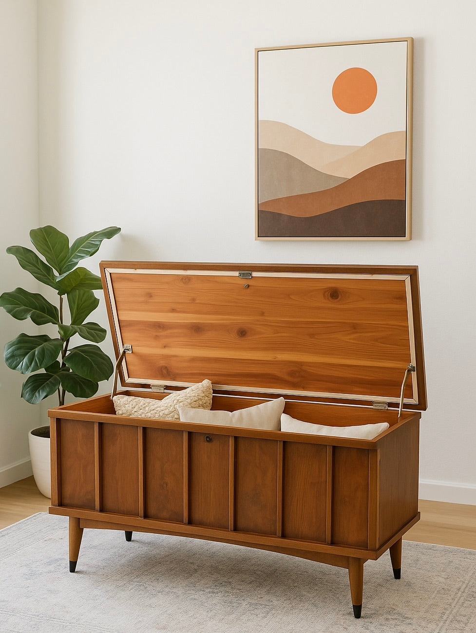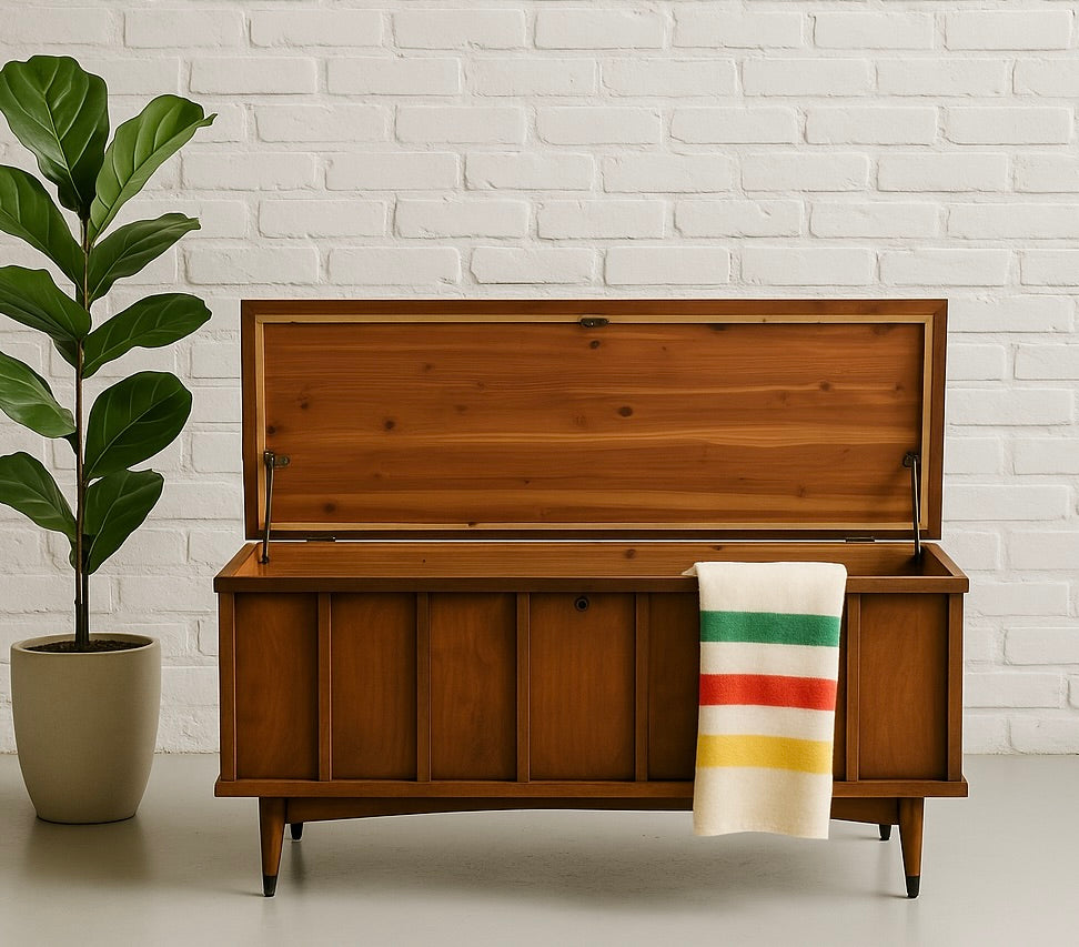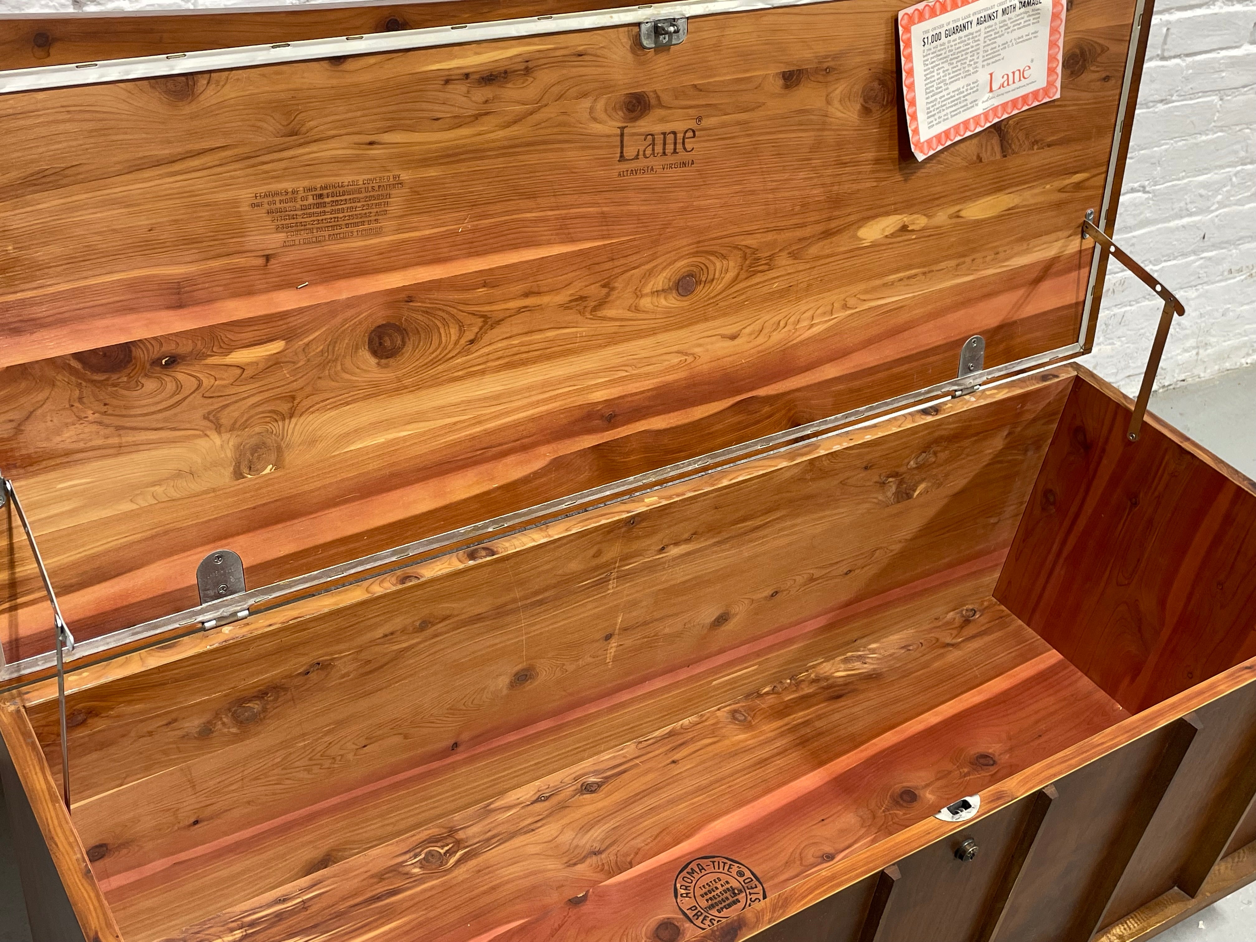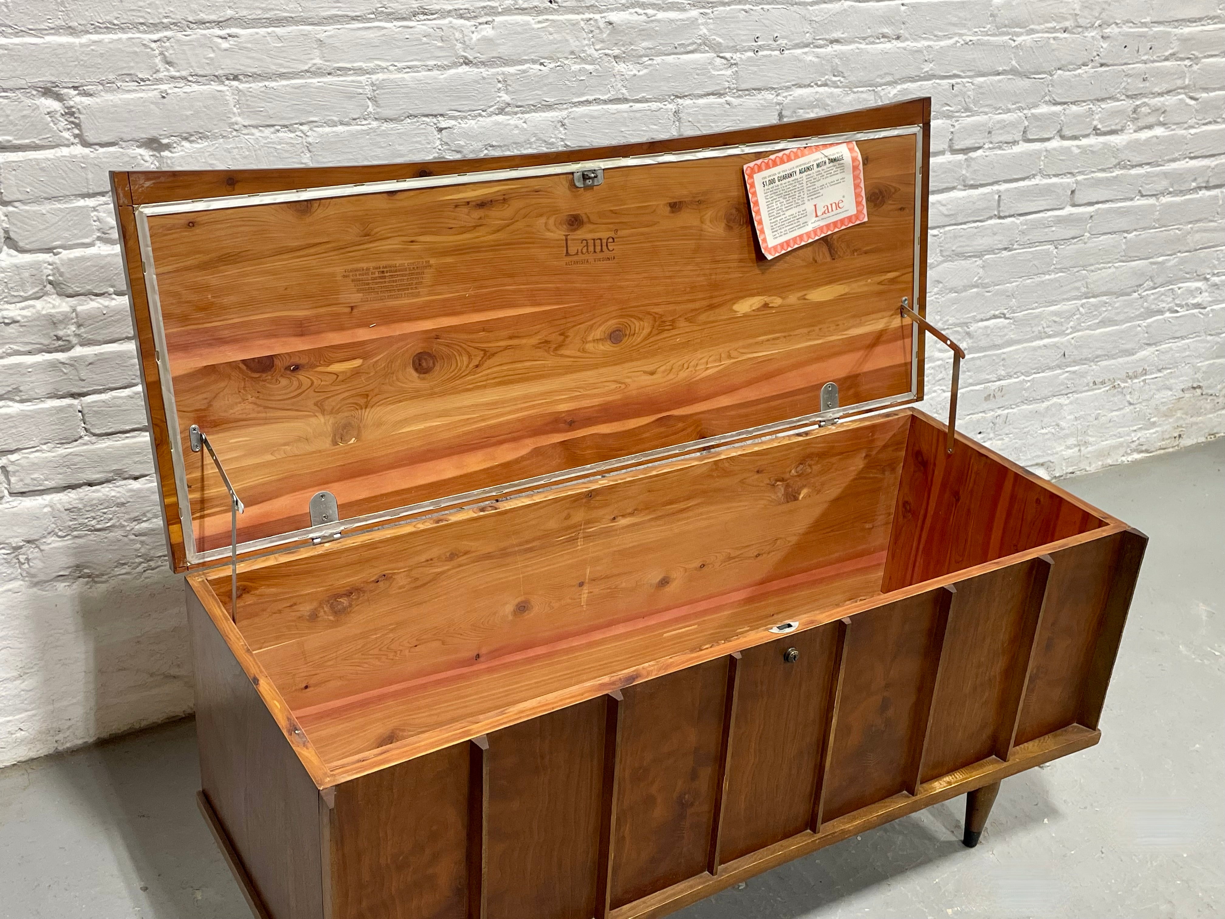 Mid Century Modern walnut cabinet / bench by Lane, c. 1960's. This chest is perfect for storing linens, blankets, off-season clothing or souvenirs. Perfect addition to any modern interior - place it by a window as a lovely seating and storage area or at the foot of a bed or even as a coffee table. Lovely woodgrains and plenty of storage space inside, complete with cute tapered legs. Despite being 60+ years old, this piece is in as lovely condition as the day it was built. This piece would make an amazing holiday gift!